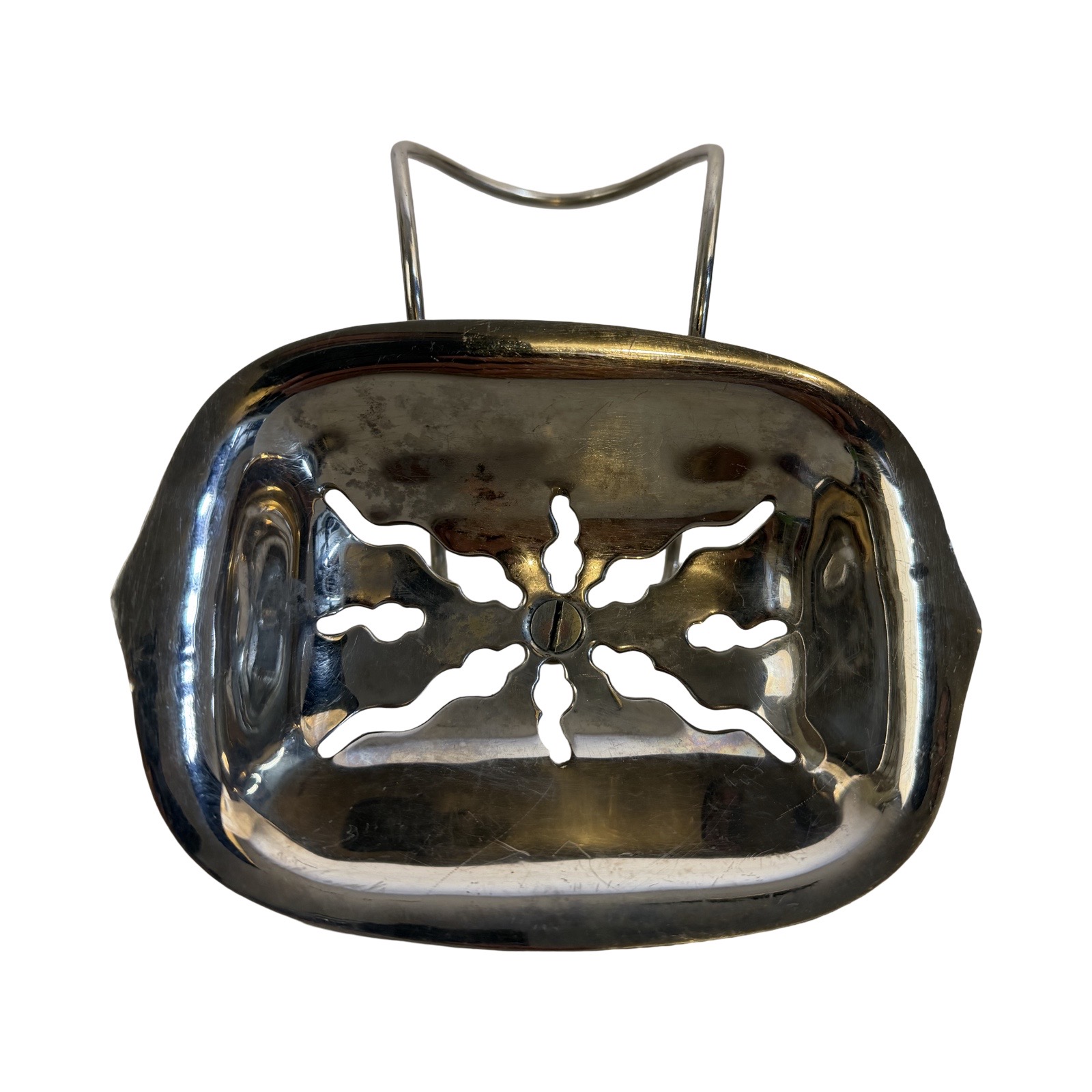 Second City Salvage is offering today this cute little over-the-rim claw foot tub soap or sponge holder that dates to around 1905. It was manufactured by Art Brass Co NY, but it not marked. The soap holder itself has a fancy cut out that tells me it is Art Brass. It is constructed of nickel plated brass and the plating is in excellent condition with little or no loss except for the bottom of the dish which is consistent with age. I did my best to capture this in the photos. Overall measurement is 6 1/4″w x 4″h x 7″ projection and will fit right over the rim of your claw foot tub. Dish will project 4″ over the rim of the tub and the dish itself is 6″w x 4 1/2″w. A great period addition to your vintage bathroom!