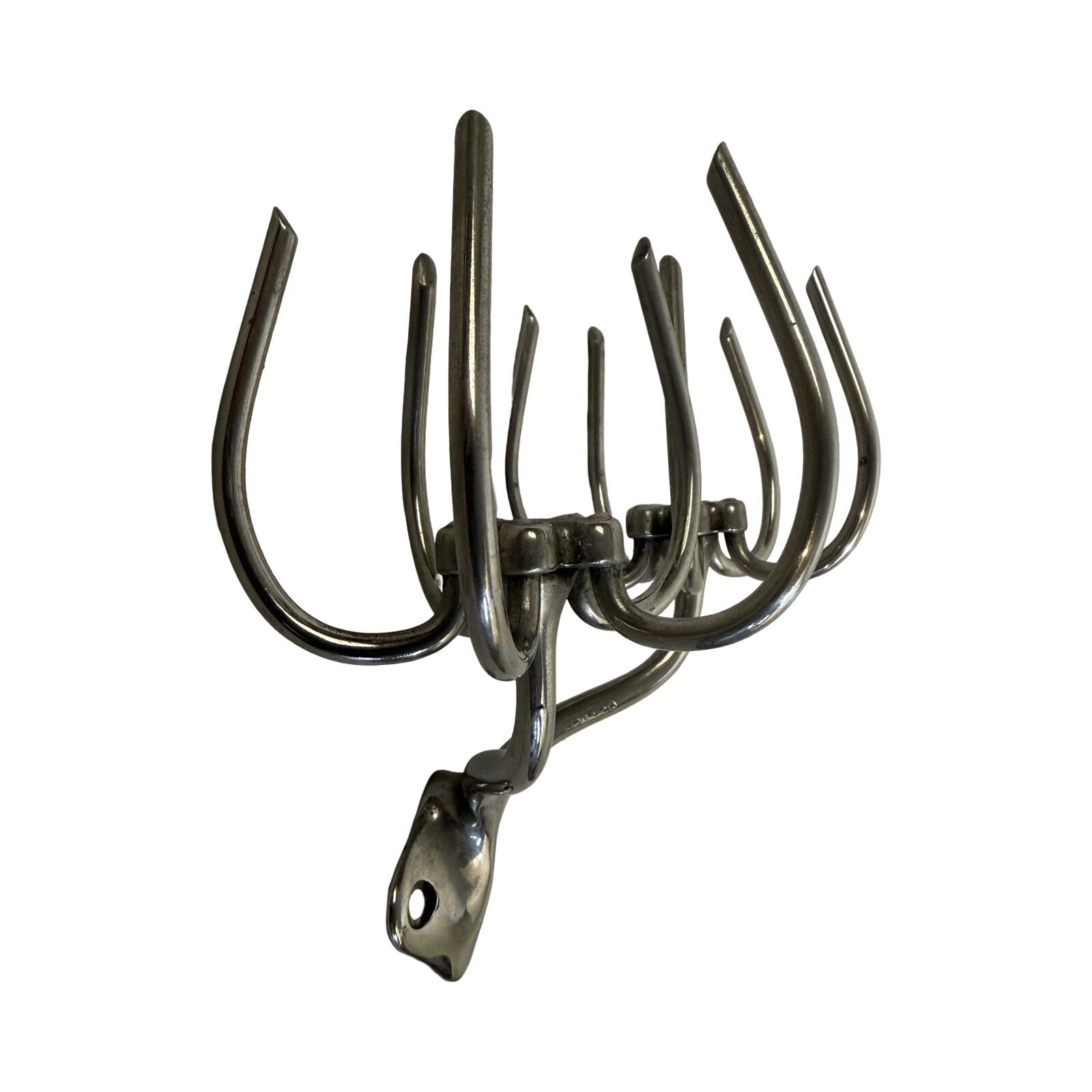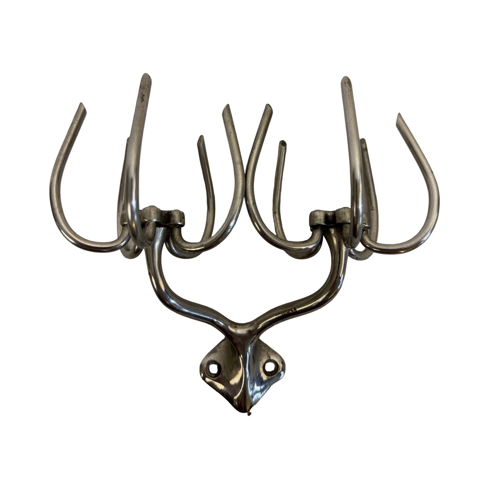 Second City Salvage is offering today this antique c1905 double wall mount prong cup/tumbler holder manufactured by Art Brass Co. NY/San-O-La in nickel plated Brass. It measures 7″w x 6″h and will project 4″ from the wall once installed. It is marked San-O-La on the arm. The nickel finish retains the original patina and has only been lightly cleaned, but there is no loss the the plating. It is in very nice condition. A rare piece of antique bathroom jewelry!
