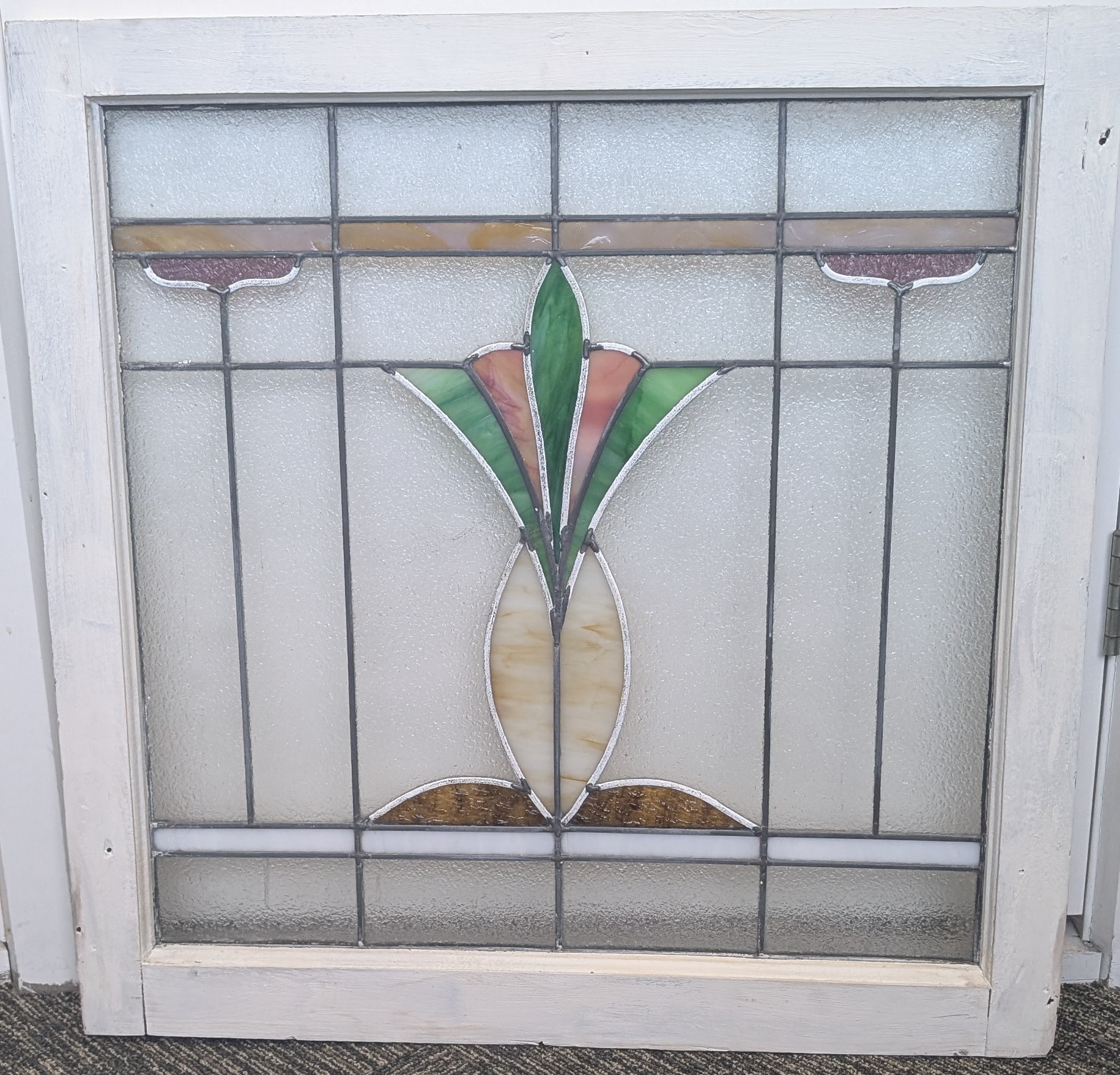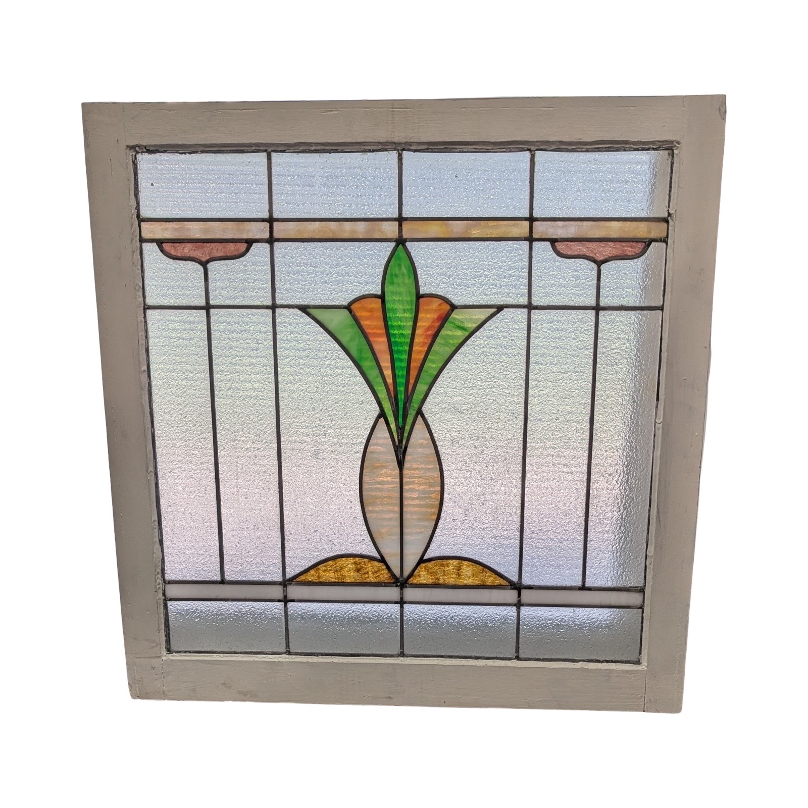 Second City Salvage is offering today this old c1915 piano window salvaged from a Chicago residence. Obscured pebble glass is original and is free of any cracks and the lead caming remains strong. Original frame is painted white. Pretty center tulip pattern in shades of pink and green with an opalescent glass stem & top & bottom border and amber & orange glass accents. No cracks. It literally glows when the light hits it! Overall measurement is 28″w x 28″h and the measurement for the glass only is roughly 23″w x 23″h. I have three of them and they are priced per window, but I will offer a discount if multiples are purchased by the same buyer.