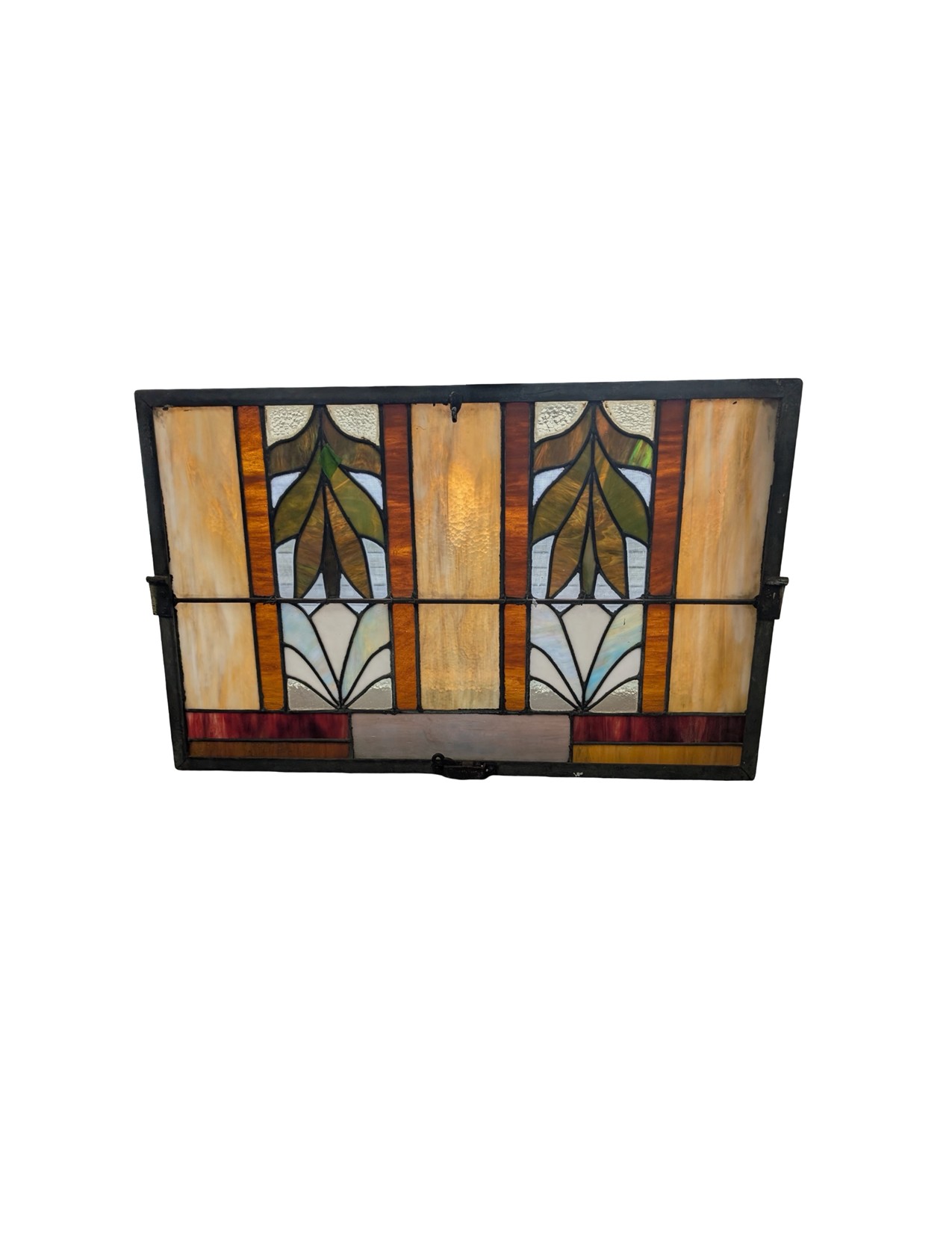 Second City Salvage is offering today this old c1915 Craftsman era window that we believe was salvaged from a church in the Ravenswood neighborhood in Chicago, IL. We have no provenance on that end. I have two of these and both of them are in mint condition with no cracks to the glass. The frames are metal and the lead caming is strong. Each one measures 28″w x 18″. Great deep colors with a smattering of clear glass accents, but they are obscured opalescent glass for the most part. They are priced individually, but will offer a discount if both pieces are purchased by the same buyer.