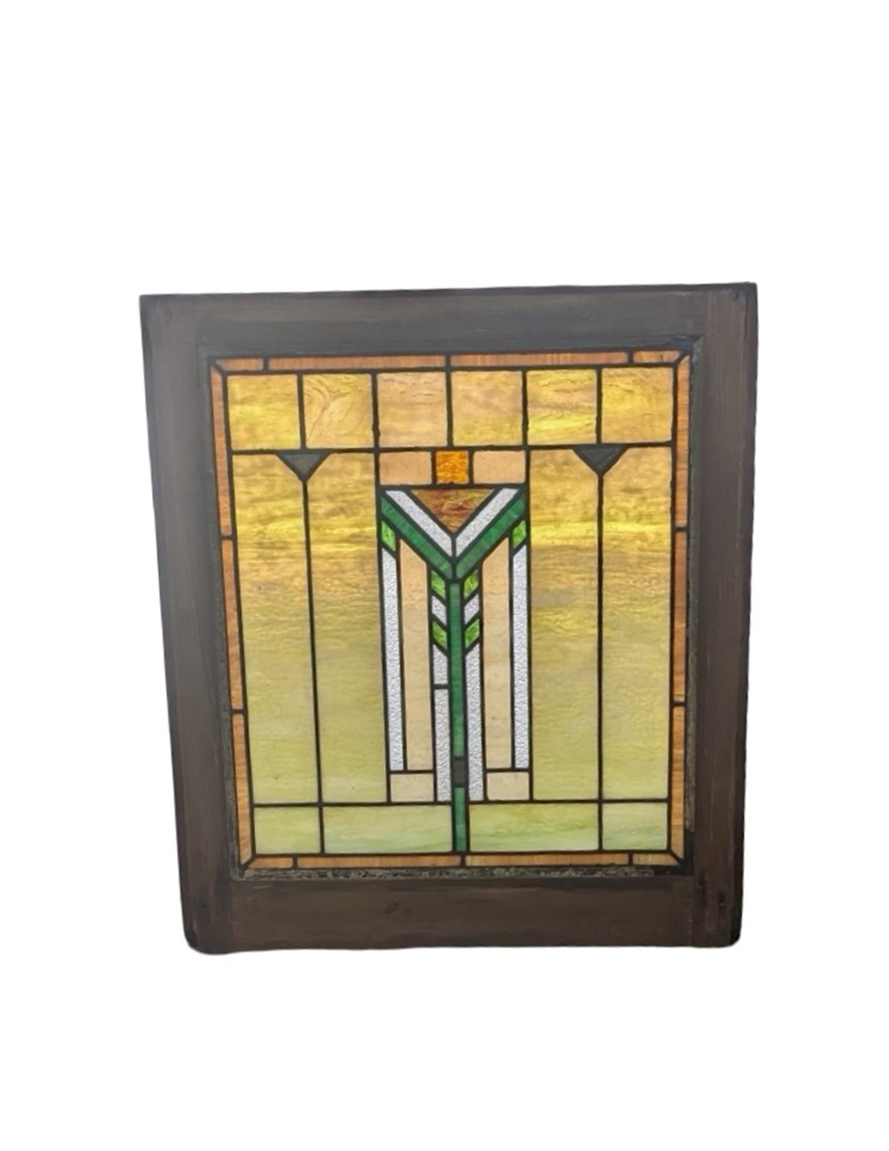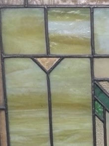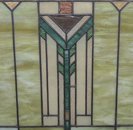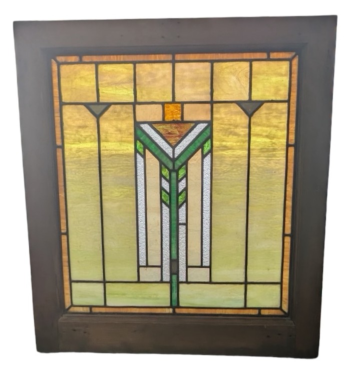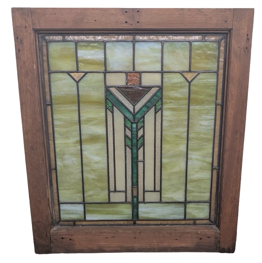 Second City Salvage is offering today this old c1910 Prairie School piano window salvaged from an Oak Park, IL residence (possibly Frank Lloyd Wright designed, but we have no provenance on that end). All glass is original and undamaged. Original frame has the original finish and remains unpainted. Center chevron pattern in shades of green and amber surrounded by creamy opalescent pieces with an amber border really make this piece shine! No cracks. It literally glows when the light hits it! Overall measurement is 22″w x 24″h and the measurement for the glass only is roughly 17″w x 19 1/2″h.