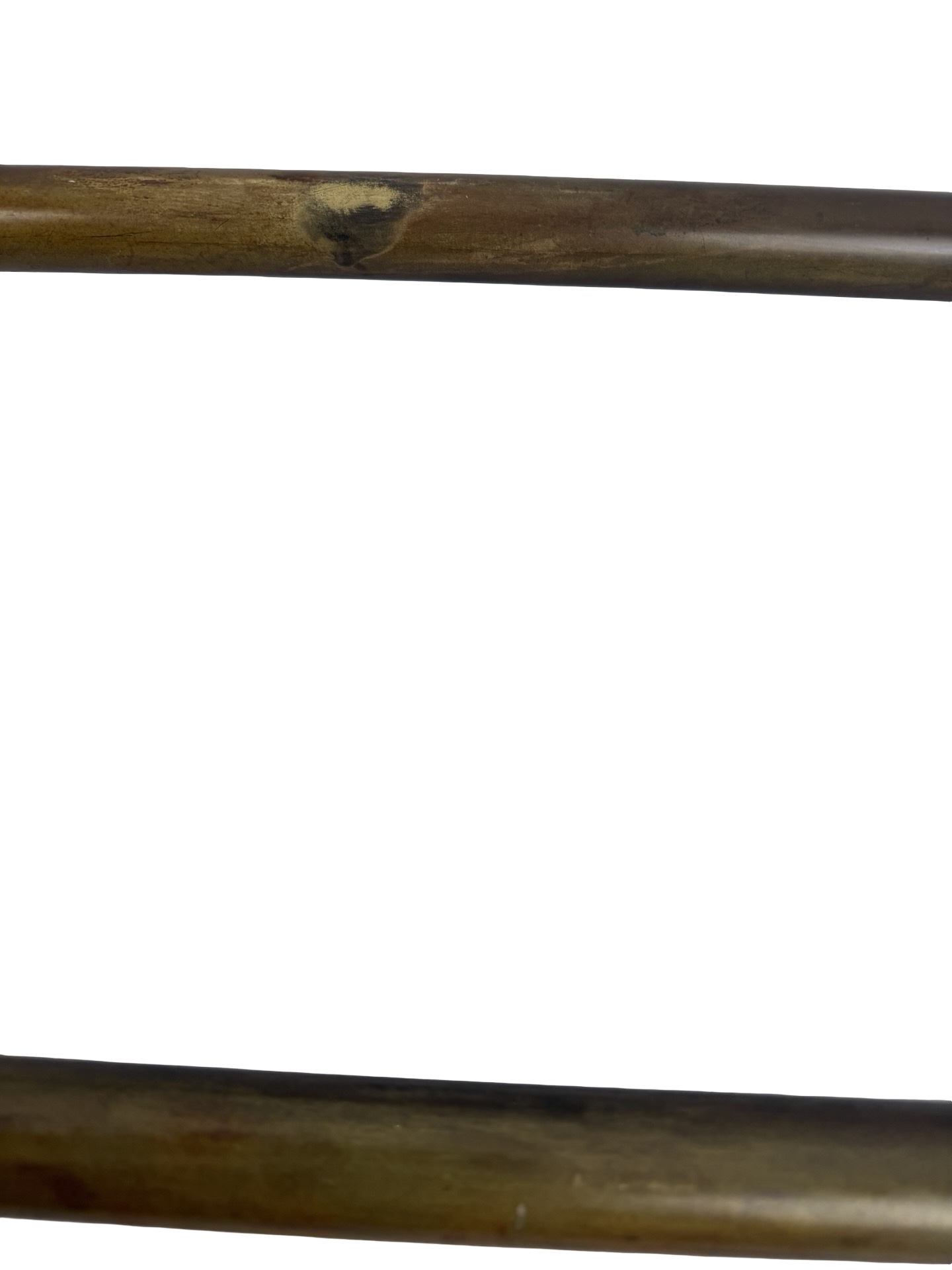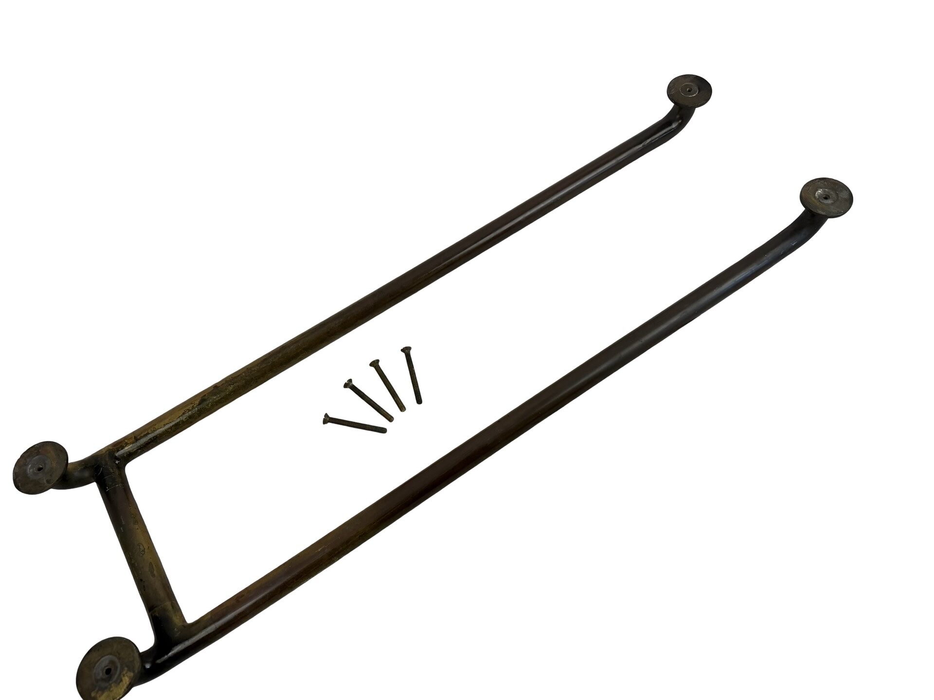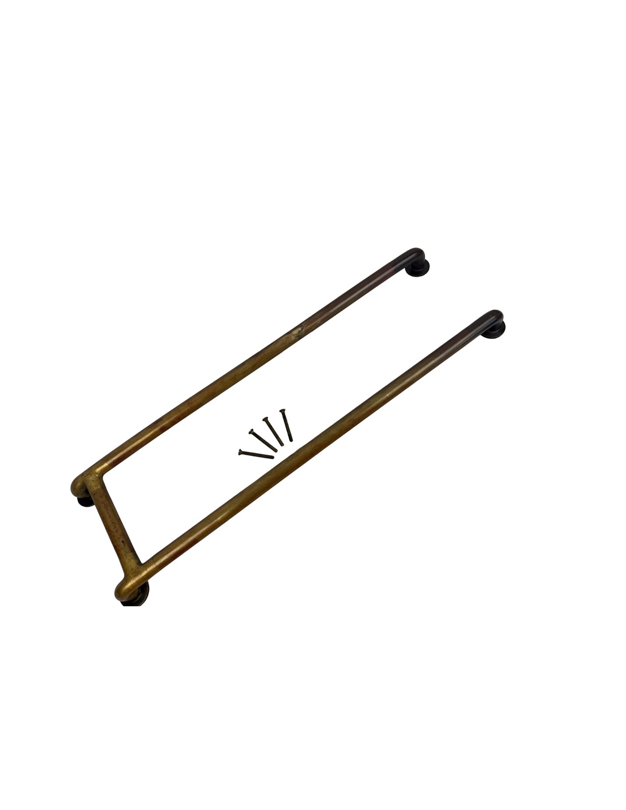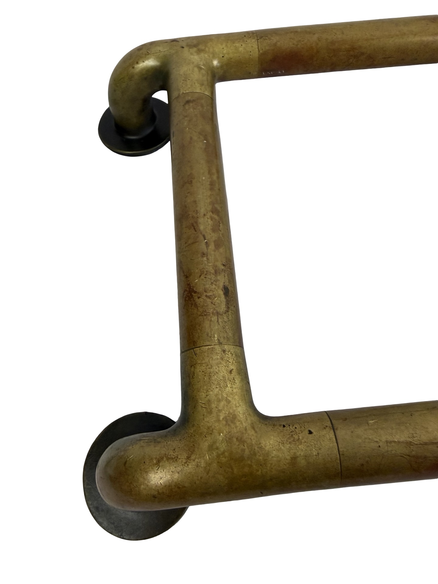 Second City Salvage is offering today this antique c1910 solid brass push or pull bar that was salvaged from a commercial building in the Twin Cities. It is solid brass and heavy and probably came off an entry door to the building and retains its original patina – it has only been lightly cleaned. It measures 32 1/2″ long x 9″h and will project 2 1/2″ from the surface once installed. We also have the four 2 5/8″ screws needed for mounting. Be creative with this piece! I think this could also be used as a towel bar in a bathroom or kitchen.