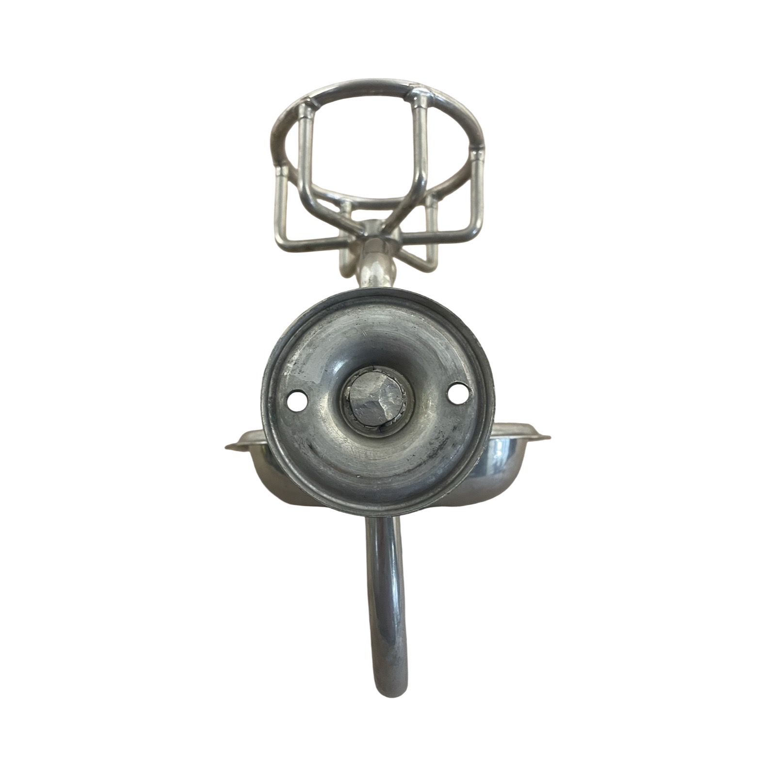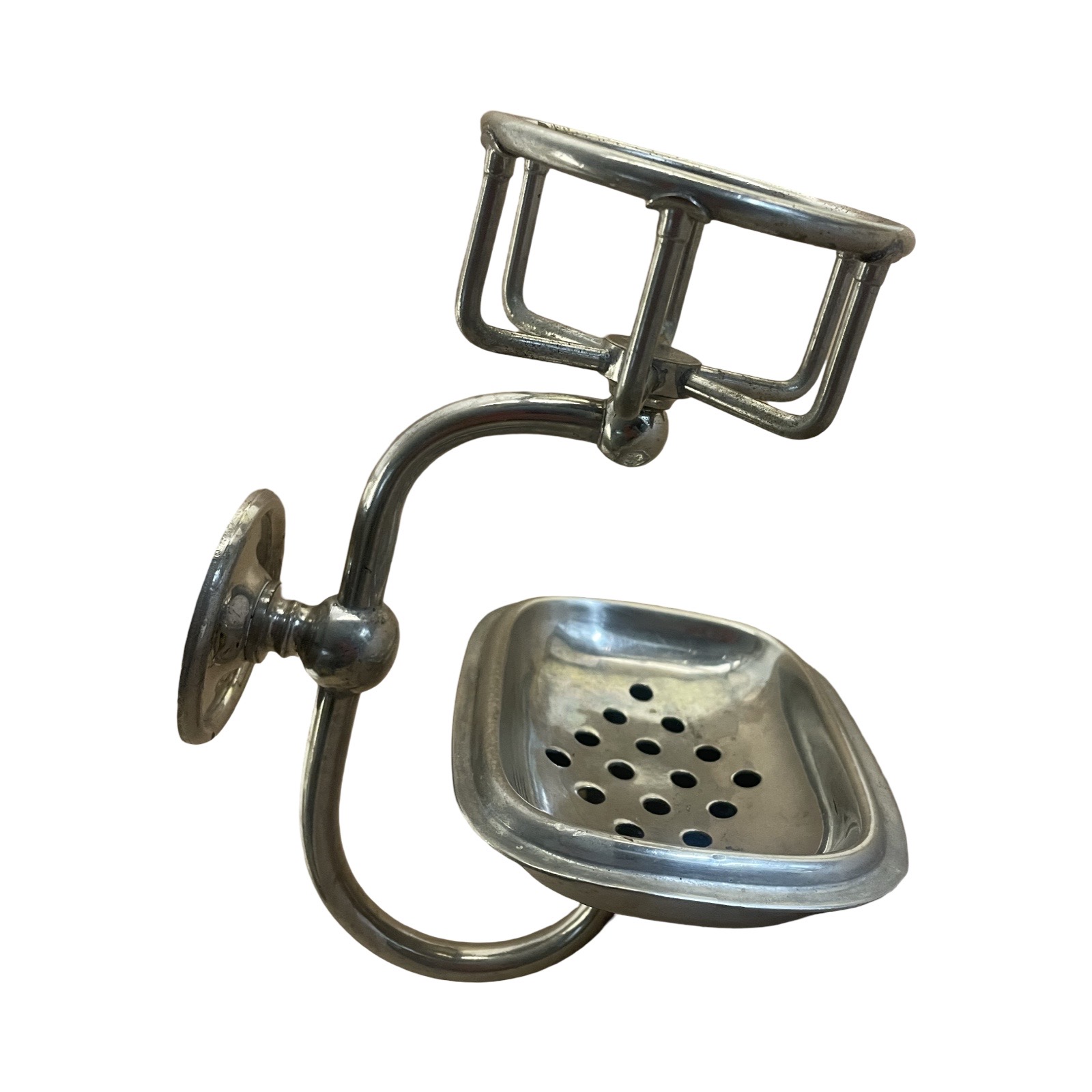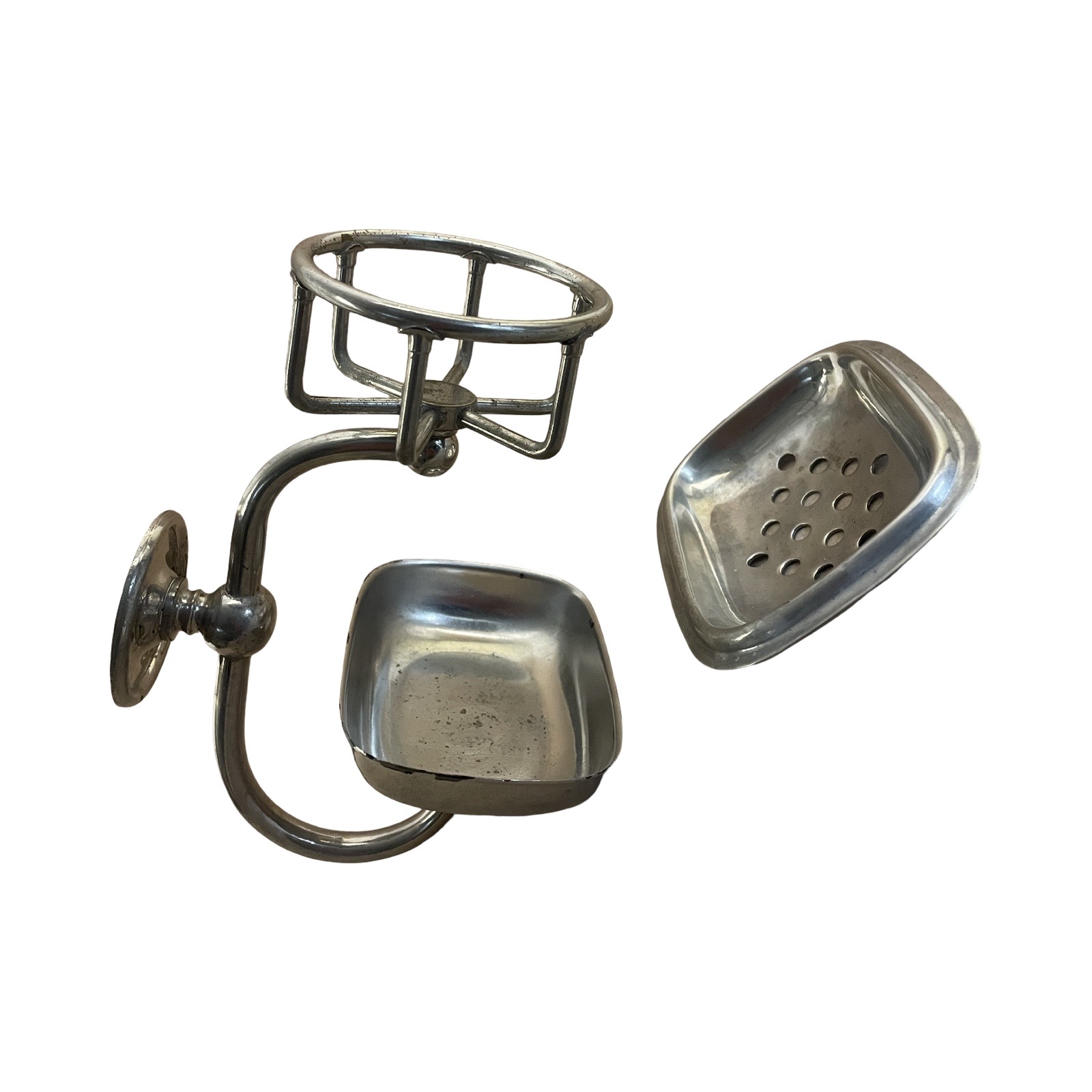 Second City Salvage is offering today this antique nickel plated brass tumbler and soap dish/holder probably from around the early part of the 20th century c1905. It is unmarked, but could have been made by any one of the bathroom accessory manufacturers from the early 20th century – not all companies marked their pieces. The nickel plating for the most part is in exceptional condition except for a small part around the edge of the soap dish where there is some loss (last photo). This is an insignificant flaw and is pretty much covered up by the removable soap dish. It’s not notable, but I have to mention. Overall measurement is 5″w x 8″h and will project 6″ from the wall once installed. It’s a heavy piece and would be a great addition to your vintage or Victorian era bathroom!