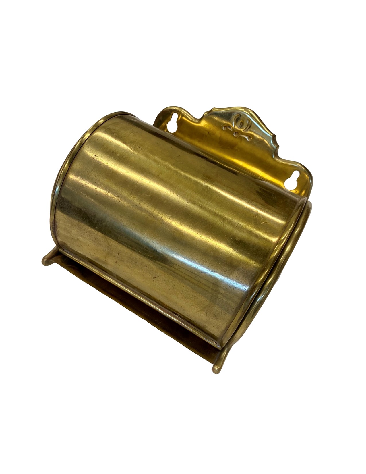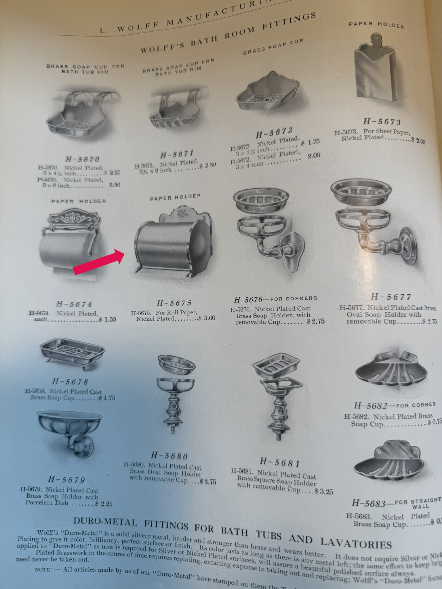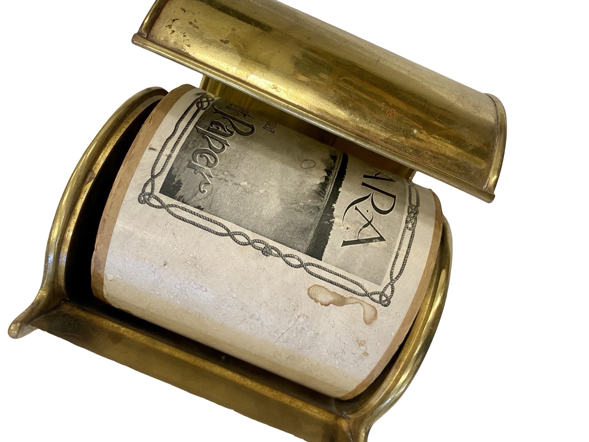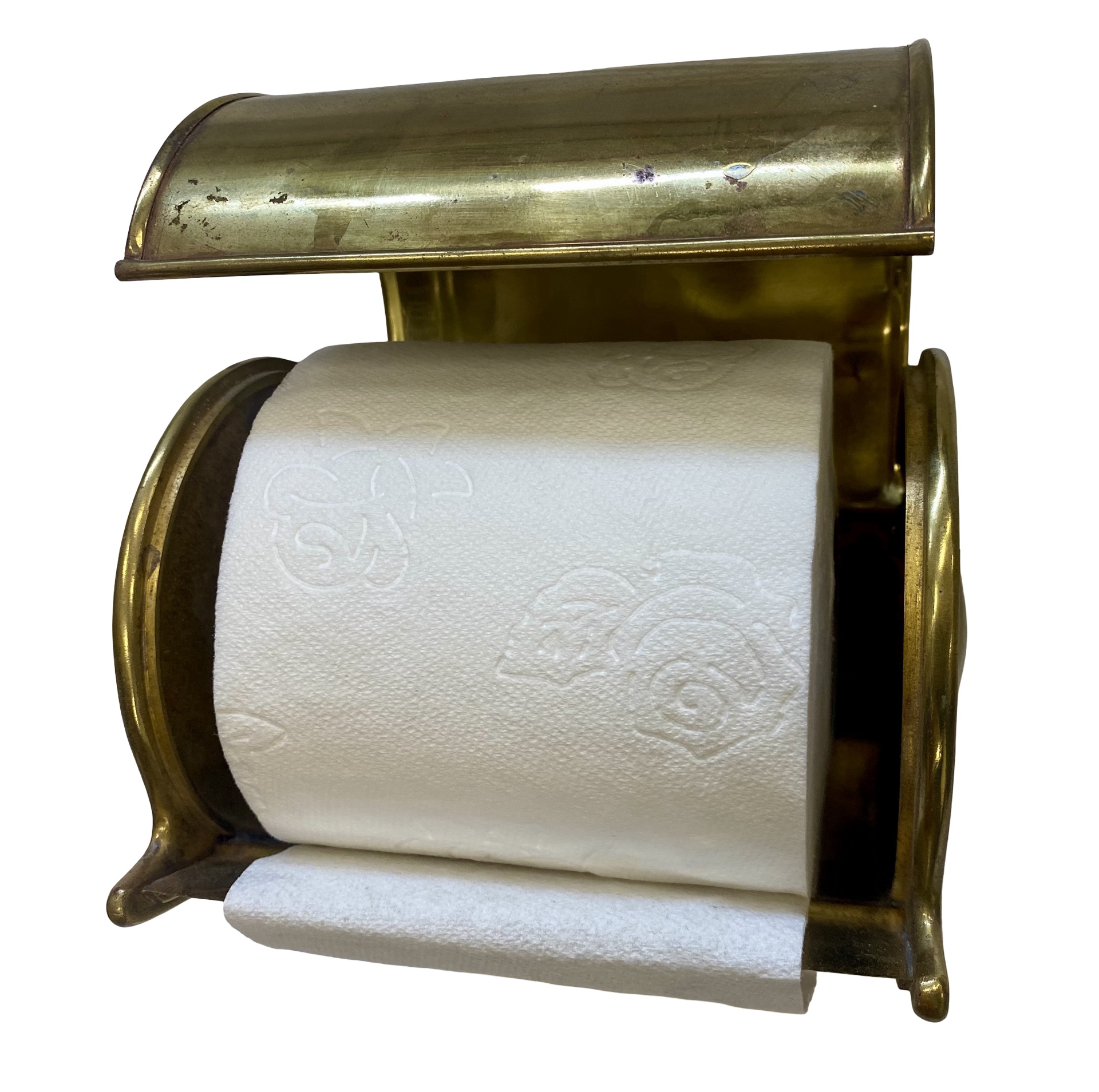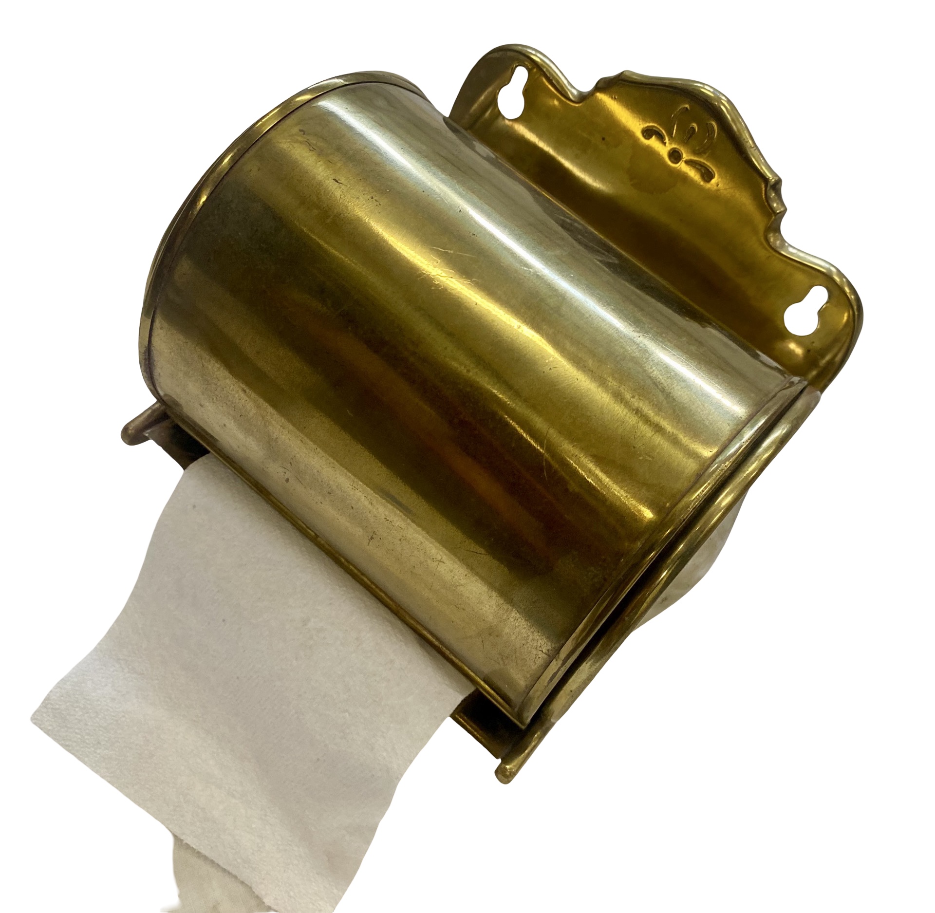 Second City Salvage is offering today this antique c1908 rare brass can toilet paper holder manufactured by L. Wolff Manufacturing Co., Chicago. It is unmarked, but it shown in the 1908 Wolff catalog. It is complete and original. This holder does not fit a modern double roll of toilet paper, but a single roll will work and after a bit of looking around, I found that you can buy single rolls on line on Amazon. (who knew??) It measures 6”w x 5 1/2”h and will project 4 1/2” from the wall once installed. A true collector of vintage bathroom accessories will covet this rare piece! For the discriminating collector, we can include an original unopened roll of toilet paper shown in the last photo for $100.