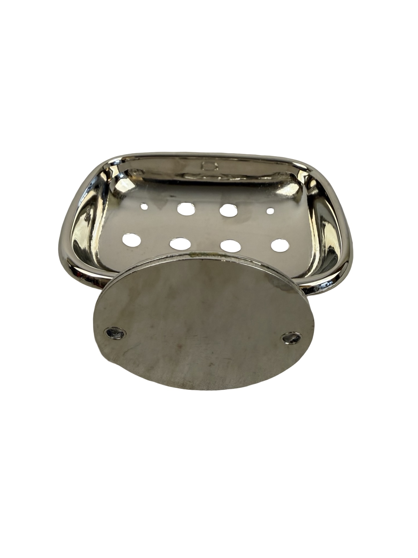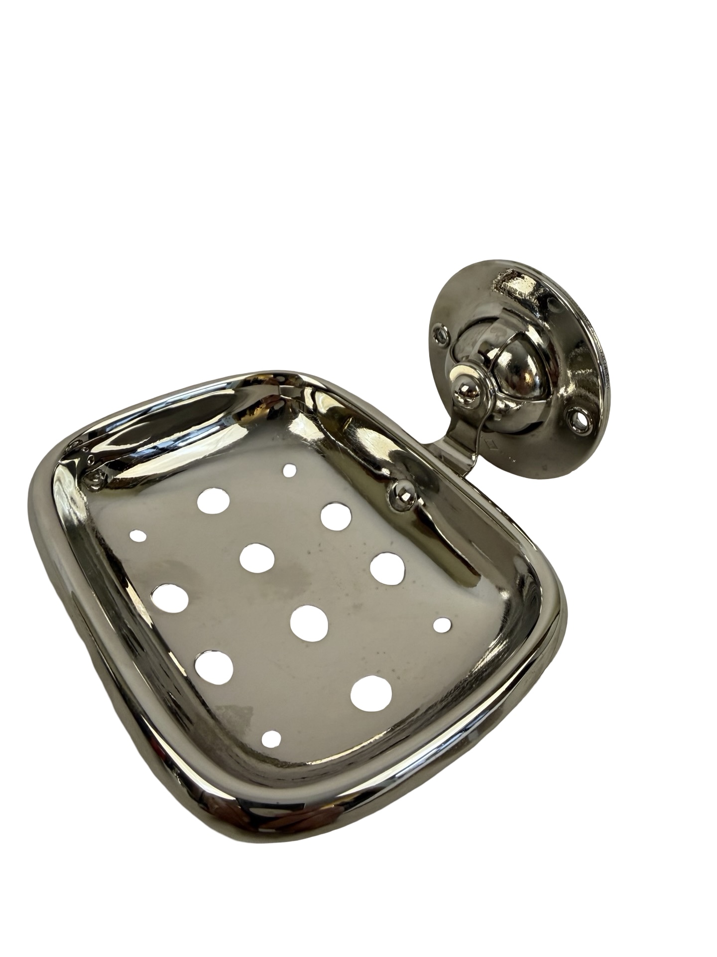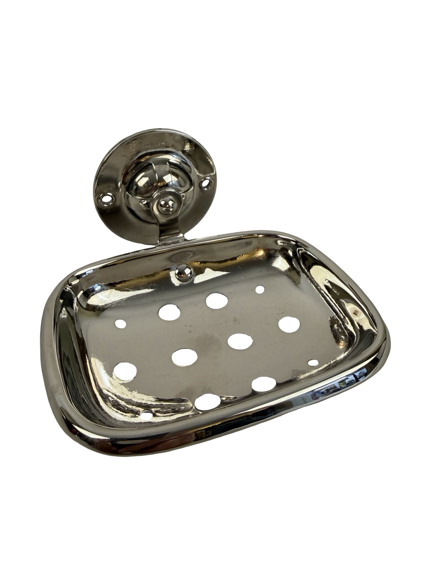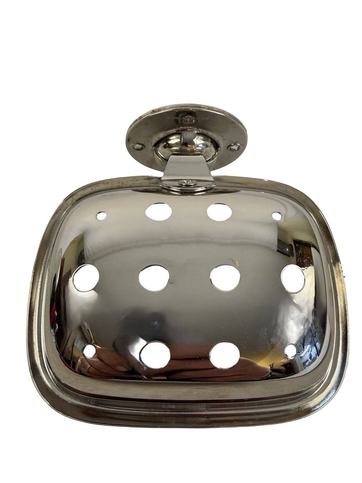 Second City Salvage is offering today this wall mount soap dish/holder fabricated of nickel plated solid brass that probably dates to the 1930s. It measures 4 ½”w x 2 ½”h and will project 4 ½” from the wall once installed. It is marked “SOLID BRASS MADE IN USA.” We had this piece completely restored and replated in polished nickel mainly because I thought the mounting piece was super interesting (and the price reflects that)! A great piece to add to your vintage bathroom!