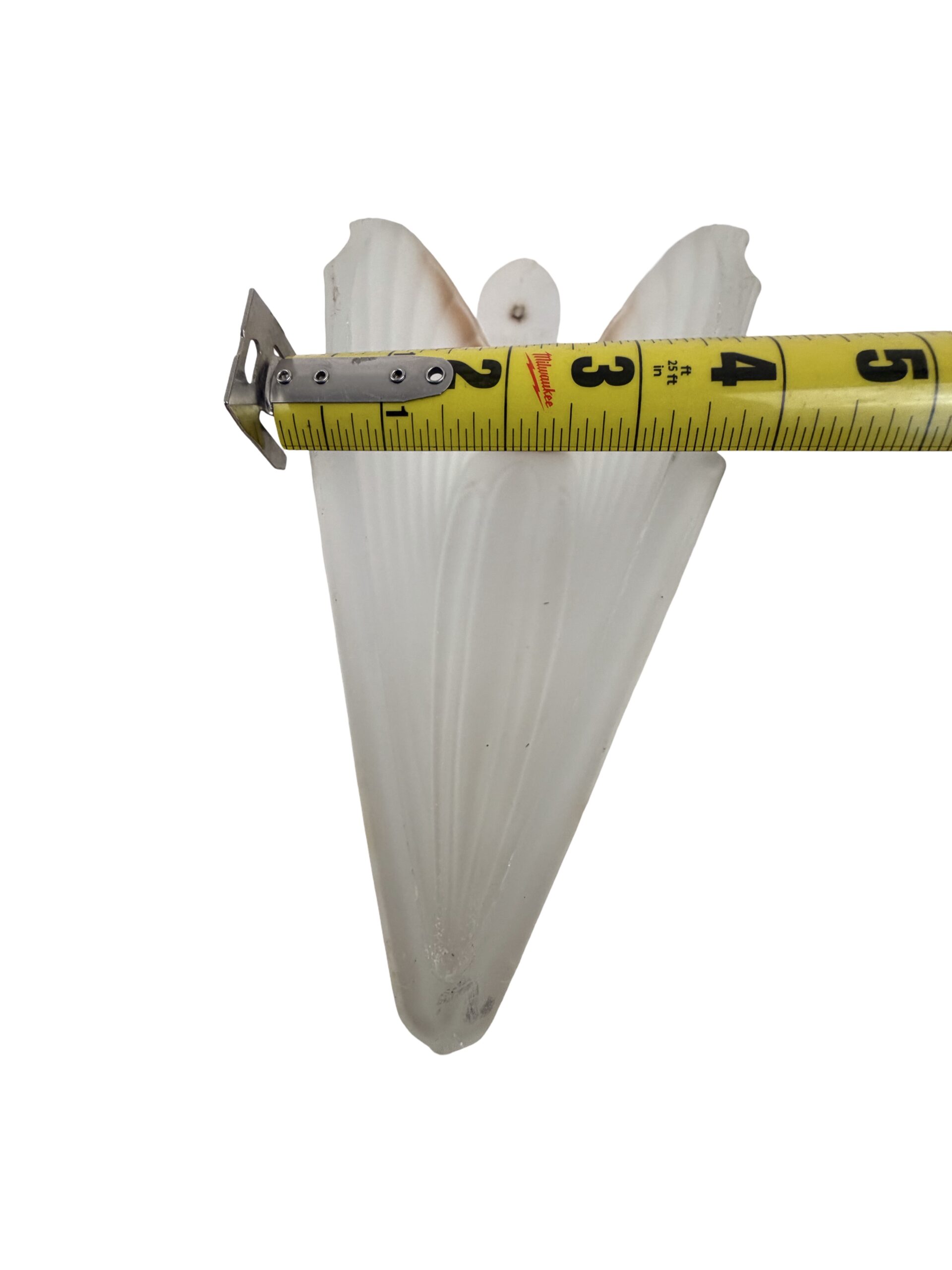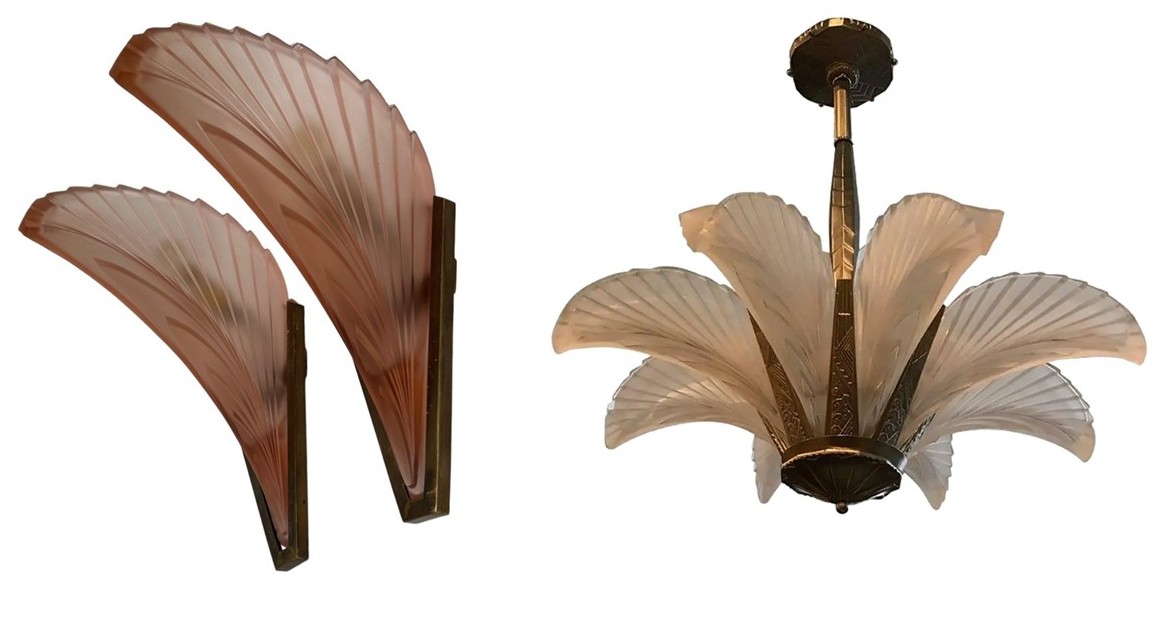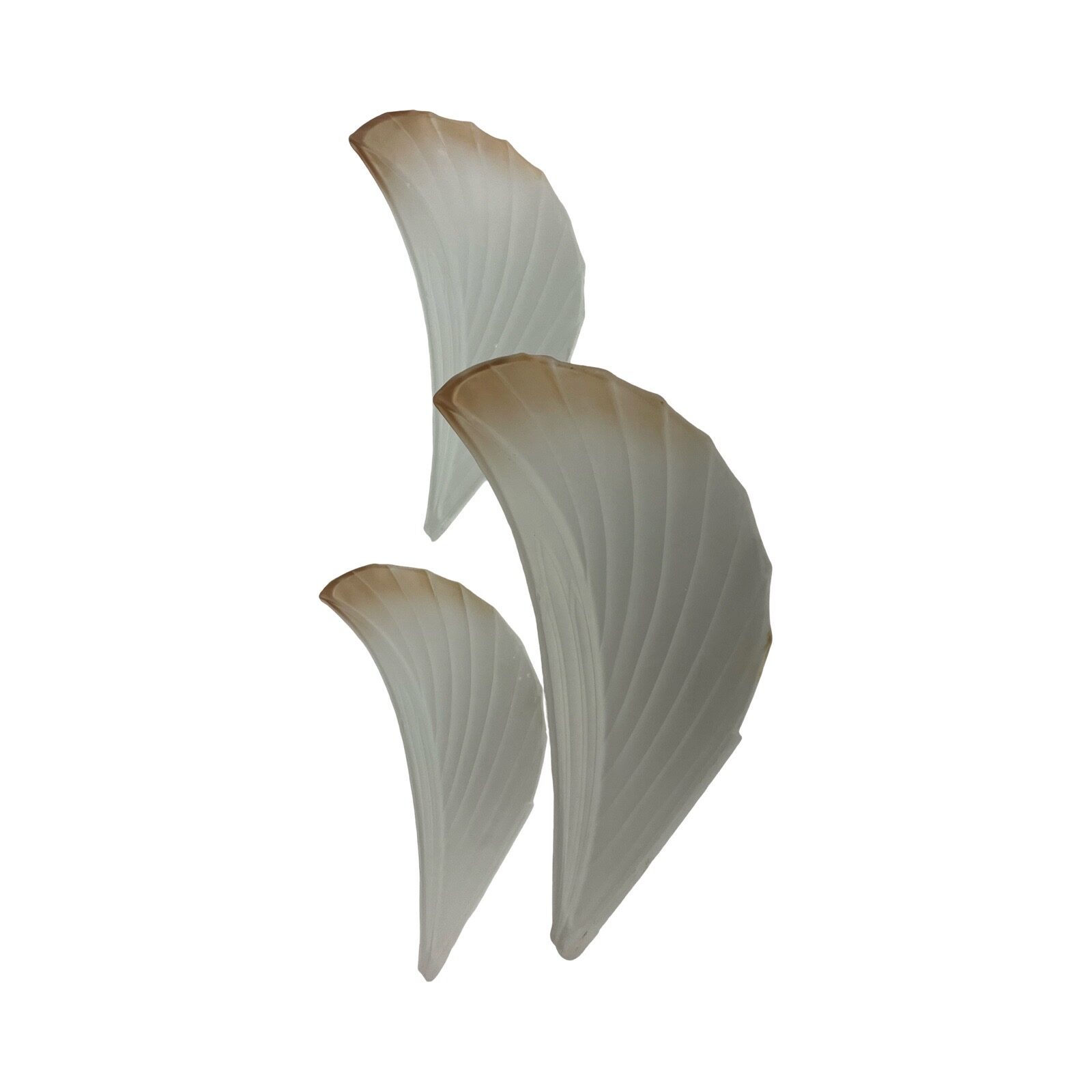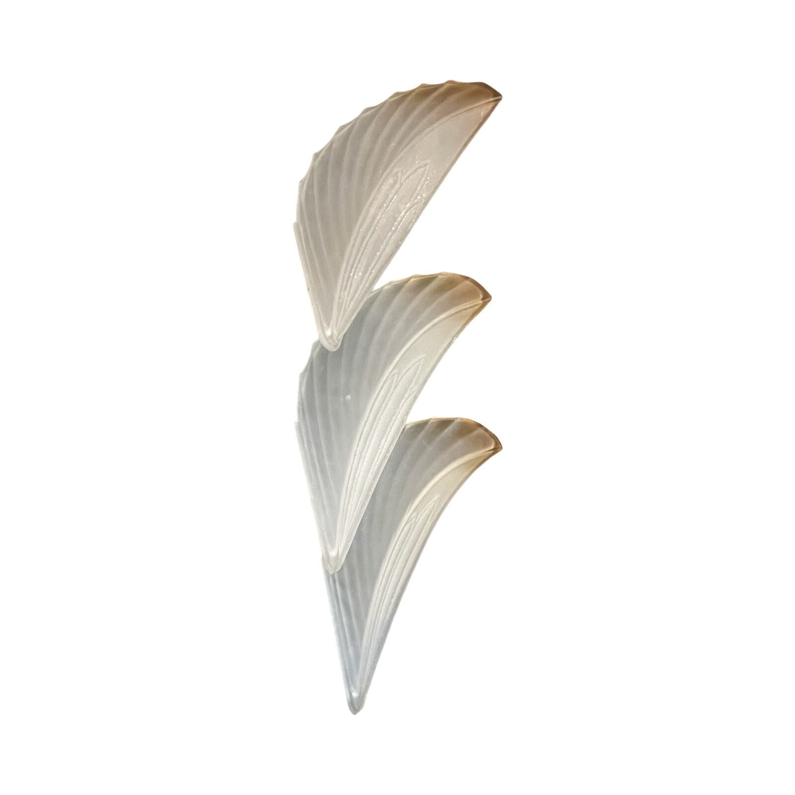 Second City Salvage is offering today this heavy, thick feather glass replacement slip shade for either a chandelier or sconce. This shade is extremely rare and hard to find and could be attributed to Verrerie Belge of Belgium or could be French. They are not marked. The color is a plain satin or frosted glass with brown tips. Two are in mint condition and are free of any cracks or chips. One has a small chip to an outside edge as shown in the second to last photo. I have three of these and they are priced individually. I will offer a discount if all three shades are purchased by the same buyer. The last photo shows a variation of the shade in a salmon color shown on either a chandelier or a wall sconce just to show how these are used.