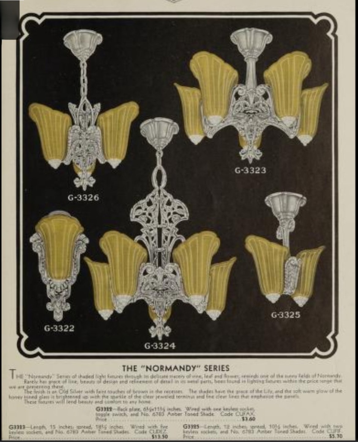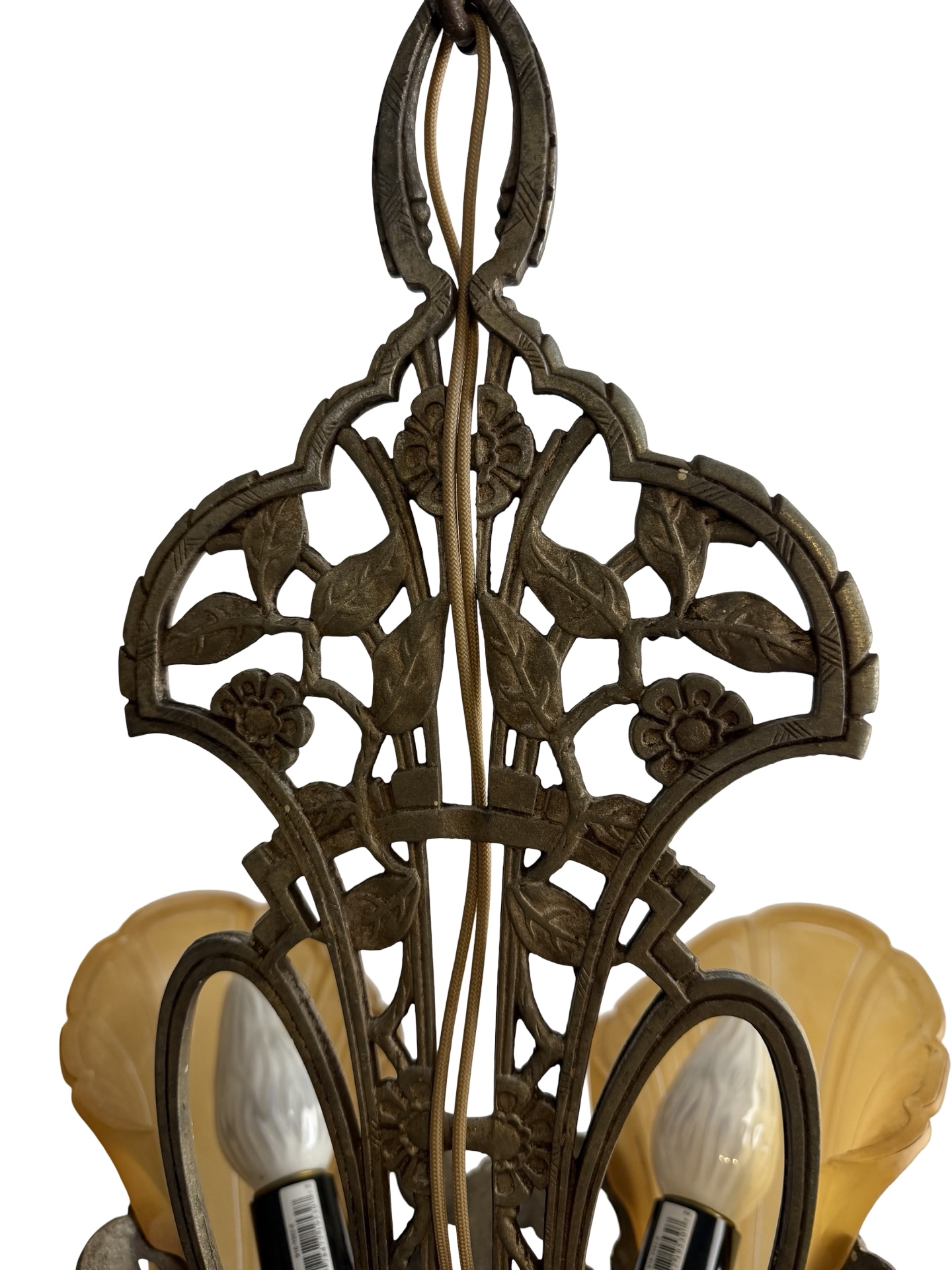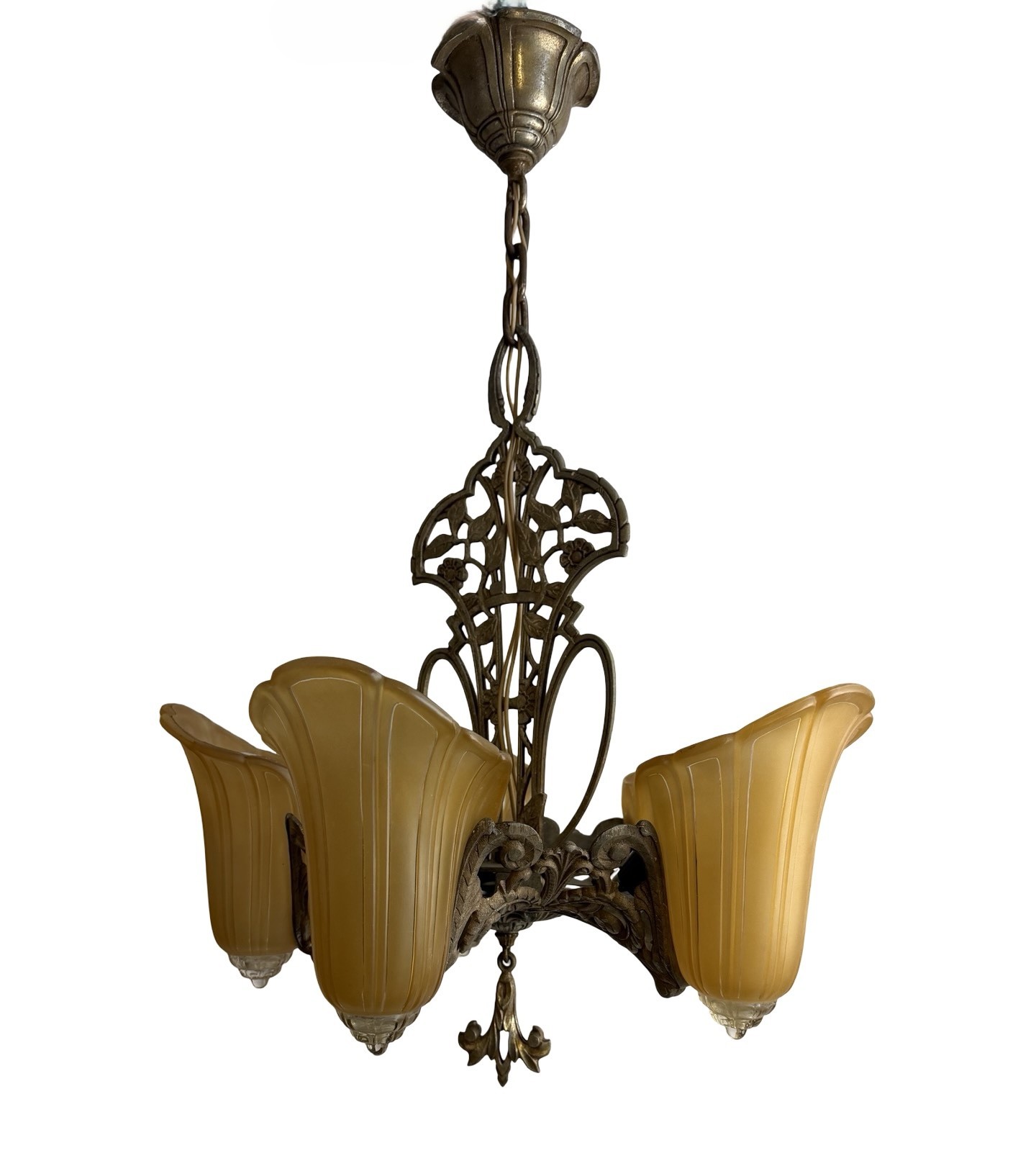 Second City Salvage is offering today this rare chandelier by Gross Chandelier Co. from their Normandy line c1920s. The frame and stem of the light is ornately cast aluminum with a pattern of vines and flowers and has the original burnished finish. It has only been lightly cleaned. Ceiling canopy is original and measures 5” dia. x 3”h. Overall measurement of the chandelier is 19”w and it will drop 27” from the ceiling once installed. It has been restored from head to toe with new sockets and the wiring has been updated with period correct cloth wiring. It will also come with a modern cross bar needed for installation. The shades are original and are amber satin glass with clear tips. The shades are all in what I would consider to be excellent condition. Three are in mint condition. Any chips to the backs on two of them are minimal and would be hidden once placed on the light fixture. One has a small chip to the outer edge that is not noticeable unless scrutinized up close. Each shade measures 5”w x 8”h x 4 1/2” projection. The last photo in the listing shows a photo from a 1920s Gross Chandelier Co. catalog showing this chandelier as a part of their “Normandy” line. A lovely and rare piece that will make a bold statement in any Art Deco setting.