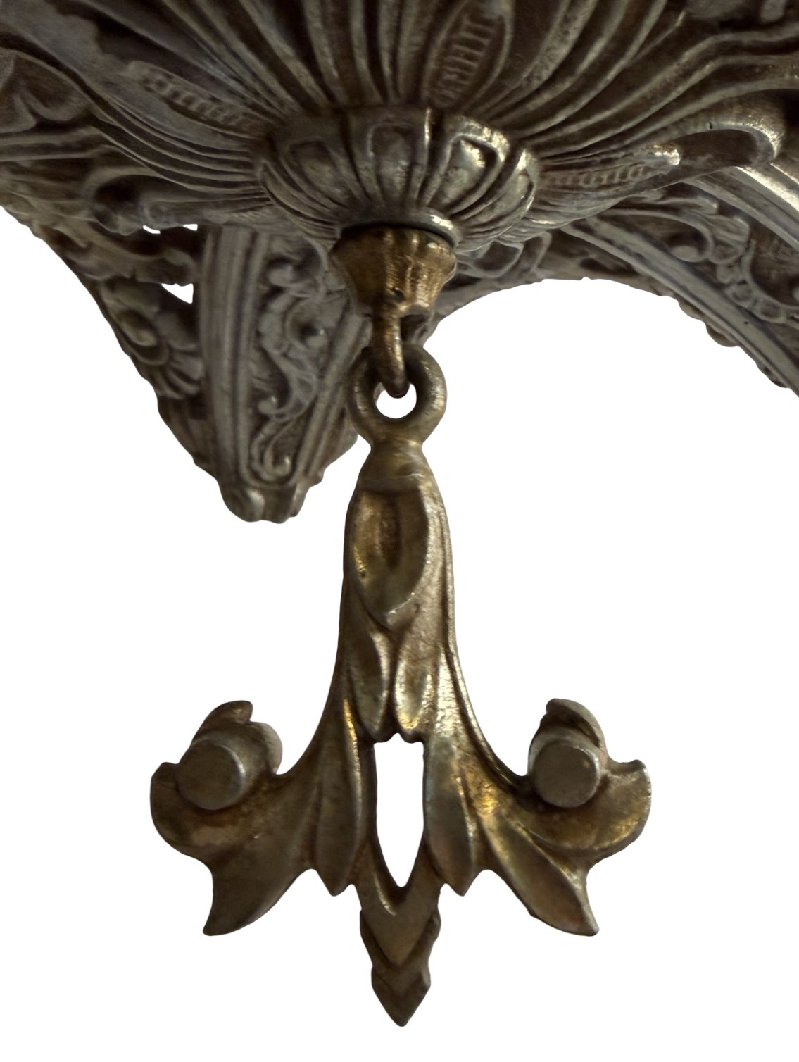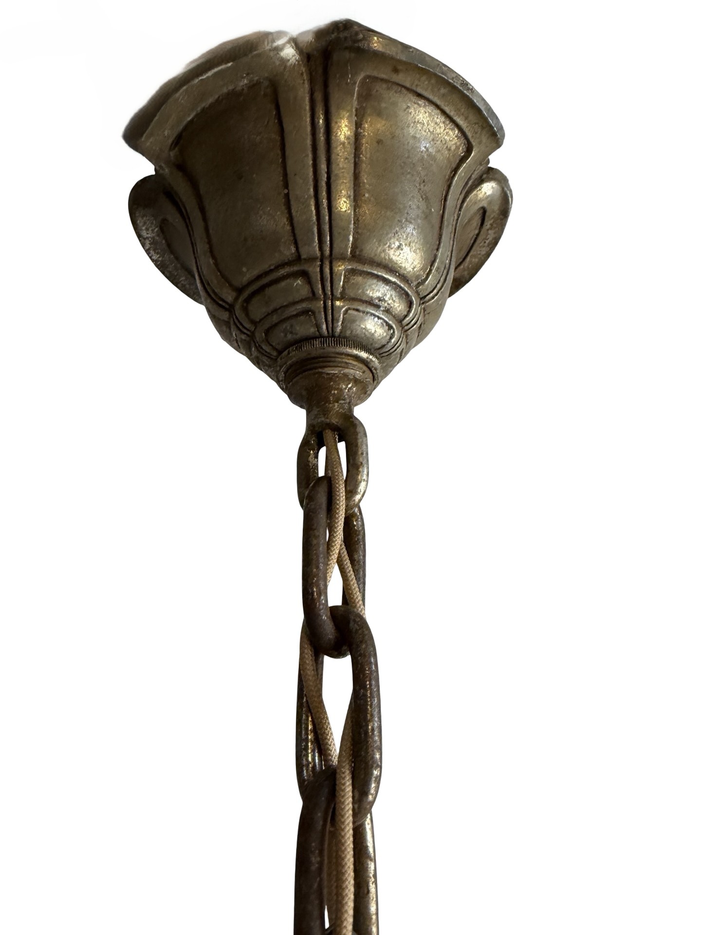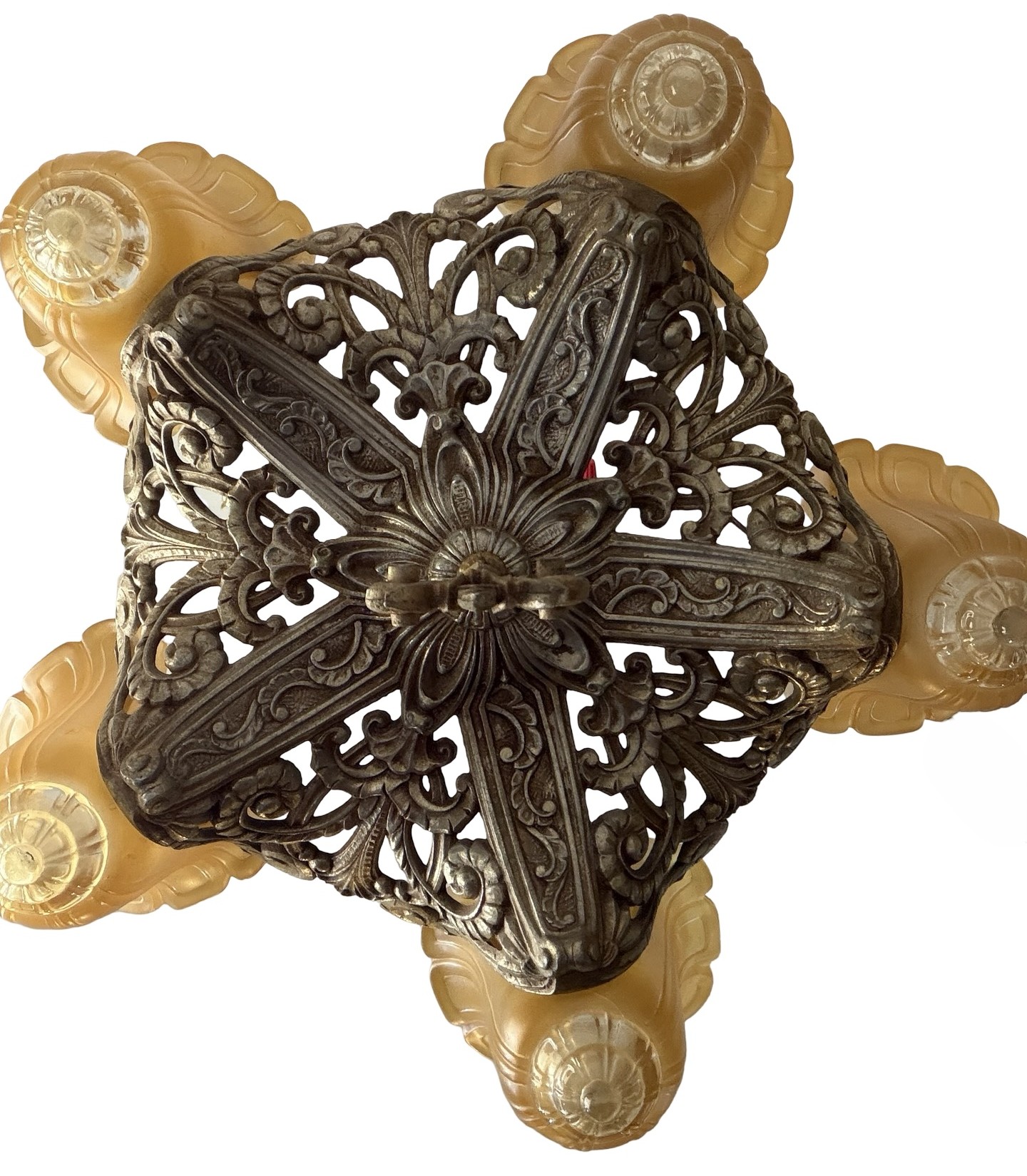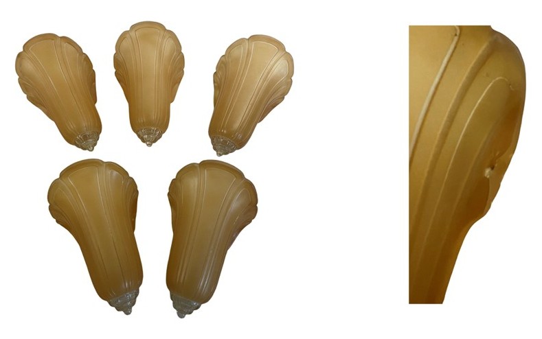 Second City Salvage is offering today this rare chandelier by Gross Chandelier Co. from their Normandy line c1920s. The frame and stem of the light is ornately cast aluminum with a pattern of vines and flowers and has the original burnished finish. It has only been lightly cleaned. Ceiling canopy is original and measures 5” dia. x 3”h. Overall measurement of the chandelier is 19”w and it will drop 27” from the ceiling once installed. It has been restored from head to toe with new sockets and the wiring has been updated with period correct cloth wiring. It will also come with a modern cross bar needed for installation. The shades are original and are amber satin glass with clear tips. The shades are all in what I would consider to be excellent condition. Three are in mint condition. Any chips to the backs on two of them are minimal and would be hidden once placed on the light fixture. One has a small chip to the outer edge that is not noticeable unless scrutinized up close. Each shade measures 5”w x 8”h x 4 1/2” projection. The last photo in the listing shows a photo from a 1920s Gross Chandelier Co. catalog showing this chandelier as a part of their “Normandy” line. A lovely and rare piece that will make a bold statement in any Art Deco setting.