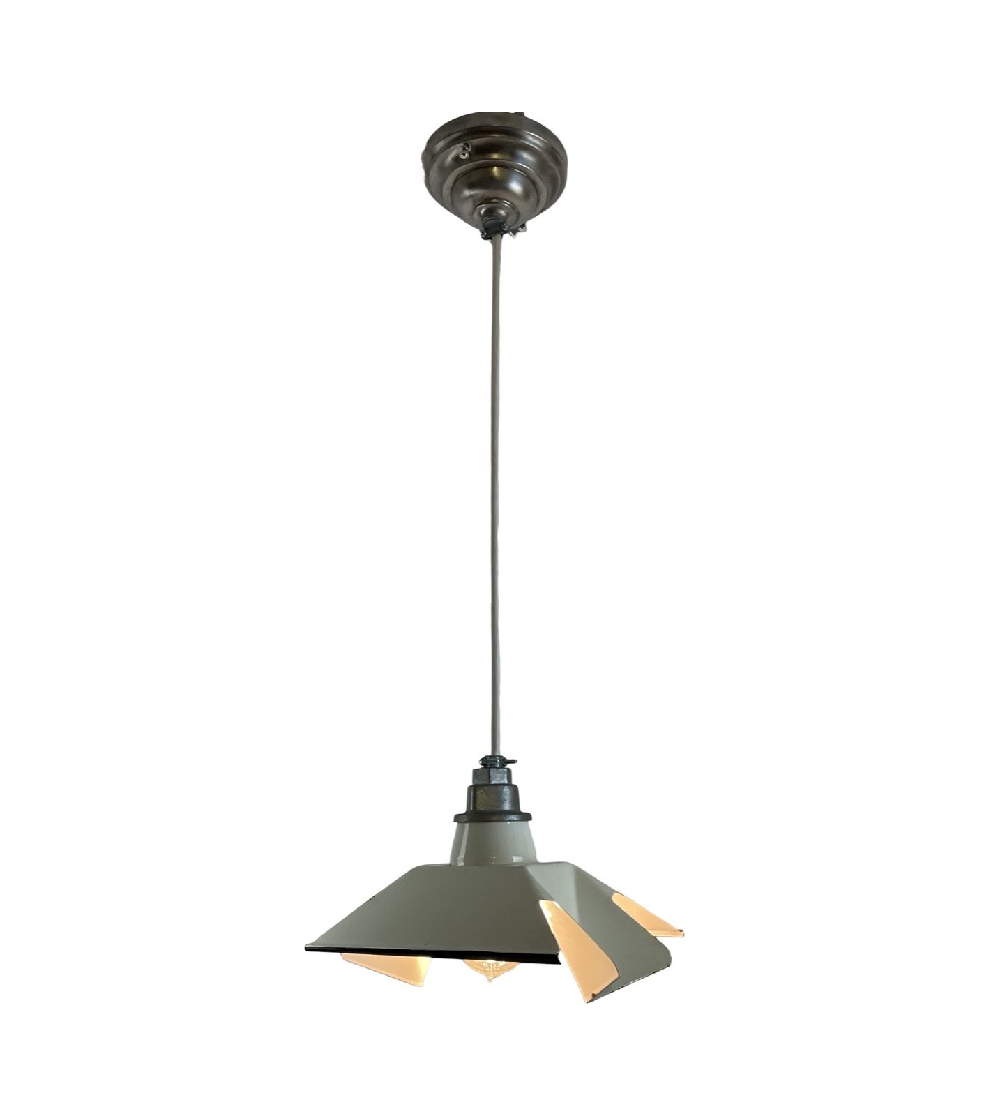 Second City Salvage is offering today this super cool pair of vintage c1930s industrial style pendants manufactured by Goodrich Electric Co., Chicago, IL.  Made of cold rolled steel with a white porcelain enamel finish, the uniquely shaped bow-tie shape of these reflectors are meant to direct the light downward and these were originally meant to light up narrow library aisles.  Porcelain enamel is in great shape with only a tiny bit of loss in spots and very minimal rusty spots.  You have to look closely to find them and I consider those character adding bonuses.  I have two pairs of these for a total of four and have them priced per pair.  Please message me for additional photos, but they are all basically in the same great shape.  Shade holders are original cast aluminum that hang on thick cord and attached to old canopies that were sprayed a Rustoleum silver.  Wiring/cord is new.  They measure 11 ½”w x 8”w and will drop 30” from the ceiling once installed.  Canopies are 5 1/4’” dia x 2 1/2”h and the cord is 19”long.  They accept a standard base bulb in original porcelain sockets and will also come with a modern cross bar needed for installation.  These would be great over a kitchen counter/island or peninsula and would add a vintage touch to your even modern kitchen!  Pair these with Edison bulbs shown (but not included) for a great vintage look!
