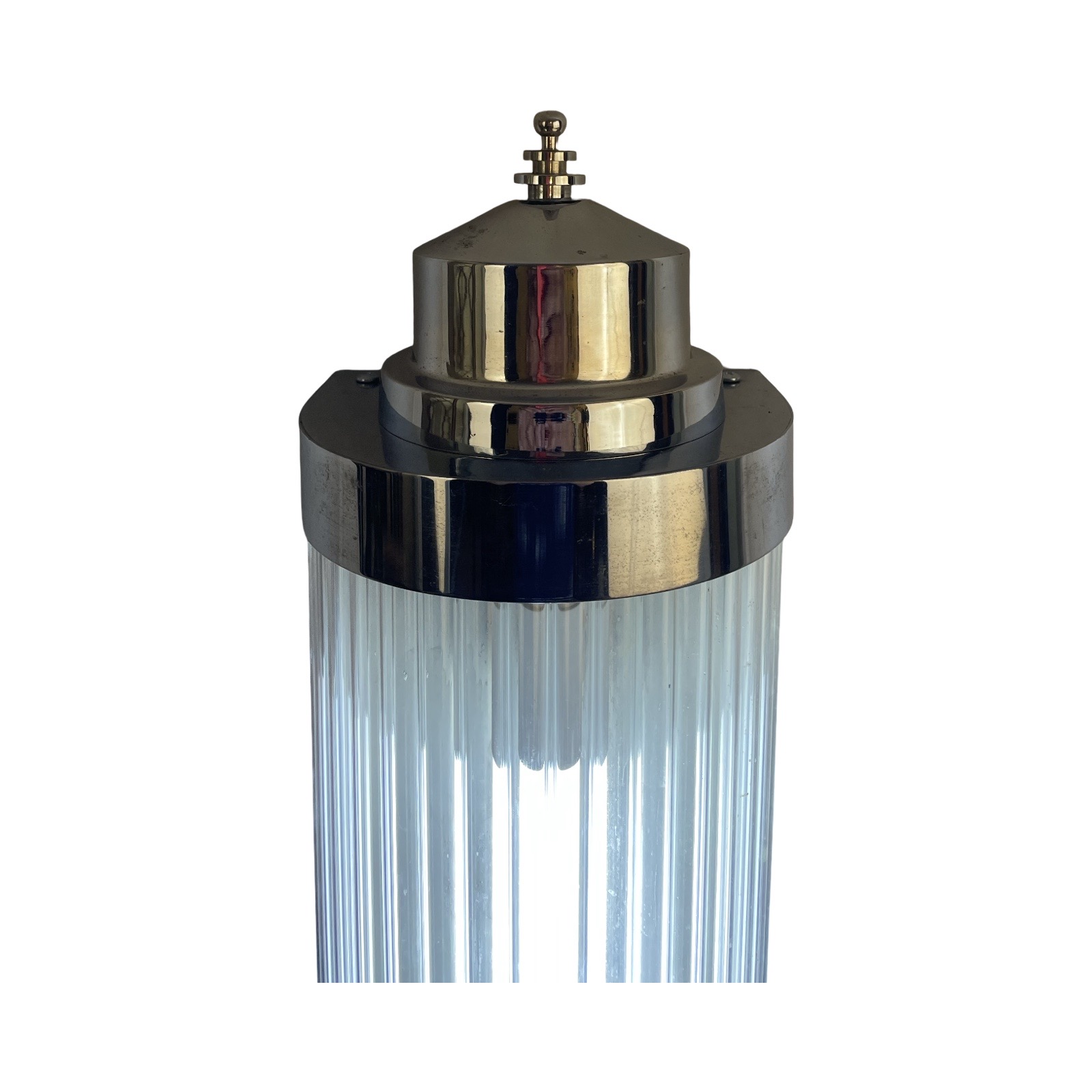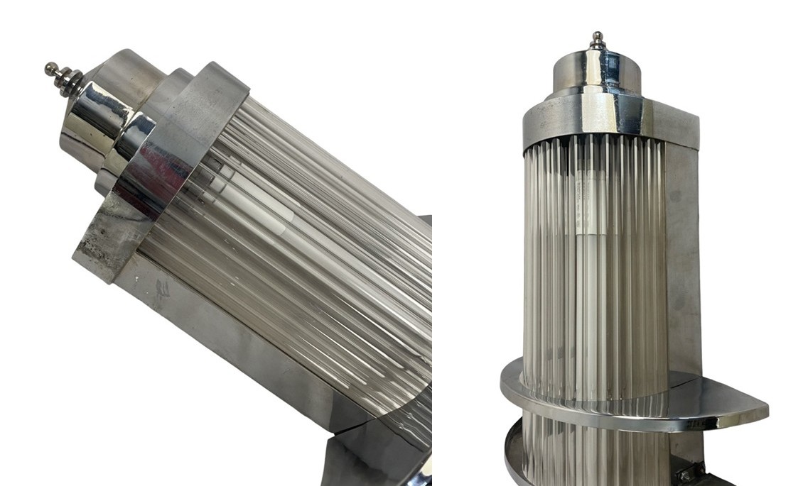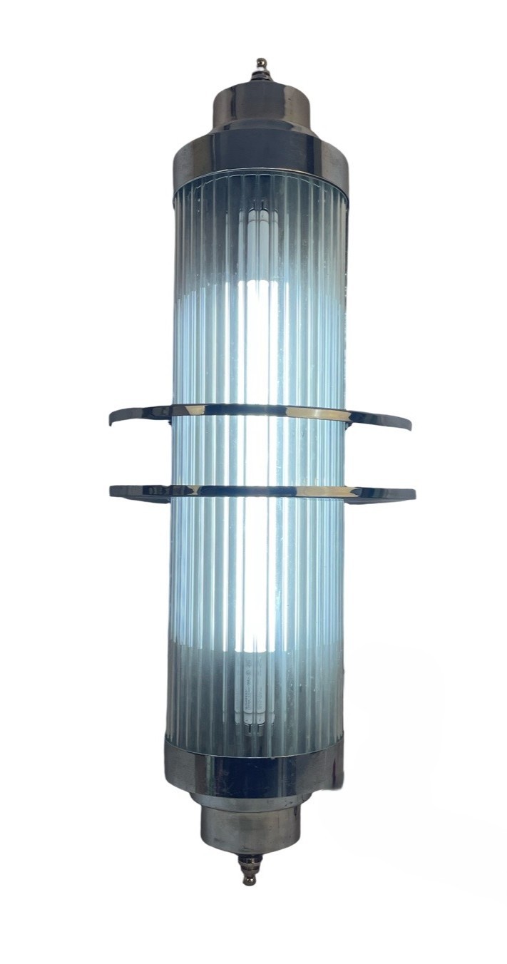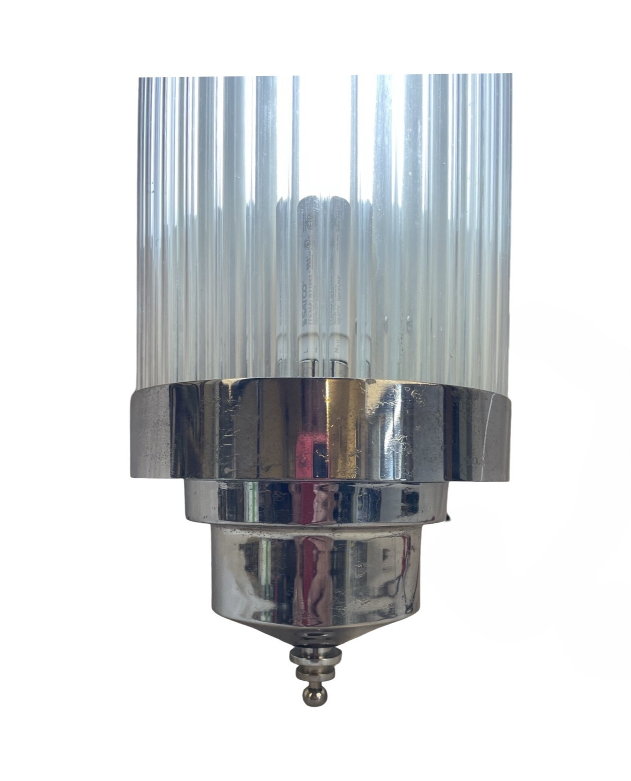 Second City Salvage is excited to offer this fully restored oversized Art Moderne chrome and glass sconce that dates to the late 1930s or early 1940s. It has been fully restored and converted from fluorescent to LED. It is ready to install. It measures a monumental 28″h x 11″w and will project 7″ from the wall once installed. The original chrome plating is in excellent condition with only a couple very small spots of loss/rust on the sides which I have elected to leave alone. The finials on the top and bottom are both original and most of the glass tubing is original. I only had to have several replaced and I have one extra. A great piece that deserves a significant place – am thinking the end of a hallway in a large commercial space would be the perfect spot for this beauty! It will come to you with updated wiring, the LED bulb and a modern cross bar needed for installation.