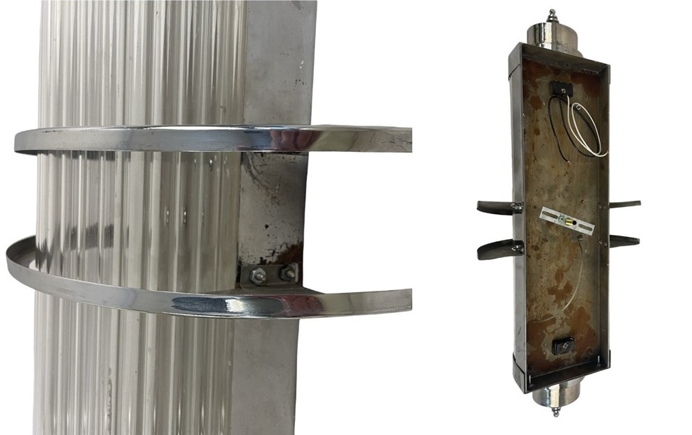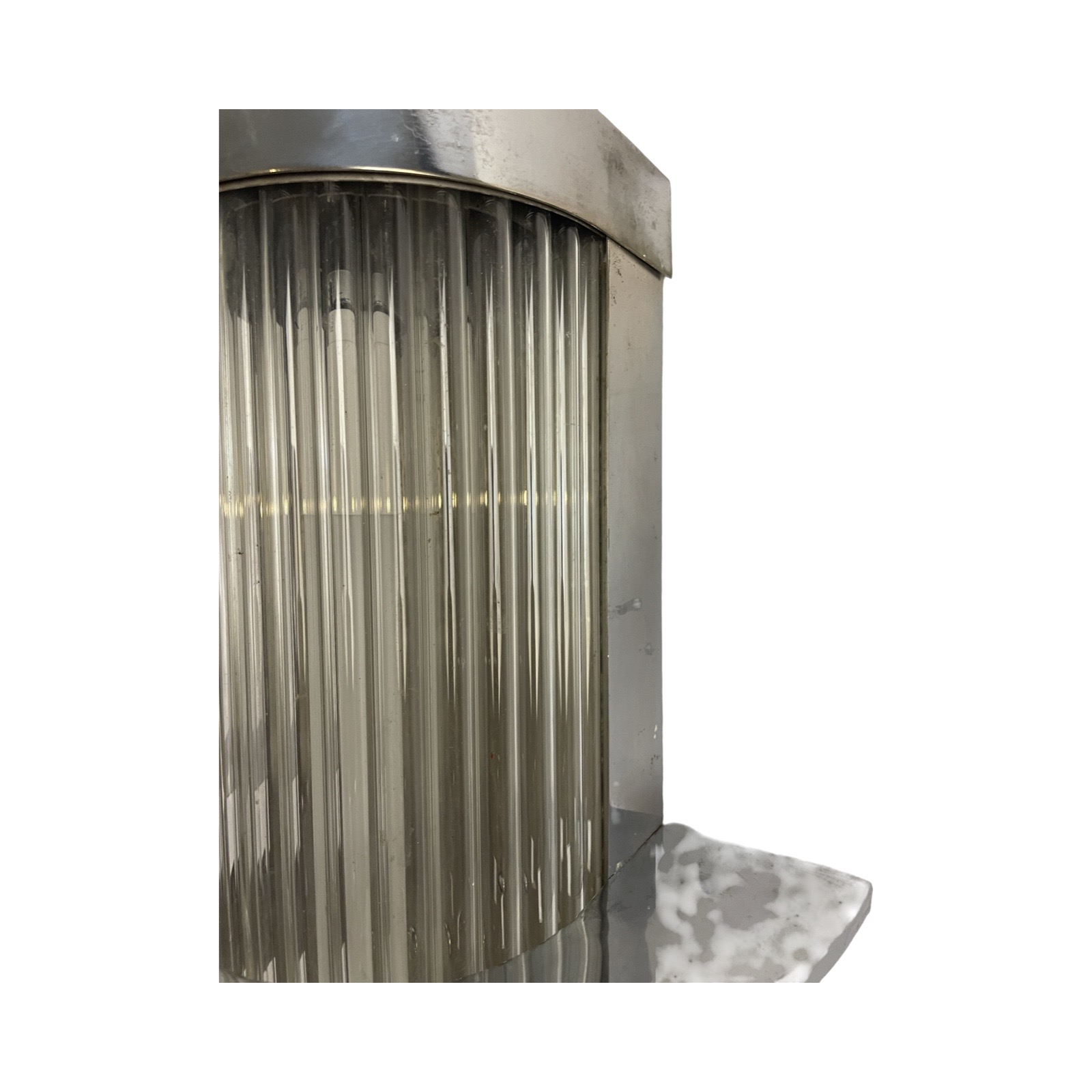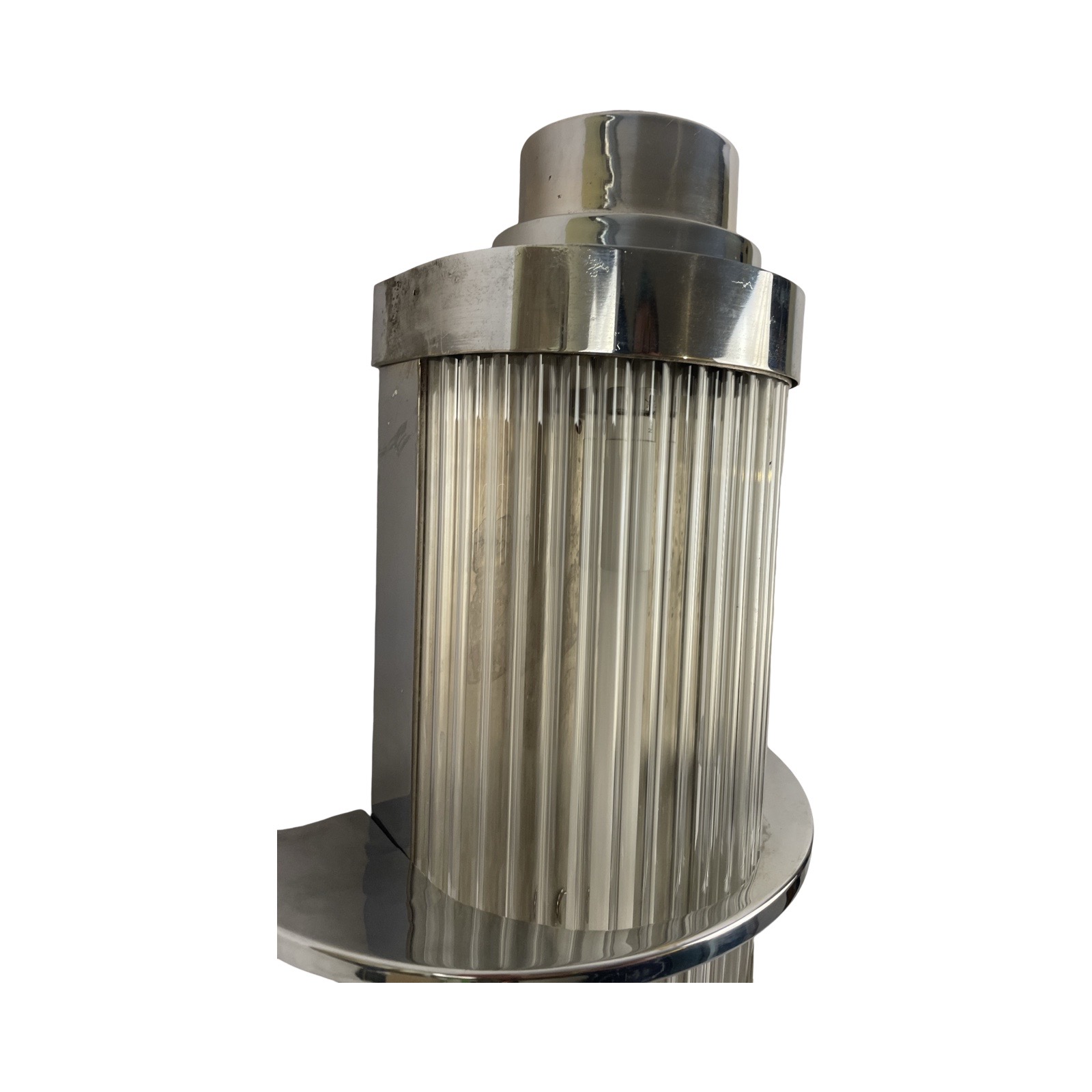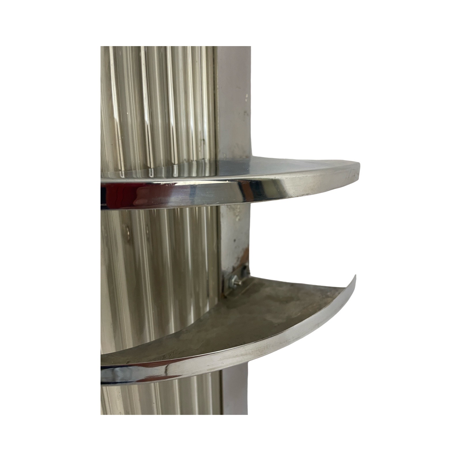 Second City Salvage is excited to offer this fully restored oversized Art Moderne chrome and glass sconce that dates to the late 1930s or early 1940s. It has been fully restored and converted from fluorescent to LED. It is ready to install. It measures a monumental 28″h x 11″w and will project 7″ from the wall once installed. The original chrome plating is in excellent condition with only a couple very small spots of loss/rust on the sides which I have elected to leave alone. The finials on the top and bottom are both original and most of the glass tubing is original. I only had to have several replaced and I have one extra. A great piece that deserves a significant place – am thinking the end of a hallway in a large commercial space would be the perfect spot for this beauty! It will come to you with updated wiring, the LED bulb and a modern cross bar needed for installation.