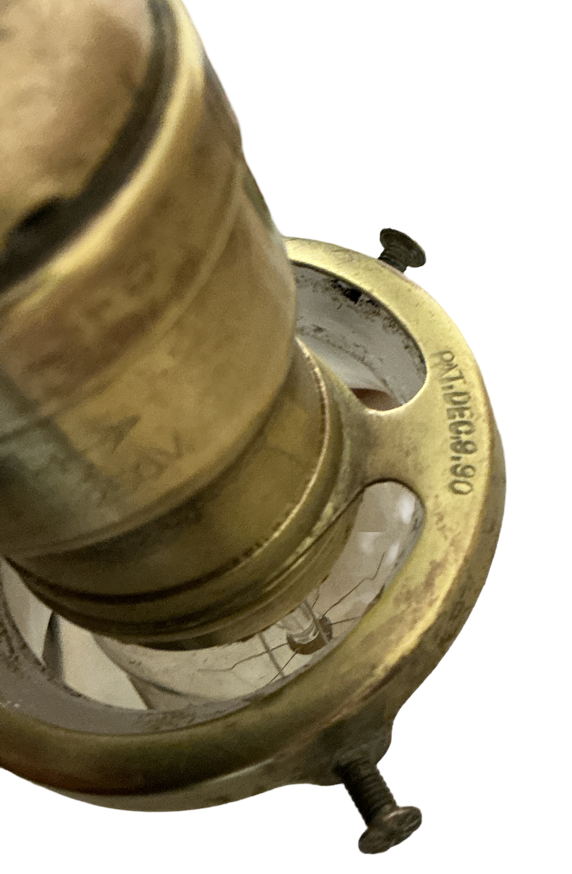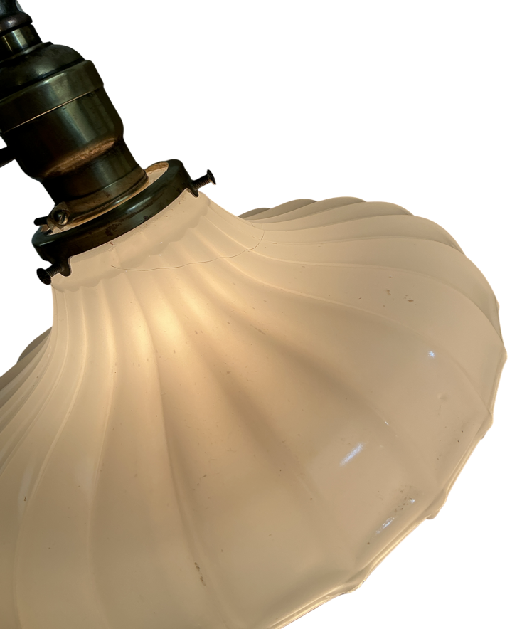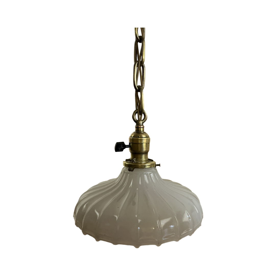 Second City Salvage is offering today this antique brass pendant c1900 that has been completely restored.  It was painted when received so when all of that was removed, this was the patina we found underneath and it has only been lightly cleaned.  All components are brass so will darken naturally.  It measures 9″ diameter and will drop 27 1/2″ from the ceiling once installed.  The chain is 14″ (can be shortened) and the original bee hive canopy is 4 1/2″ diameter x 4″h.  The paddle switch socket is a new replacement, but the original shade holder has patent date of Dec 9, ’90.  The shade is a Brascolite shade in clam broth glass in the Sheffield style which measures 9″ dia x 4″h and has a 2 ¼” fitter.  It is in mint condition, but there is a line in the glass that I at first thought was a crack, but it looks like it’s some sort of flaw that happened during manufacturing (last photo).  It is not notable, but I have to mention.  It takes a standard base bulb, will come to you with period correct gold cloth wiring and a modern cross bar needed for install.  A great old pendant will be a wonderful enhancement to any vintage setting.