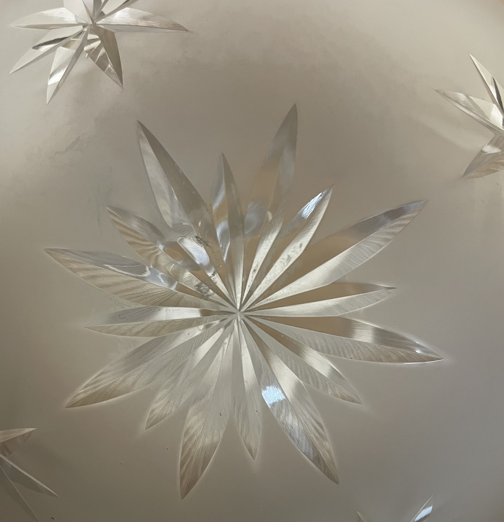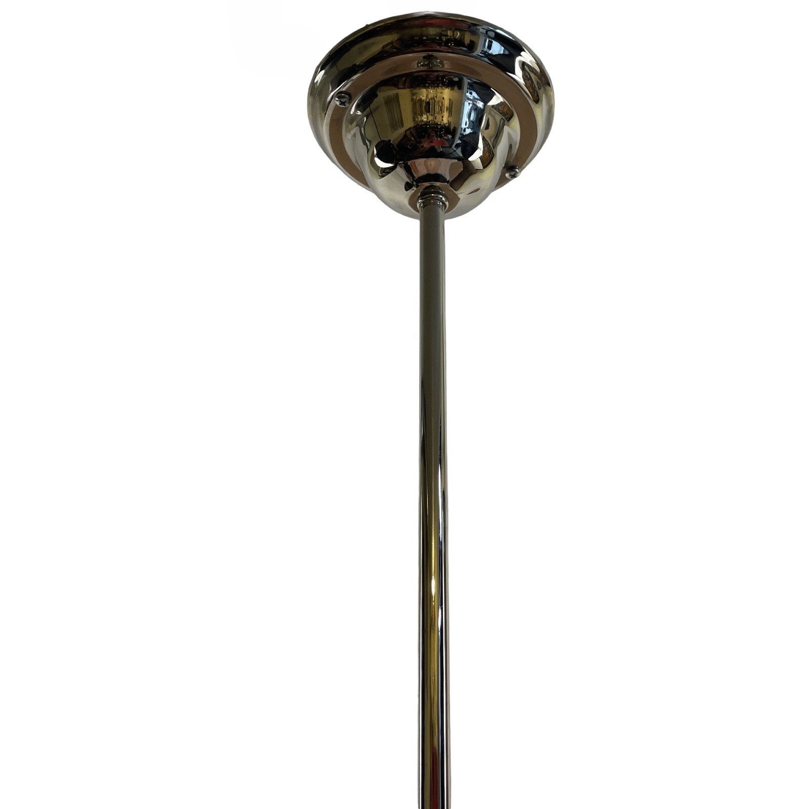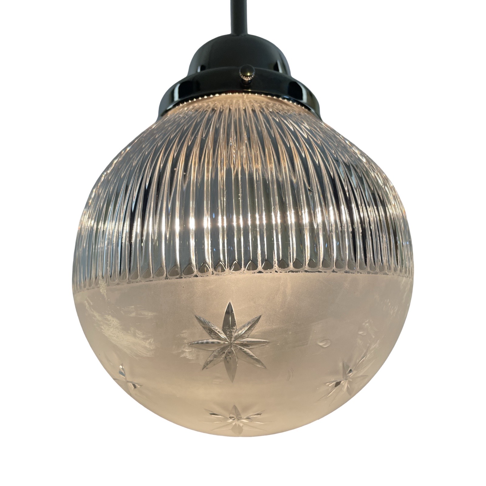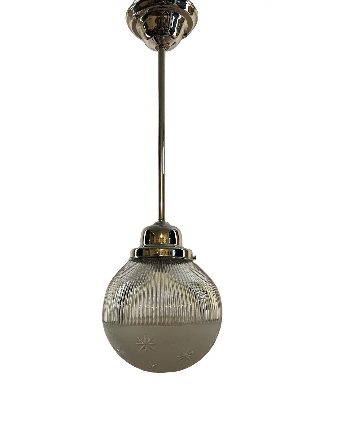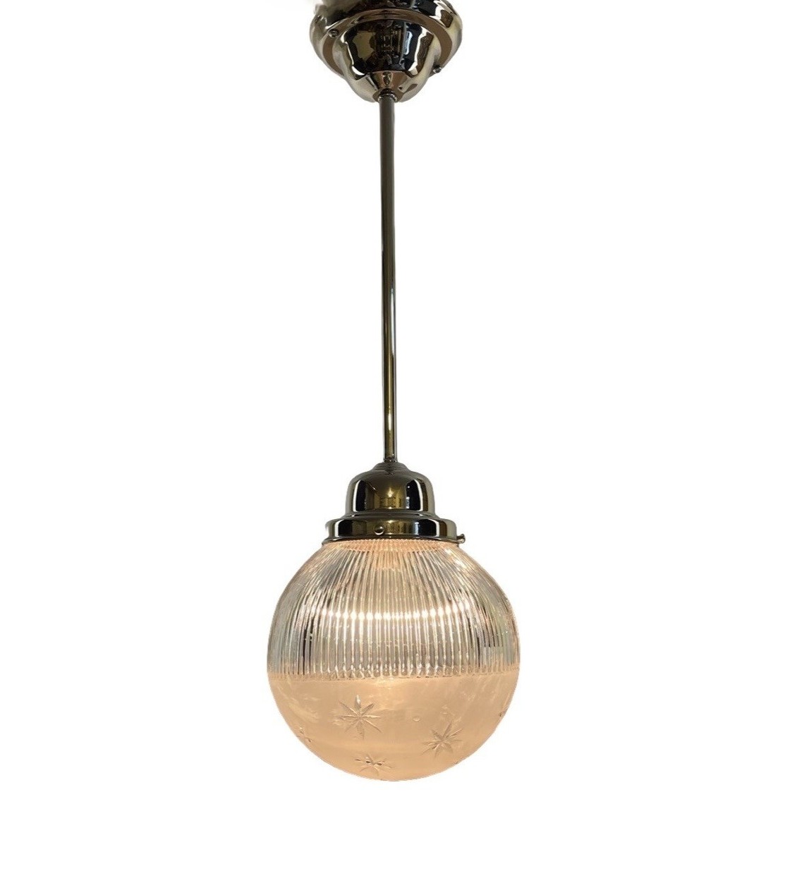Second City Salvage is offering today this fabulous nickel plated brass pendant that is modern (within the last 25 years) by Hudson Valley Lighting that I paired with this old c1904 Holophane Pagoda etched and wheel cut glass globe shade that is marked HOLOPHANE PAGODA PATENT JUNE 21 ’04 on fitter rim. This shade is extremely rare and to find one in this condition, even more rare. Overall, the pendant measures 7″w and will drop 24″ from the ceiling once installed. The canopy is 5″w x 2 1/2″h and the shade itself is 7″ dia x 7″ h and has a 4″ fitter. There is, however, a very tiny flea bite chip to the bottom of shade that is insignificant and not notable, but I have to mention (shown in the last photo). You have to really scrutinize it up close to see it and I almost missed it. Wiring has been updated. My vision for this light is for a pantry or maybe even a bathroom. It’s just a lovely piece that deserves to be a focal point in your period home.