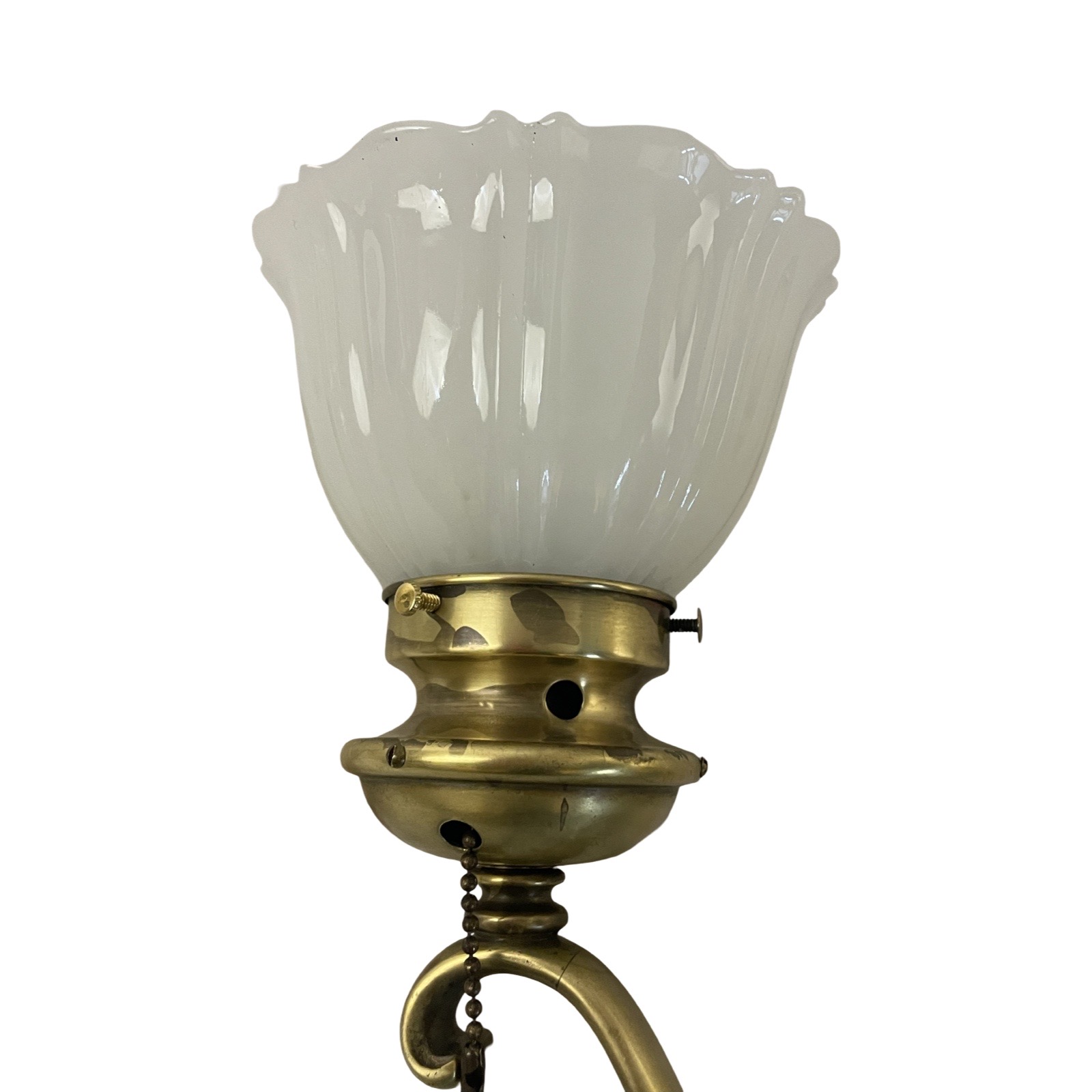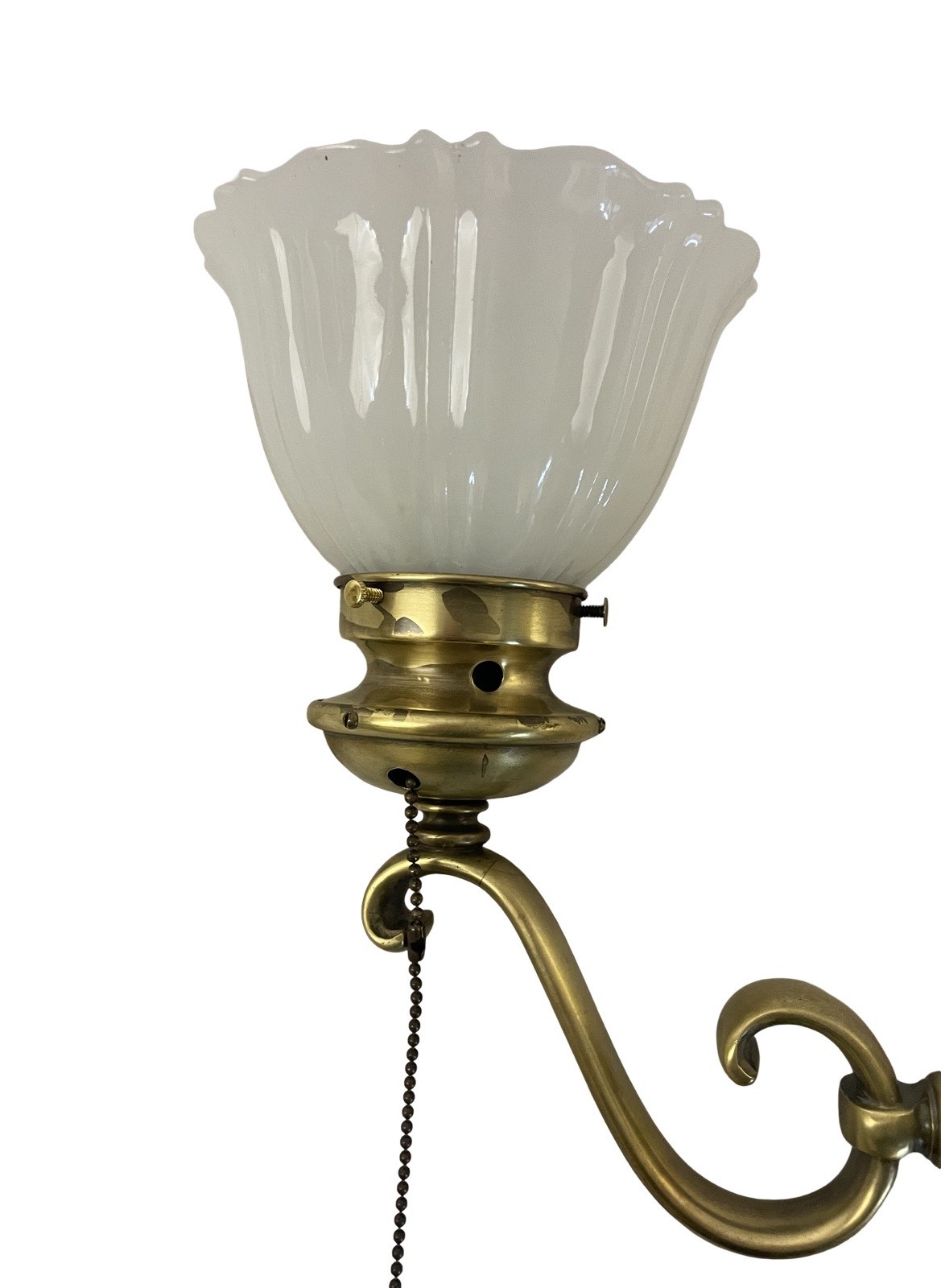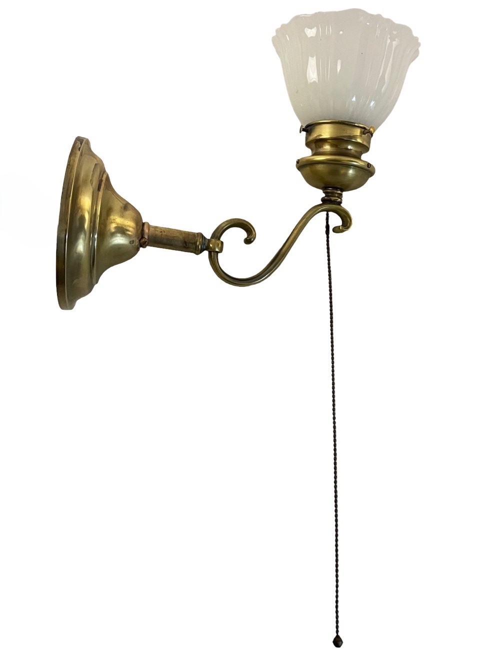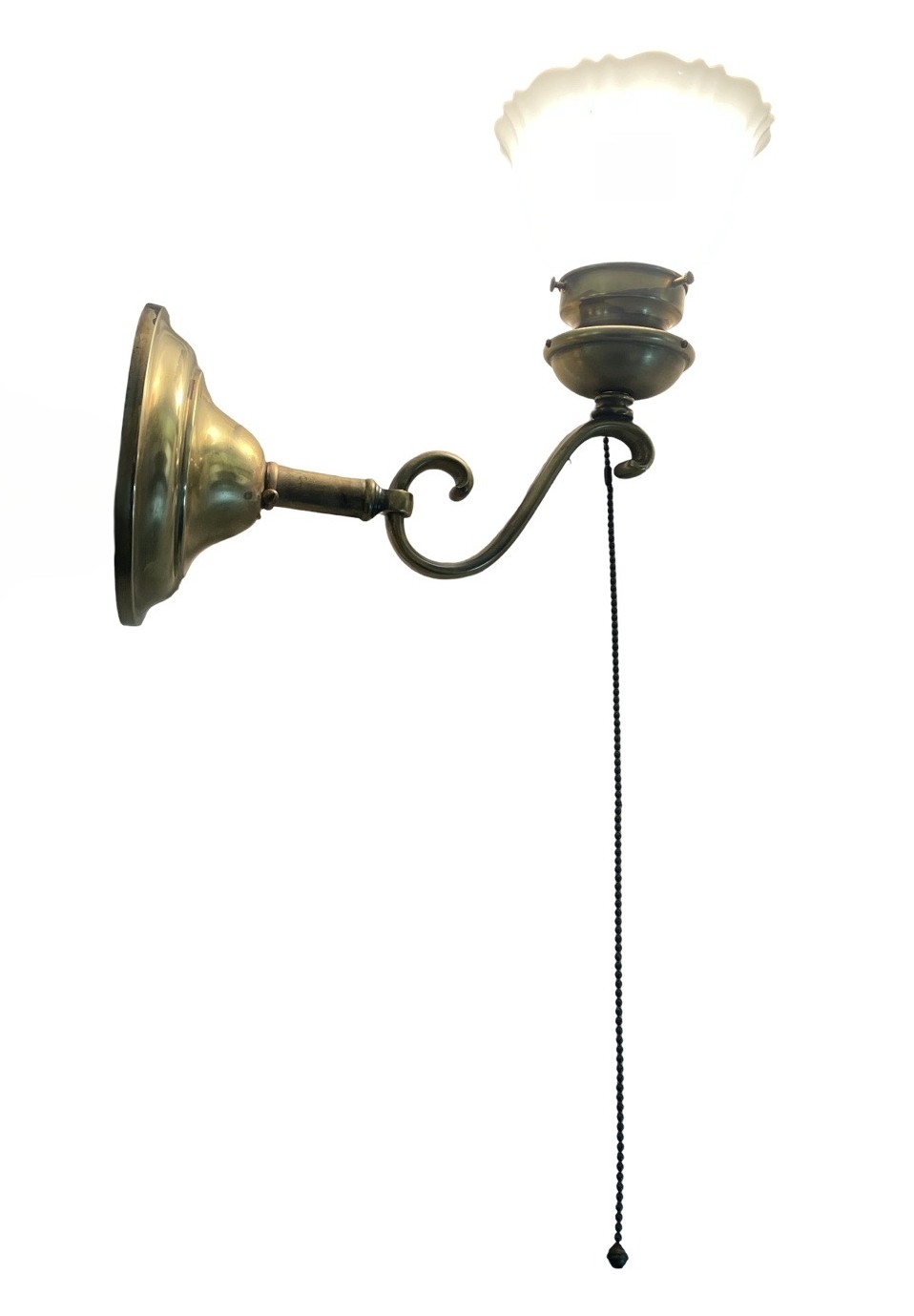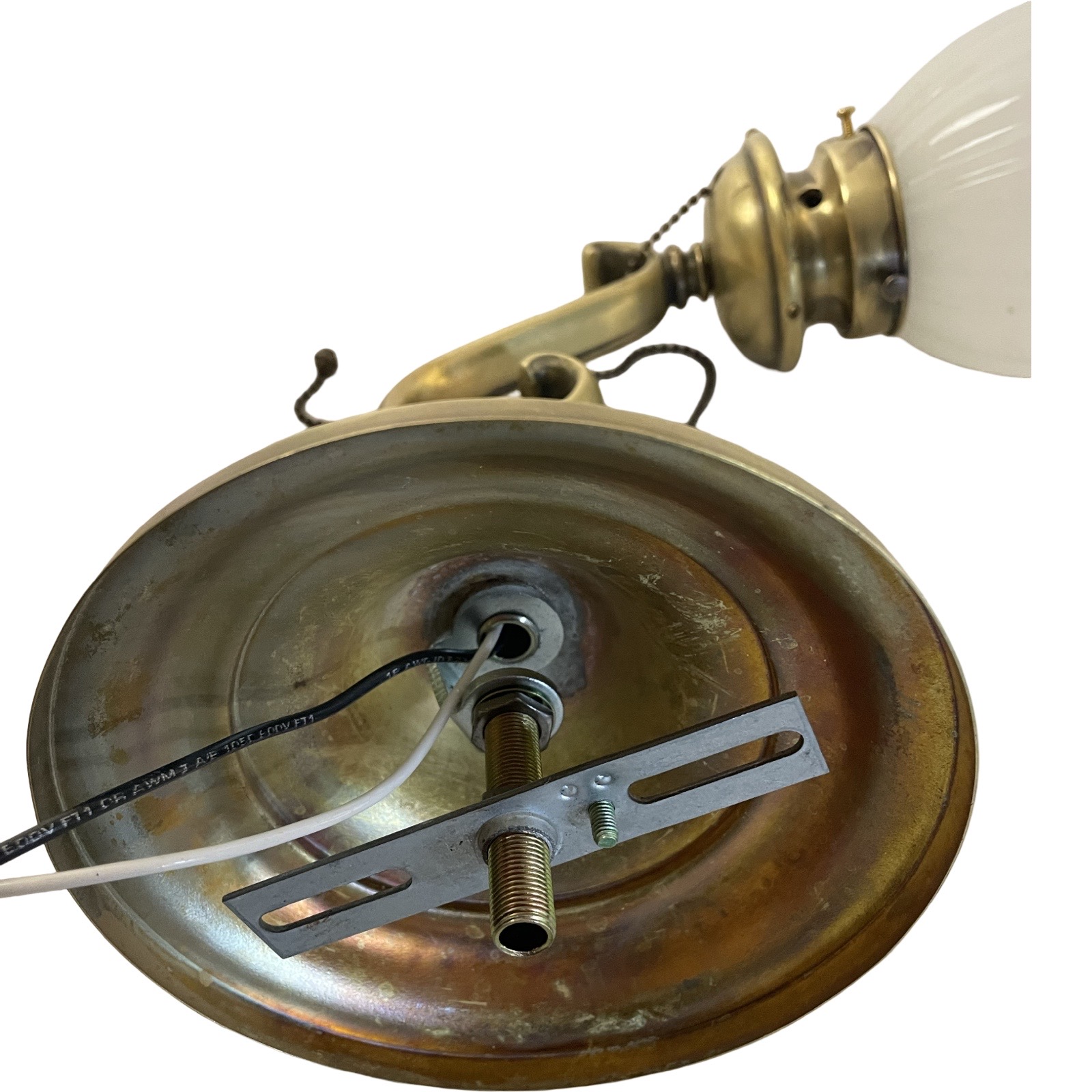 Second City Salvage is offering today this heavy antique bronze curved arm sconce that dates to c1915 that has been completely restored. It was lacquered when we received it so we stripped it down to bare bronze and this is the patina we found underneath – it has only been lightly cleaned. It has the original pull chain socket with rare acorn pull (chain is 16″ long). It has been paired with this smaller scale Sheffield shade that is in mint condition. Overall measurement is 5 1/2″w x 11″h and it will project 11″ from the wall once installed. The brass canopy is 6″ diameter x 2 1/4″h and the shade itself is 5 1/2″ diameter x 3 1/2″h and has a 2 1/4″ fitter. It accepts a standard base bulb, the wiring has been updated, it has been tested and will come to you with a modern cross bar needed for install.