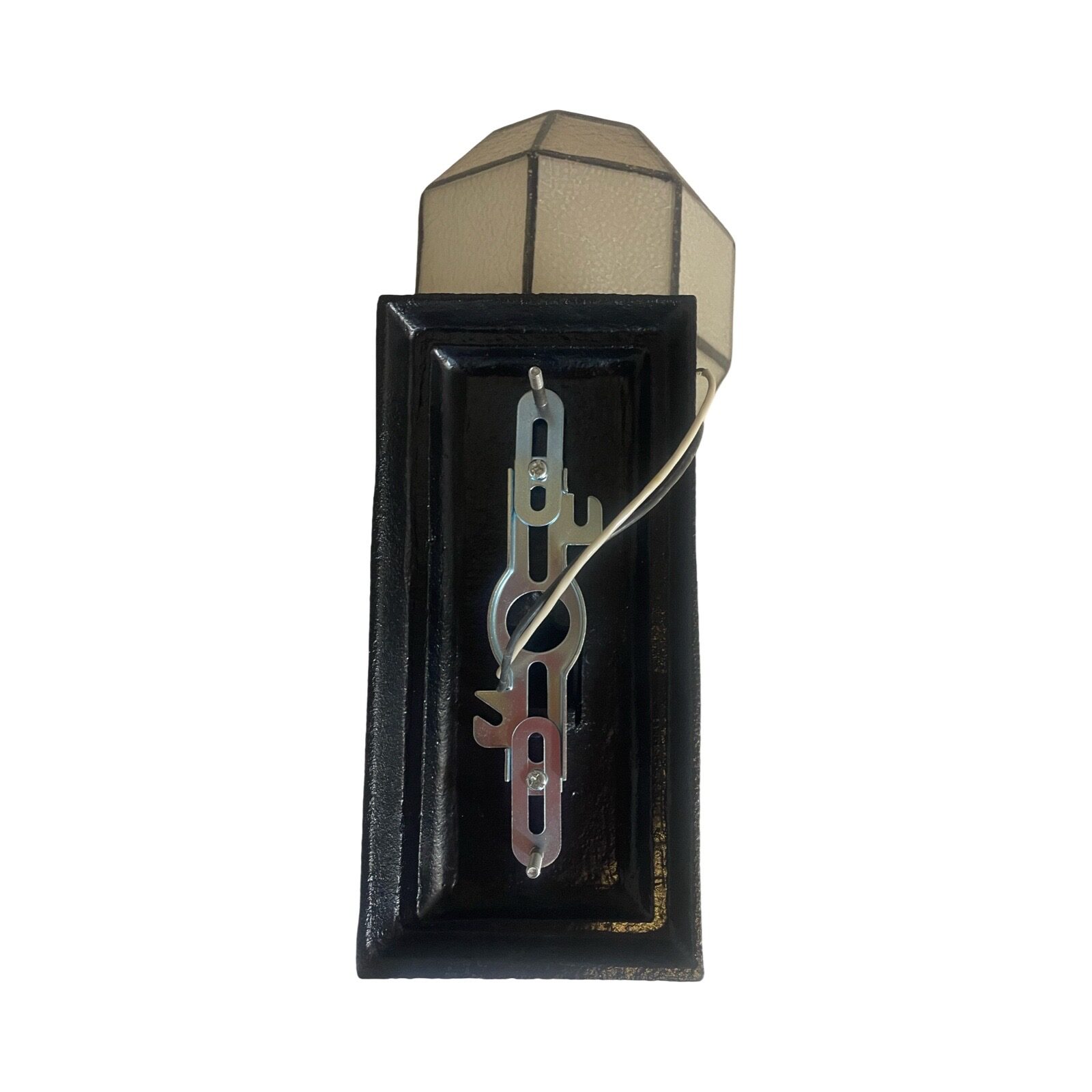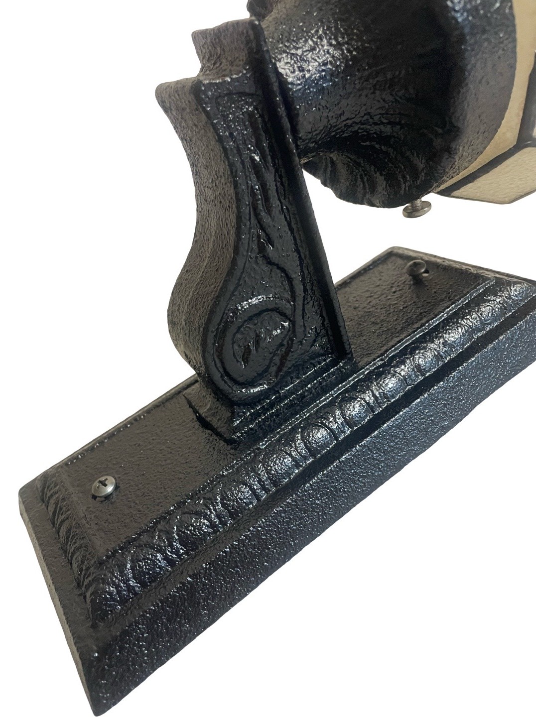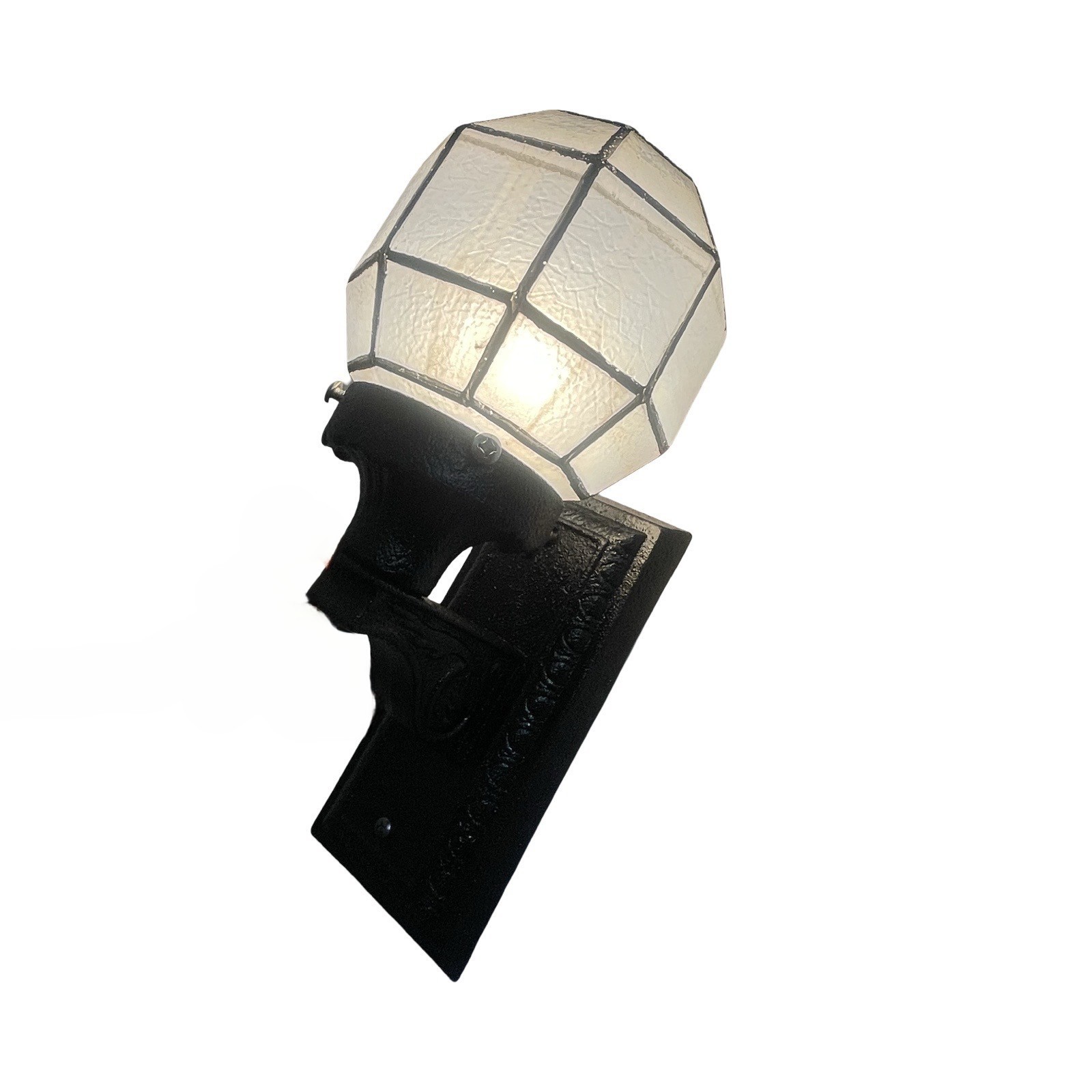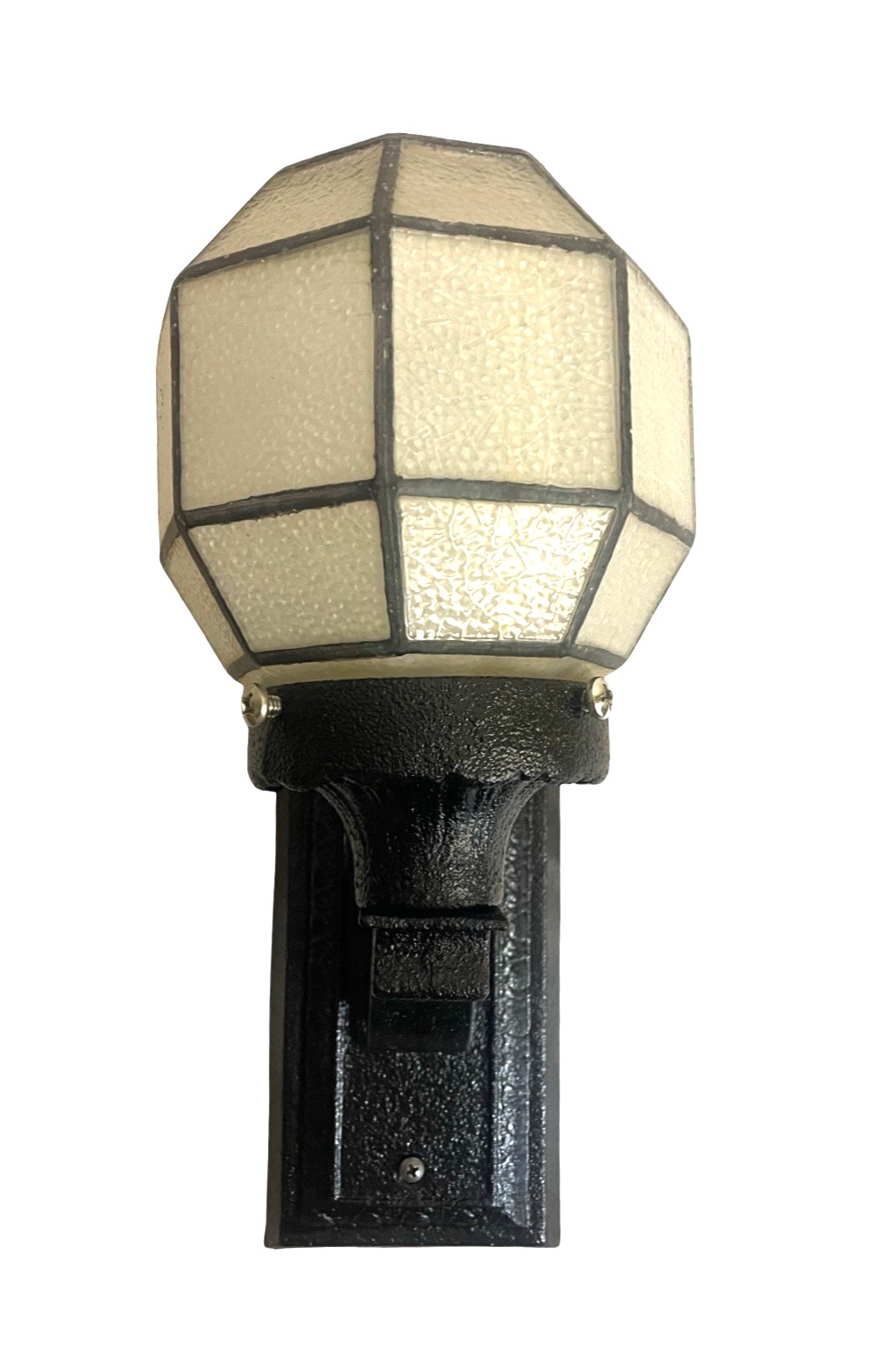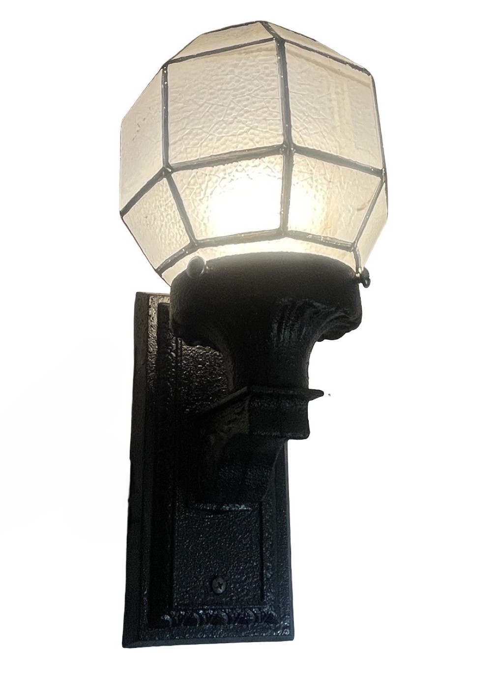 Second City Salvage is offering today this old c1920 cast iron porch light/sconce that has been restored and painted a satin black. A period octagon textured glass and lined globe shade has been added. Here are the dimensions! Wall plate is 4″w x 8 ¼”h, overall height is 13″ x 6″w and the projection from the wall once installed is 7″. The shade is 6″w x 5 1/2″h and has a 3″ fitter. The shade is in good condition with no chips or cracks, just some minor fading to the lines and some stubborn stains on the interior of the shade. It is a rare find. This light has some very simple Arts & Crafts detailing and will be a great focal point for an entry way. The light accepts a standard base bulb, has been tested, will come to you with updated wiring, a modern cross bar needed for install and will be ready to install. The shade does need to be removed for a bulb change so an LED is recommended.