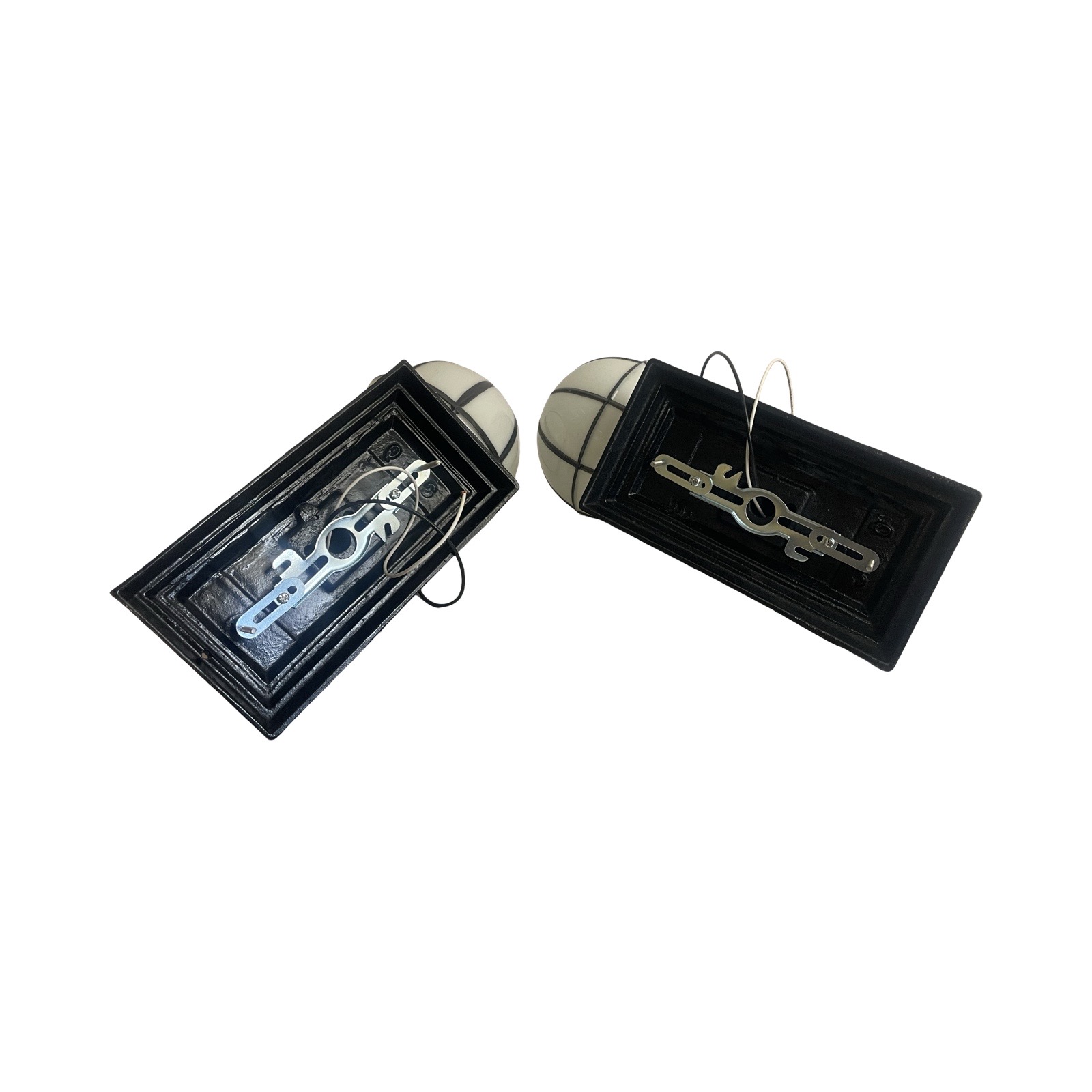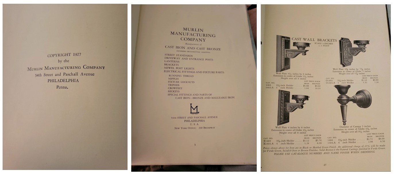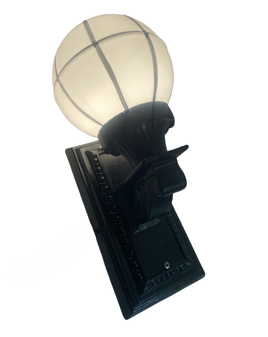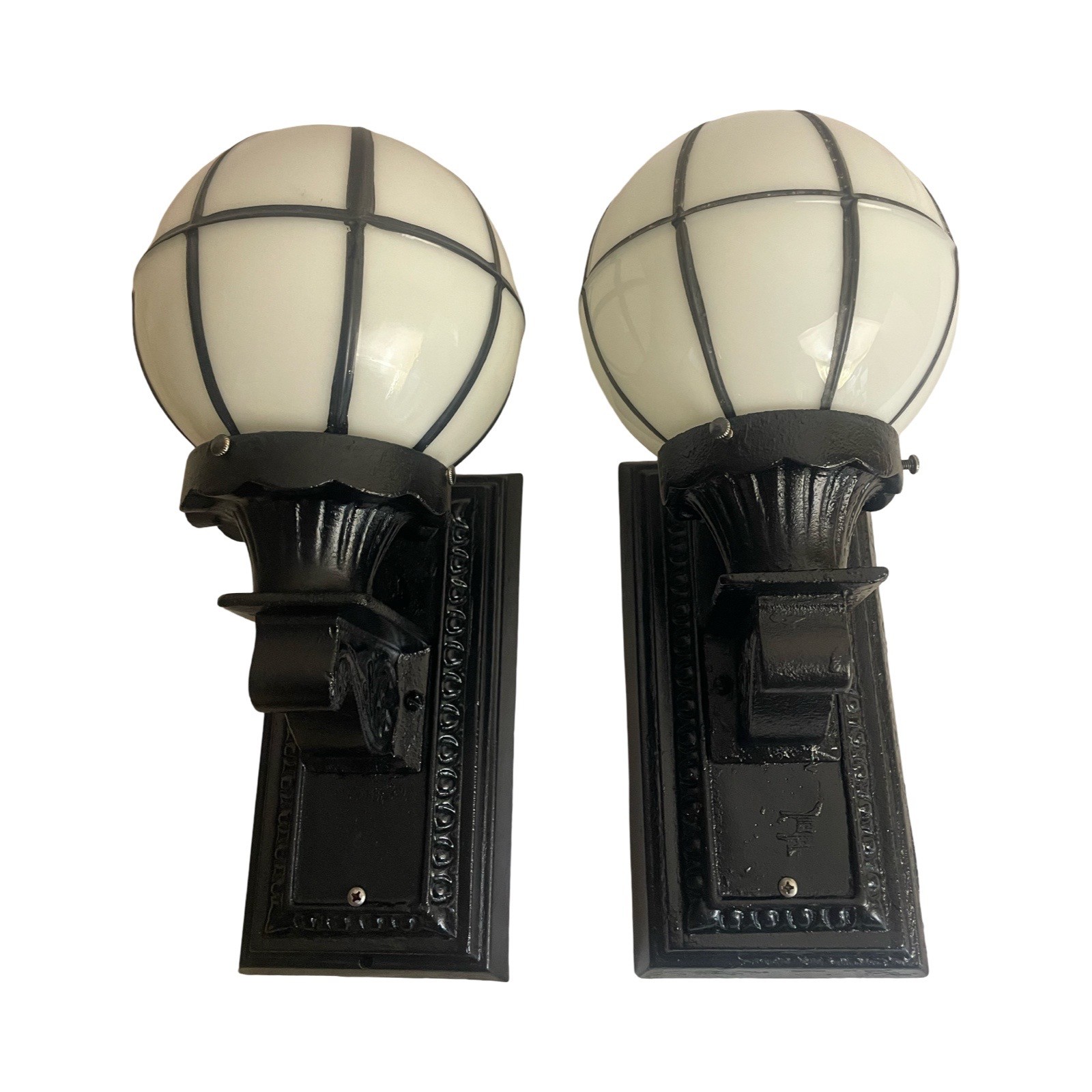 This is a pair of cast iron outdoor sconces or porch lights c1927 manufactured by Murlin Mfg. Co, Philadelphia, PA. These have been stripped of all original paint and repainted a black satin, rewired with modern cross bars, tested and ready to install. These accept standard base bulbs and the shades do need to be removed for a bulb change so LEDs are recommended. Overall measurement is 6″w x 13″h and will project 8″ from the wall once installed – wall plate is 5″w x 9″h. The period embossed milk glass globe shades are 6″ diameter x 6″h with a 3″ fitter in excellent condition with no chips, cracks or repairs. The shades are amazing, however don’t match exactly and the lines on one is thicker/darker than the other, but they pair well together and not notable unless scrutinized up close. The backplates have nice egg & dart detail and the arms have scrolling detail as well. The last photo shows them in the 1927 Murlin catalog. They are priced for the pair and I am not willing to split them up.