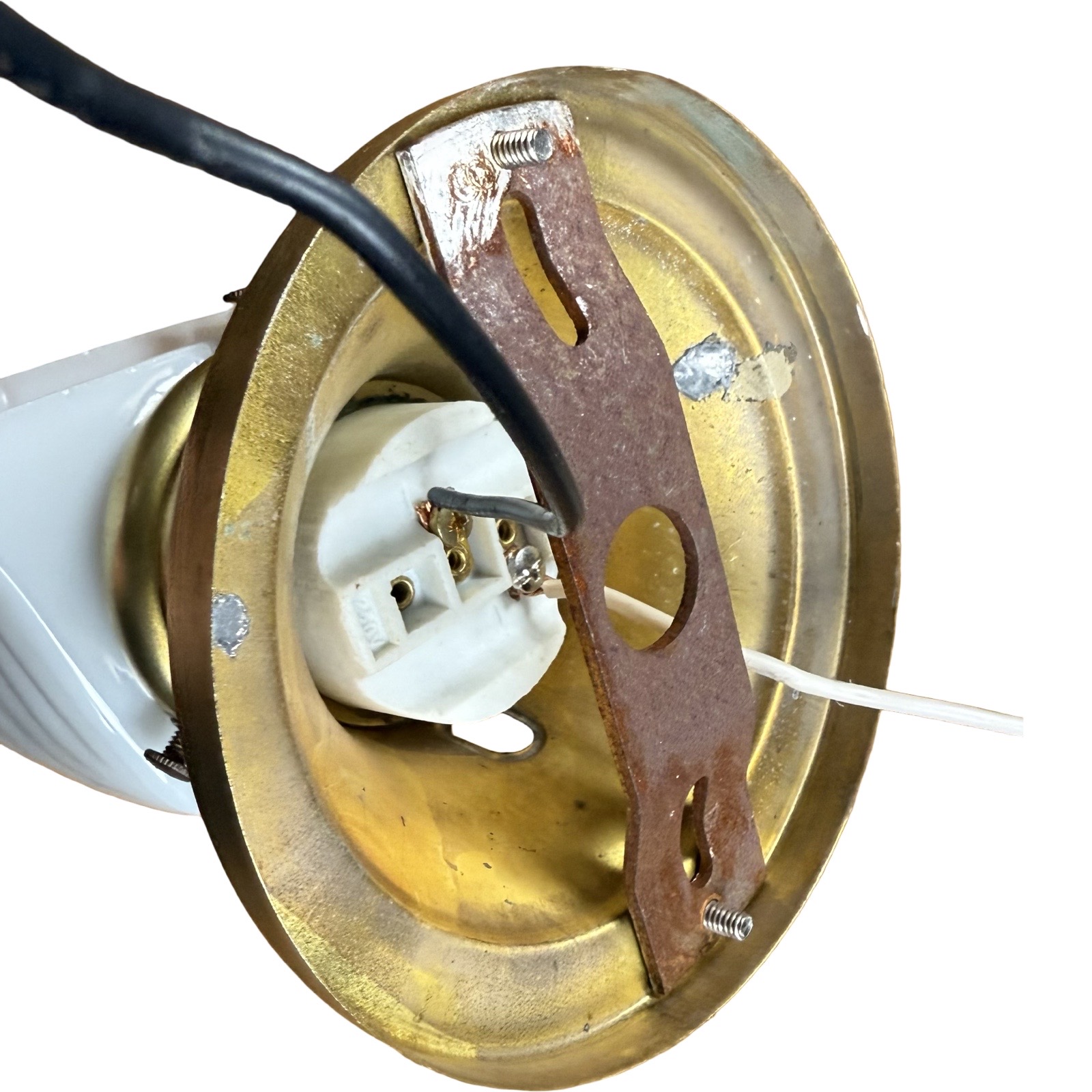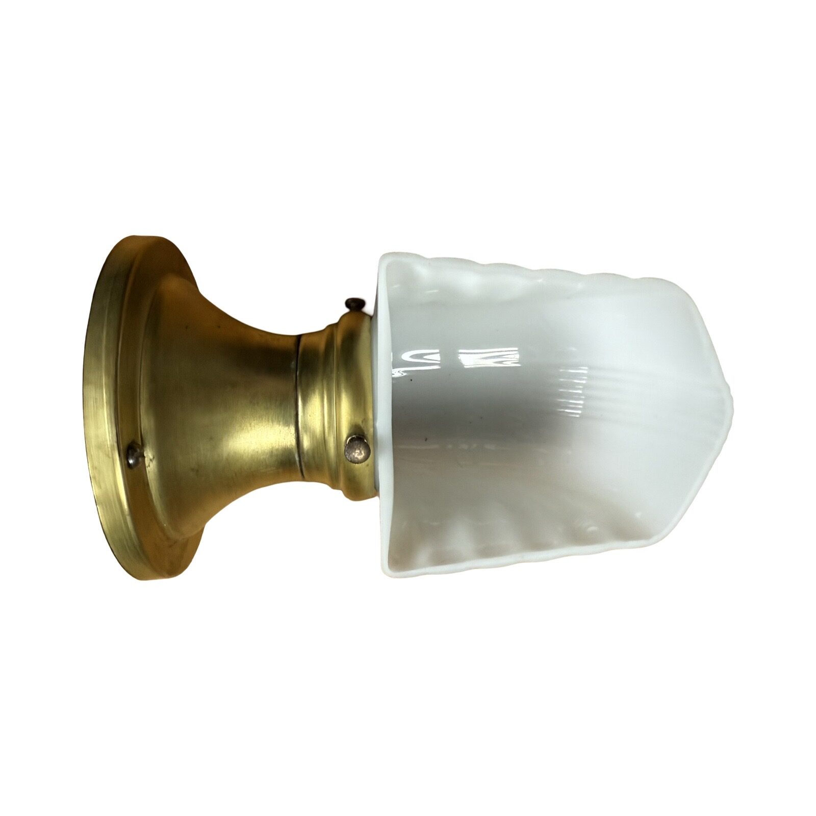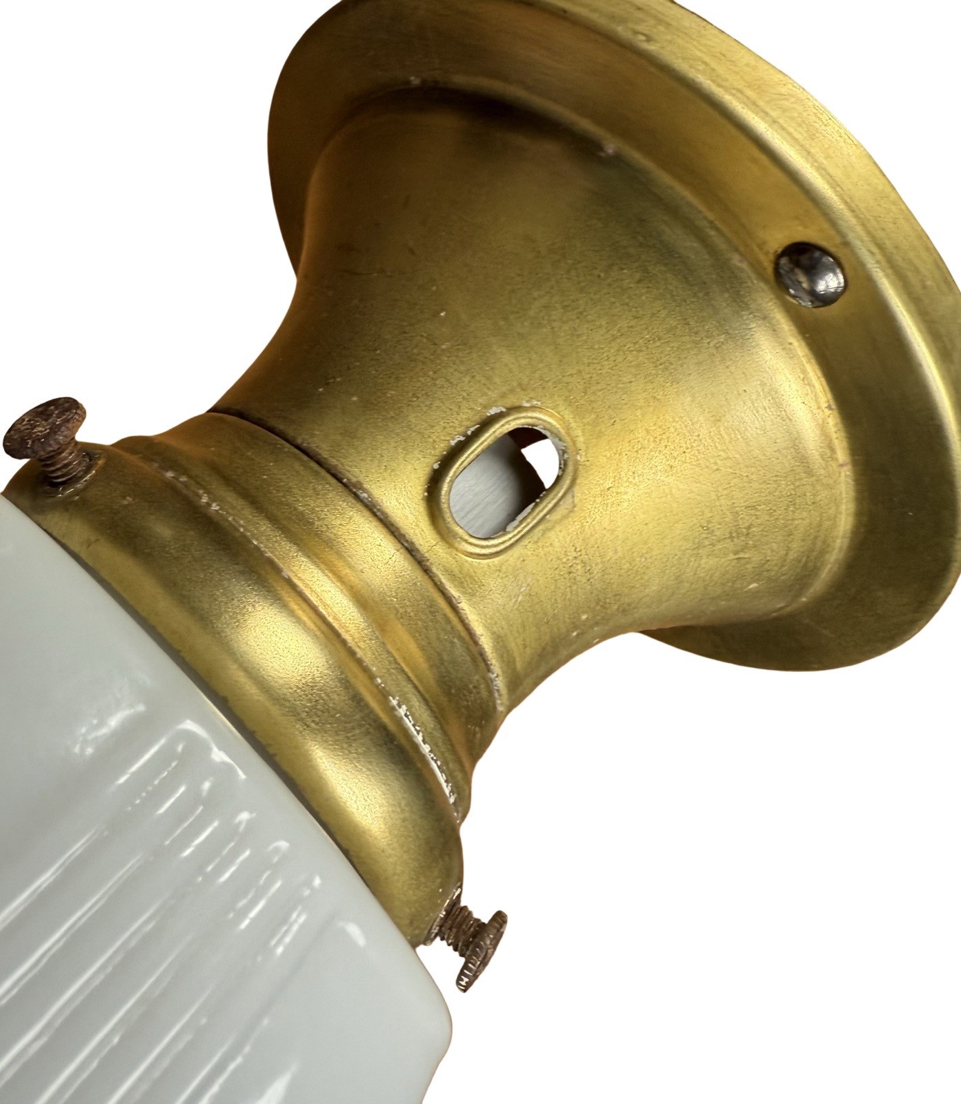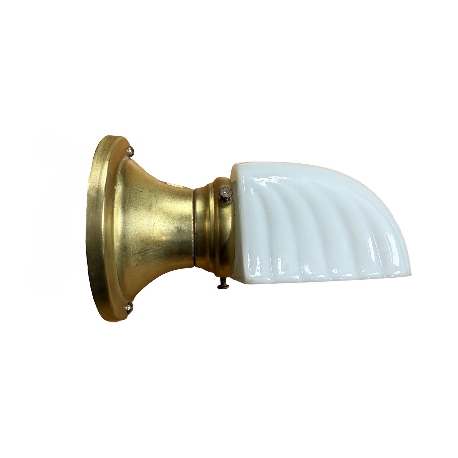 Second City Salvage is offering today this cute pair of vintage c1930s Art Deco brass sconces with embossed milk glass streamline shades in mint condition. PERFECT for a bathroom to flank your old medicine cabinet!! These lights have the original sockets which have been restored. Each one measures 4 5/8″w and will project 8″ from the wall once installed. They are priced for the pair and we are not willing to separate them. They each take a standard base bulb, will come to you with updated wiring, will be tested and will include a modern cross bar needed for install. Ready to light up your life!