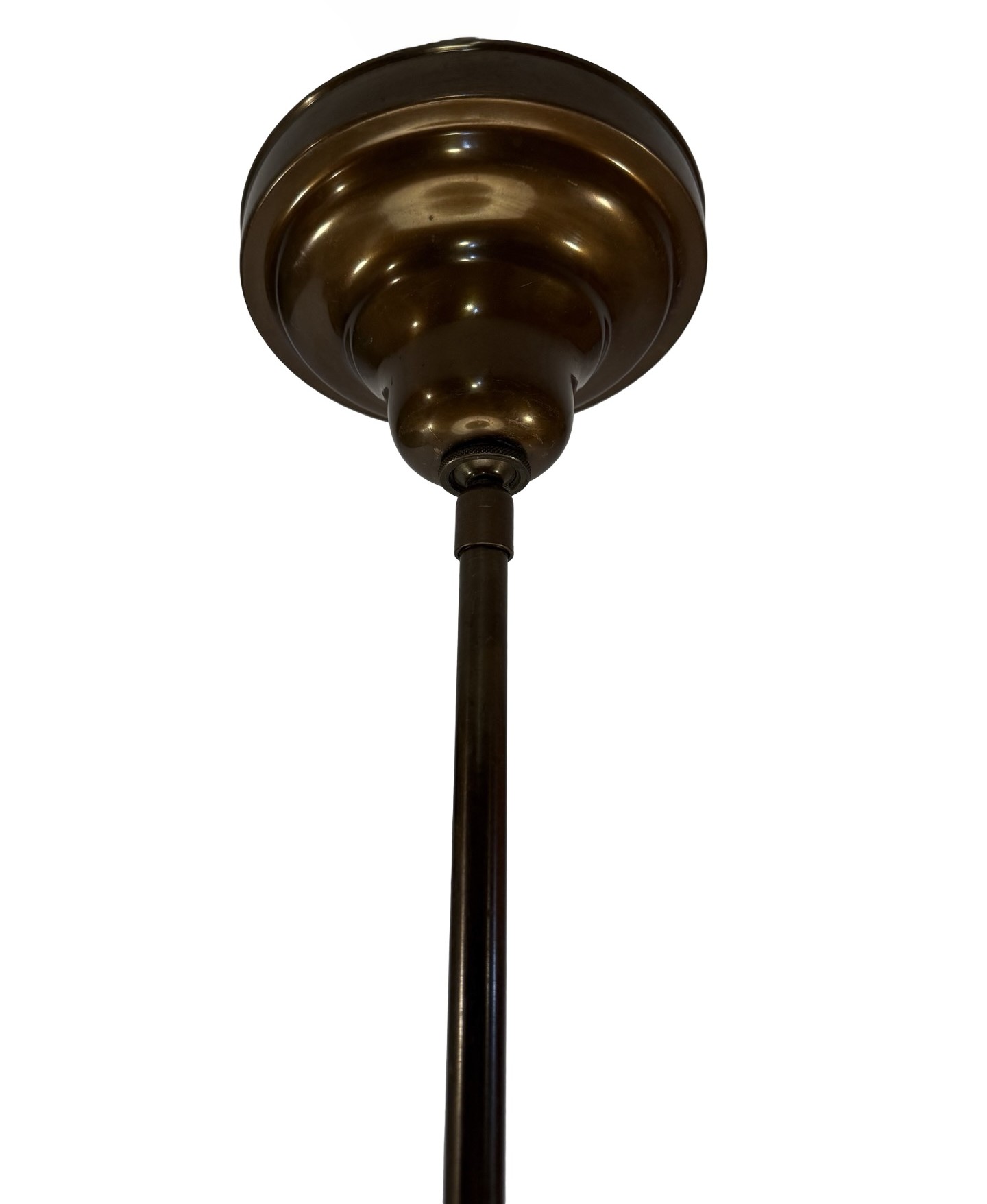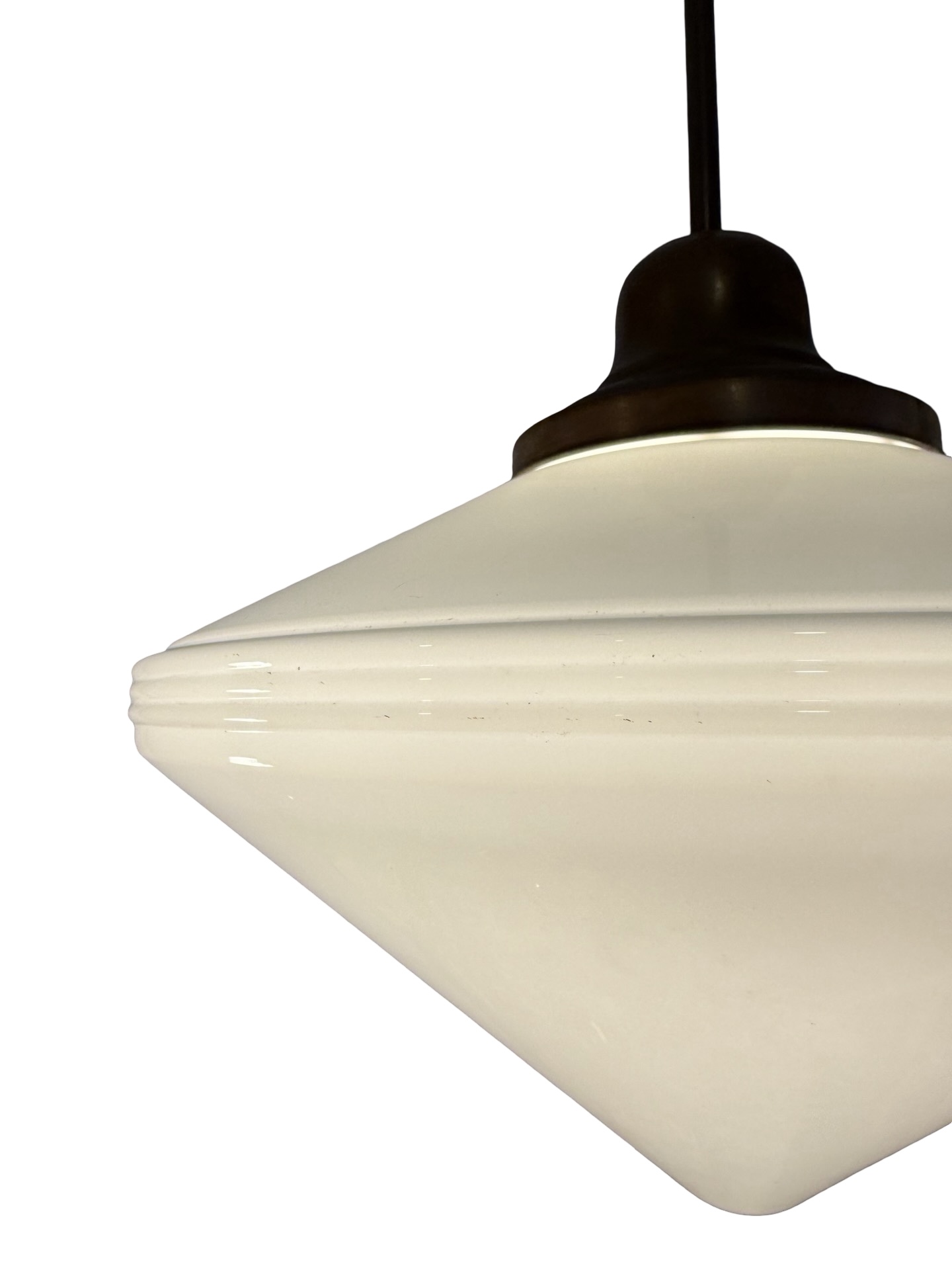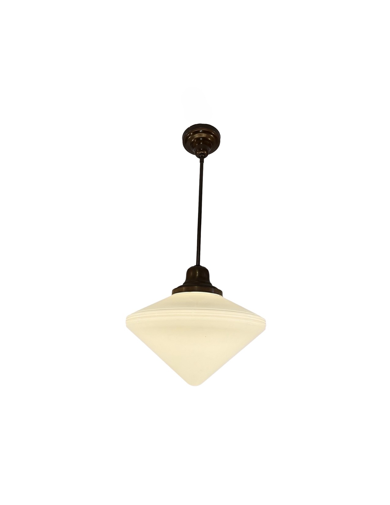 Second City Salvage is offering today this vintage c1930 brass pole pendant with a milk glass conical shade in mint condition. It measures 16″w and will drop 32″ from the ceiling once installed. The drop is not adjustable. Shade itself measures 16″w x 10″h and has a 6″ fitter and sit firmly on the collar which is basically a gravity fitter. Canopy is brass plated steel and is 5 1/2″dia. x 3″h but the down rod and fitter is brass. Patina is original and have only been lightly cleaned. We have three of these and they are priced individually, but will offer a discount if multiples are purchased by the same buyer. This light accepts a standard base bulb, will be tested and will come to you with updated wiring and a modern cross bar, ready to install. Great piece for over a kitchen island or dining area to bring a vintage school house vibe to your space!