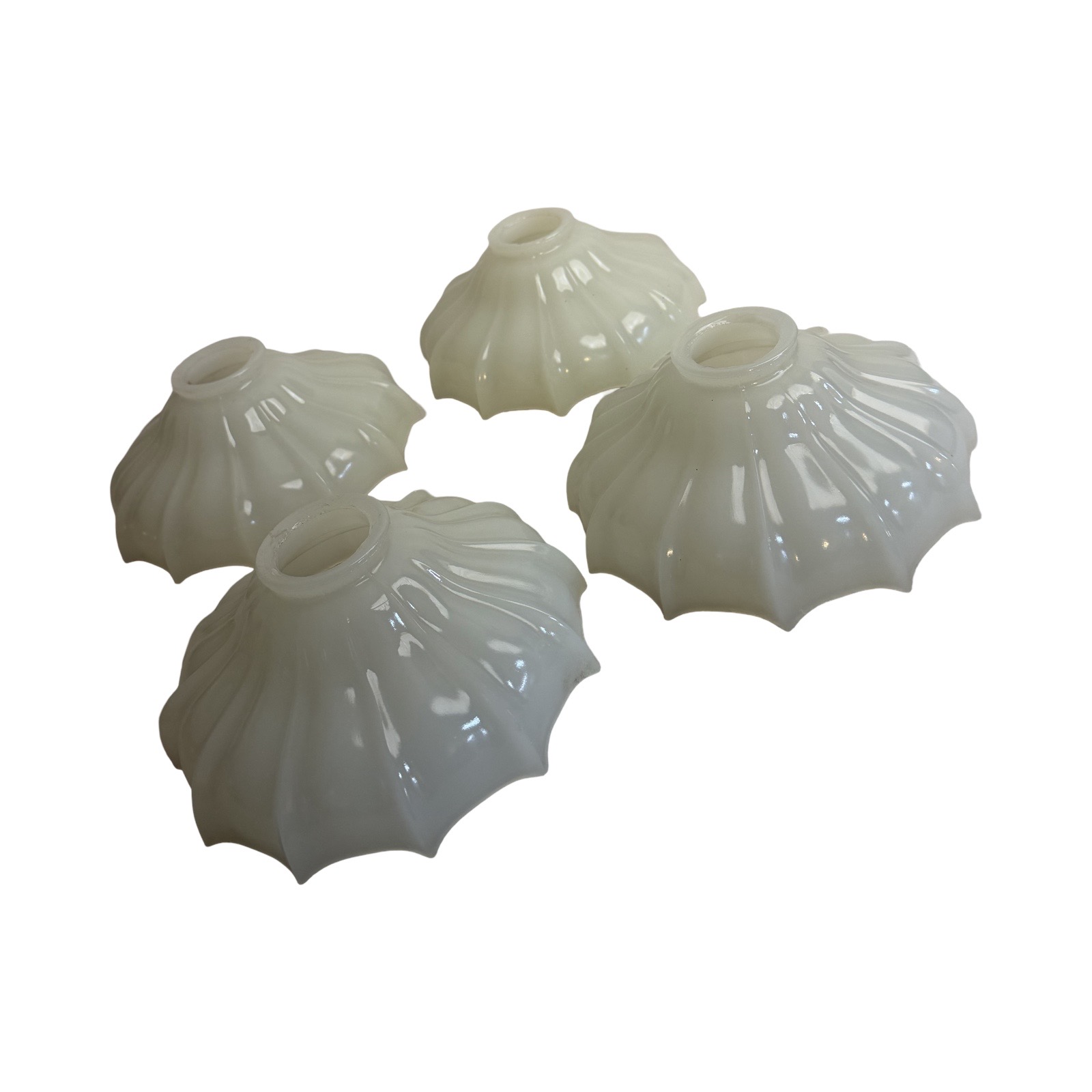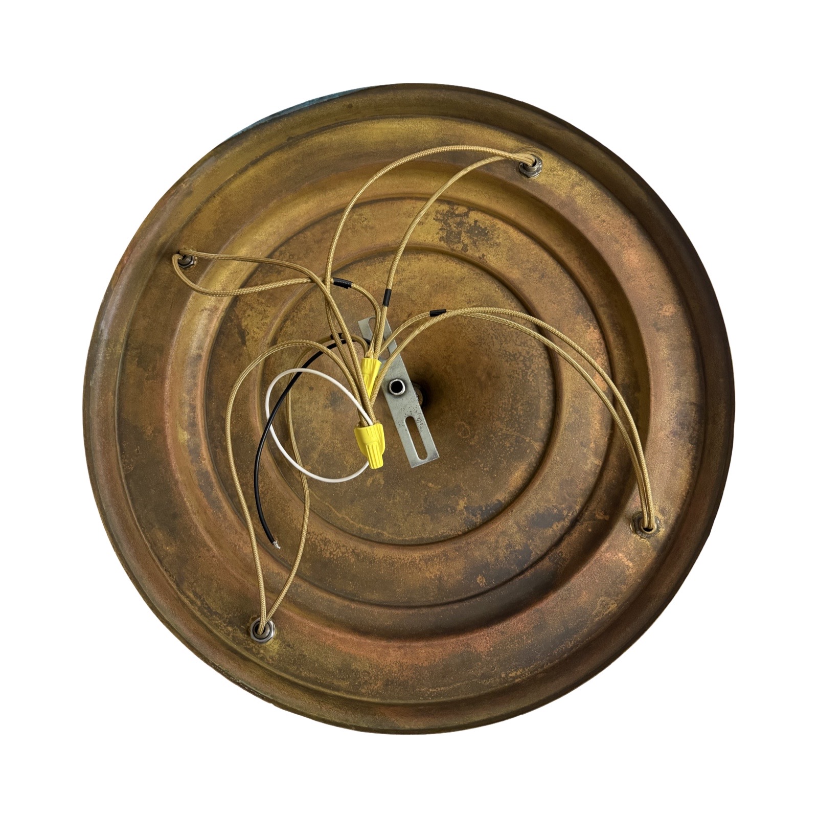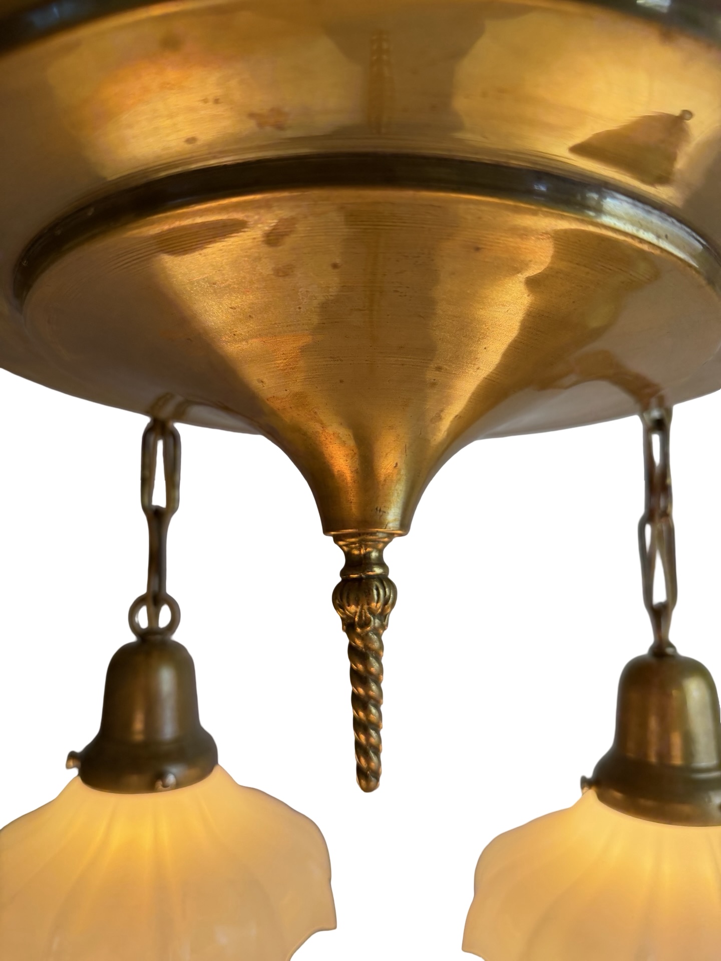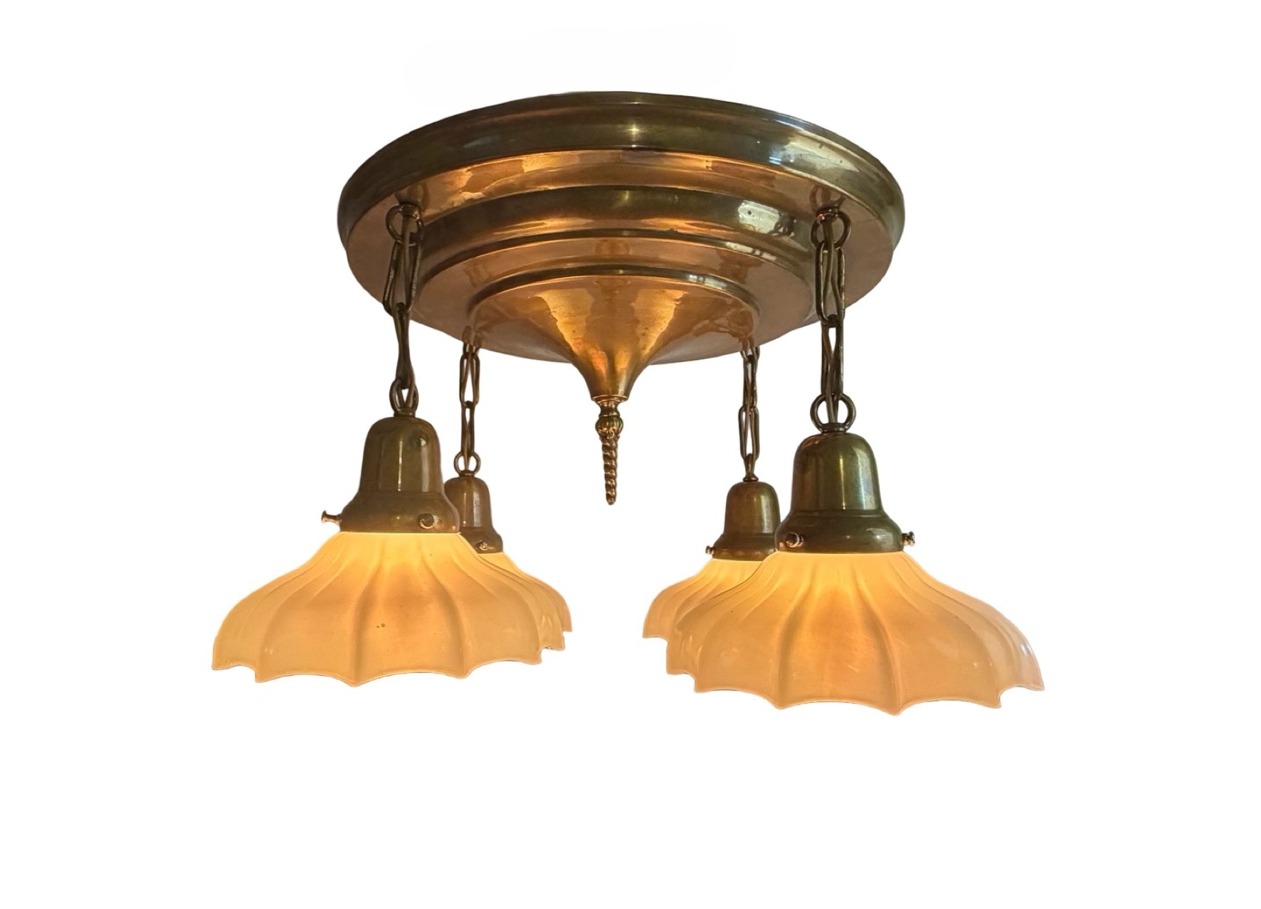 Second City Salvage is offering today this antique c1920 brass pan light that has been restored from head to toe. All components are brass and it has been rewired with period correct gold cloth wiring. The light was lacquered when received and once that was all stripped off, this is the patina that we found underneath – just beautiful. The shades are period Brascolite Sheffield style clam broth glass shades that are in mint condition. They have a mark on the edge of the fitter “TRADEMARK” and there might be another, but it is not legible. Overall, the light measures 21″w and will drop 12″ from the ceiling once installed. The pan is 15 3/4″ dia. and the shades are 7″ dia. x 3″h and have 2 ¼” fitters. The light accepts four standard base bulbs, will come to you with updated wiring and modern cross bar needed for installation.