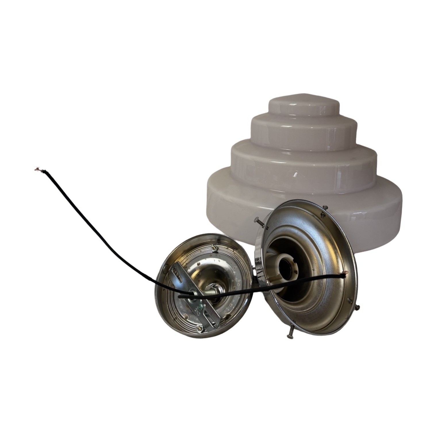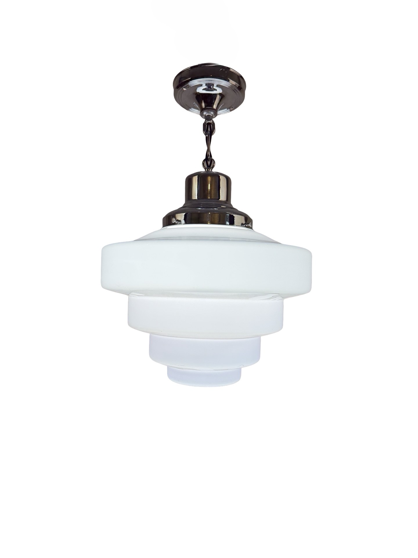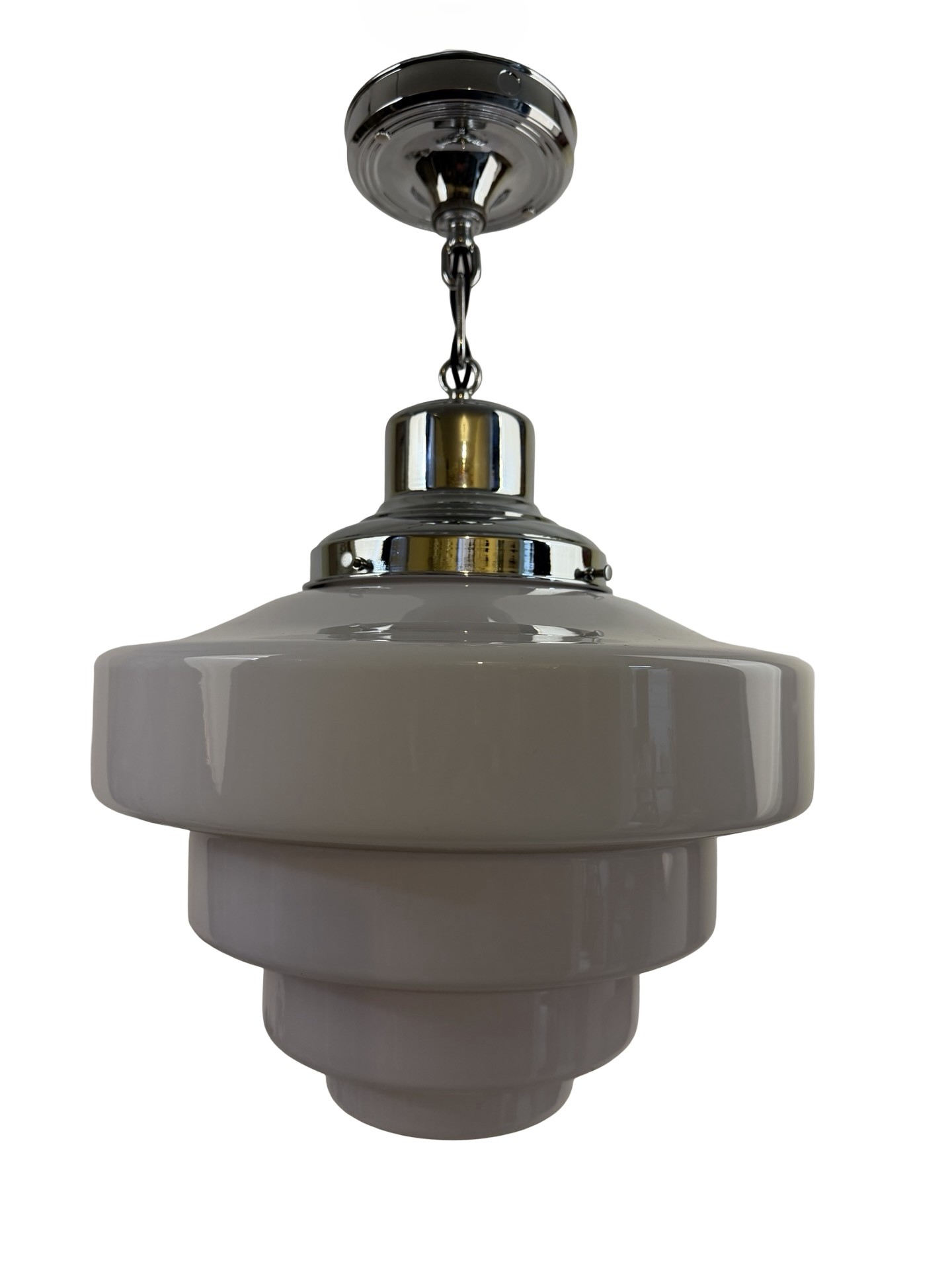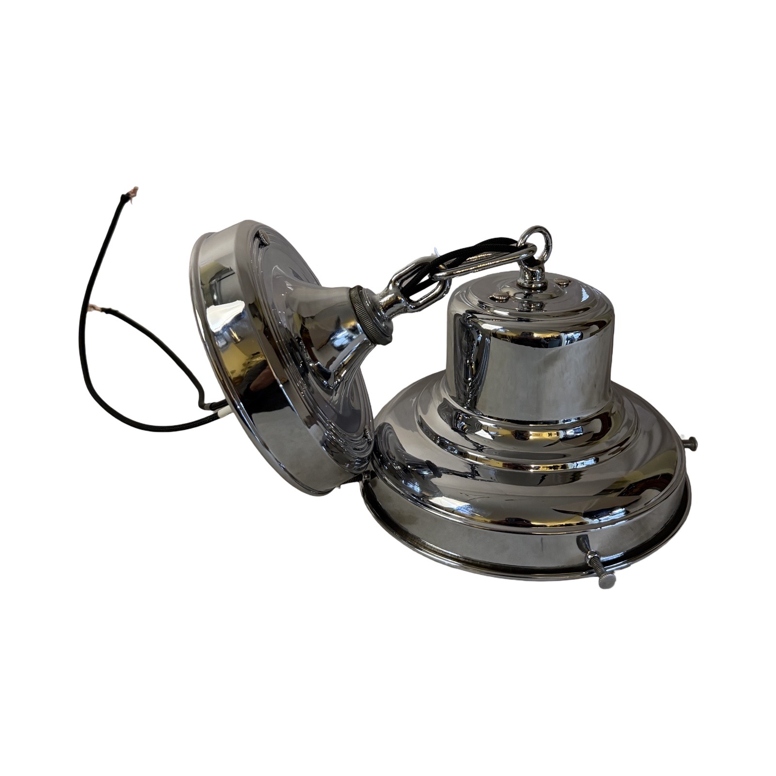 Second City Salvage is offering today this Art Deco pendant that has been replated in chrome and the price reflects that. It measures 13″w and will drop 19″ from the ceiling once installed (the height is not adjustable). The shade is big, heavy and a hefty piece in mint condition with no chips, cracks or damage otherwise. Shade alone measures 13″w x 11 ½”h, has a 6″ fitter and the milk glass itself is 1/8″ thick. The canopy is 5″ dia. x 2″h. It has the original porcelain socket which has been restored. This light accepts a standard base bulb, will come to you with period correct black cloth wiring and a modern cross bar needed for install. What a statement this light will make in your space! I’m thinking kitchen… bathroom… Wherever she lands, she’s going to WOW everyone!