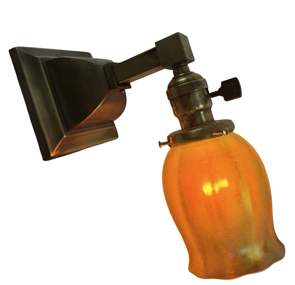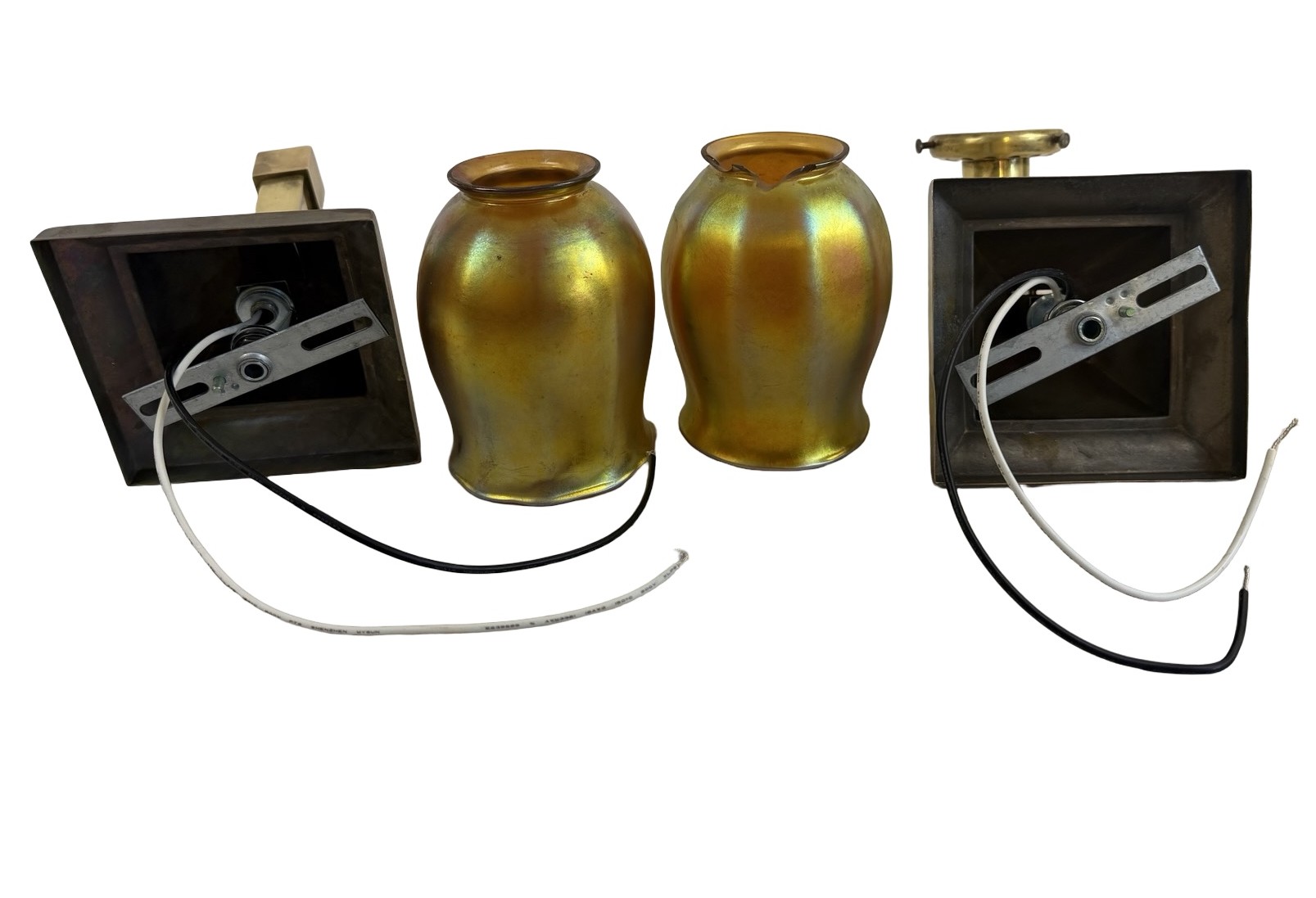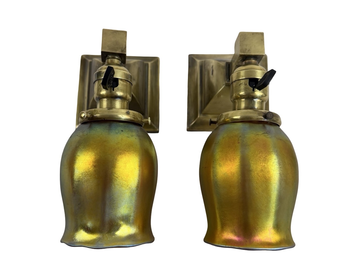 Second City Salvage is offering today this fantastic pair of c1910 brass sconces from the Arts & Crafts era. They have been paired with period Steuben art glass gold aurene shades that are both marked as such (last photo). One shade is in mint condition. The other one has two fairly large chips to the fitter, but those disappear once they are placed on the shade holder. Overall measurement is 3 1/2″w x 9 1/3″h and they will project 7″ from the wall once installed. The canopy is 4 1/2″ square x 3″h and the shades are 3 1/2″w x 5″h and have 2 ¼” fitters. The Steuben mark is worn and barely legible, but I was able to confirm through a Steuben group on line. Just fantastic and rare (hence the price). These will dress up your Arts & Crafts home like nobody’s business! We are not willing to separate this pair nor are we willing to sell the shades separately from the sconces or vice-a-versa.
