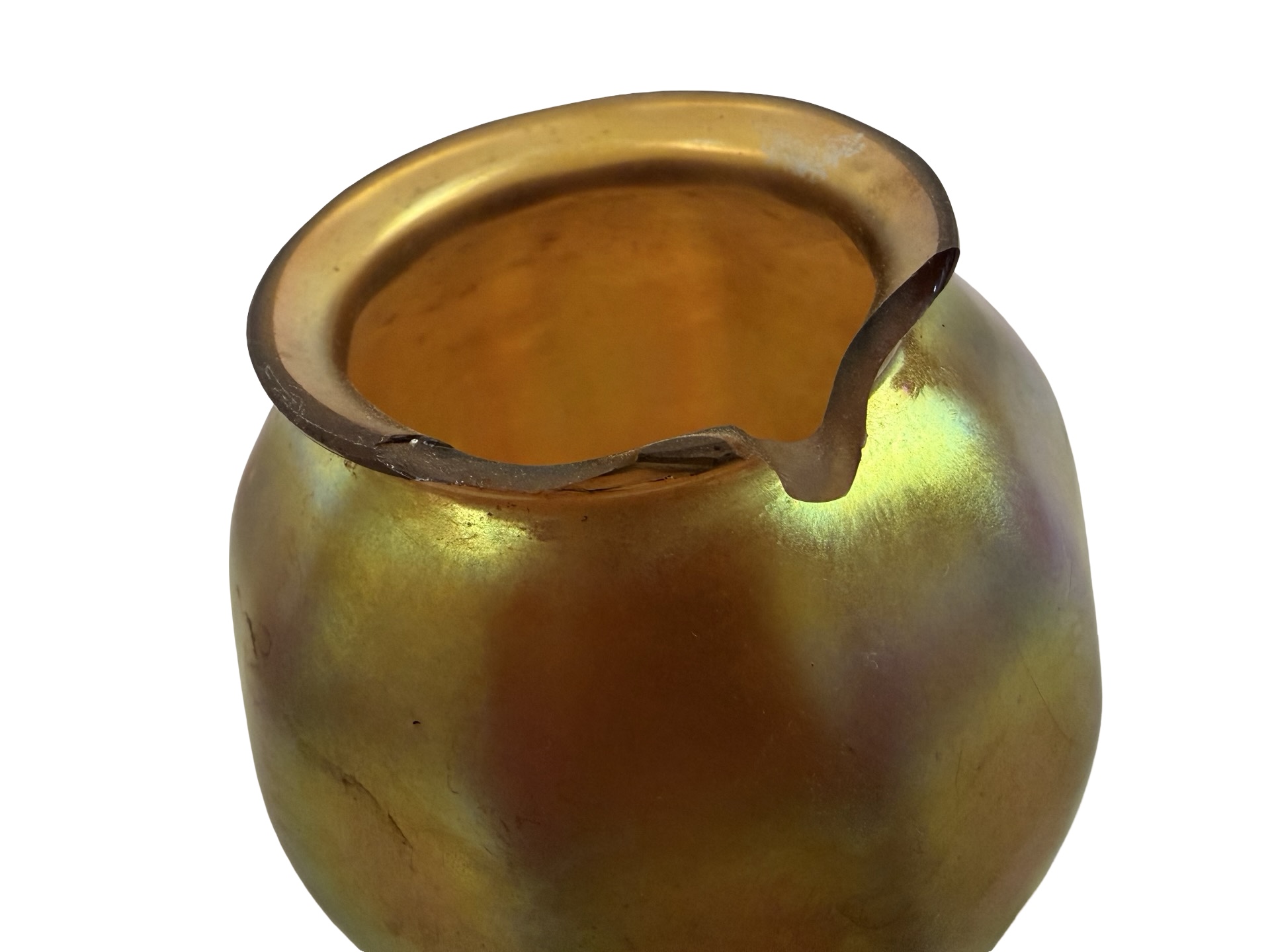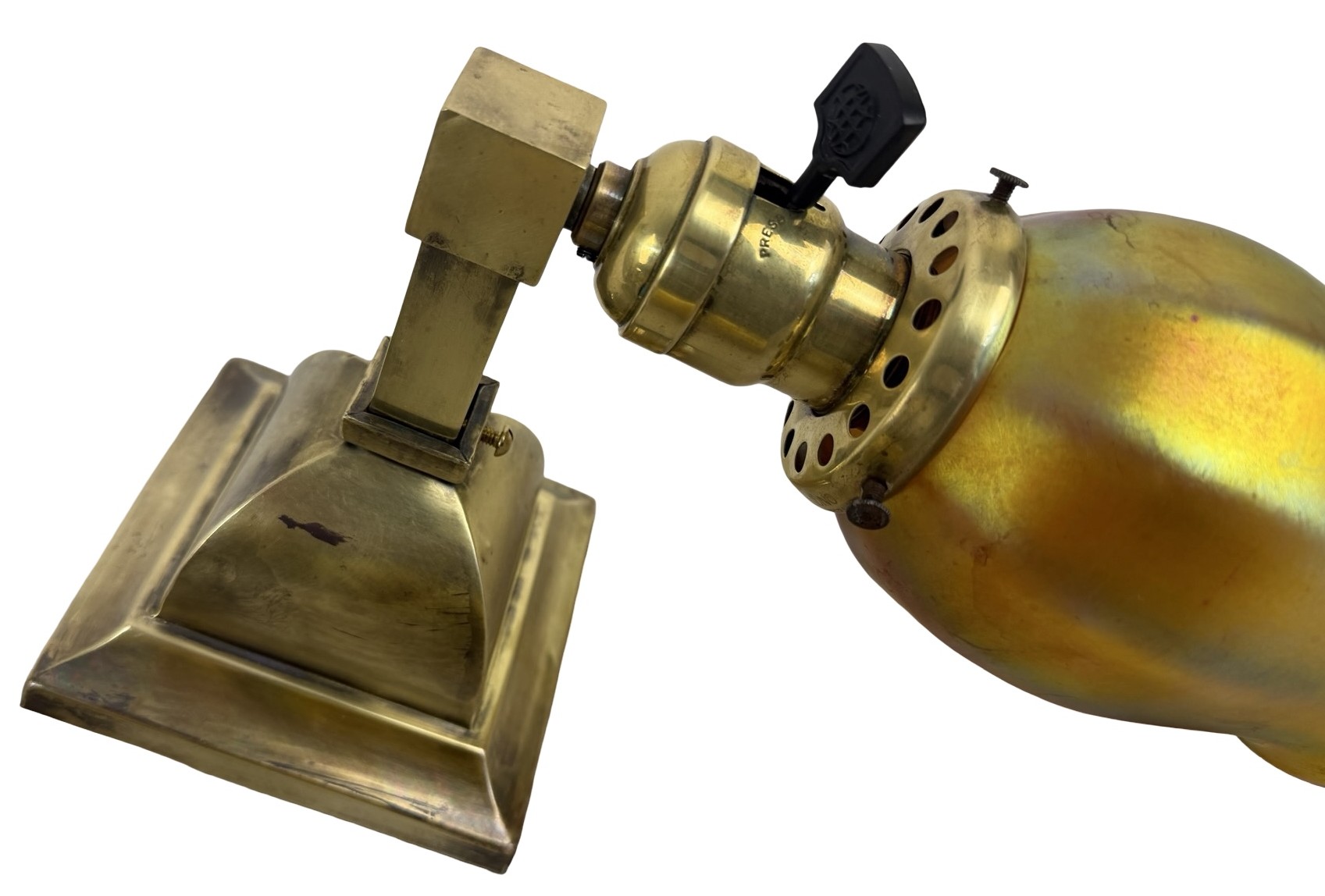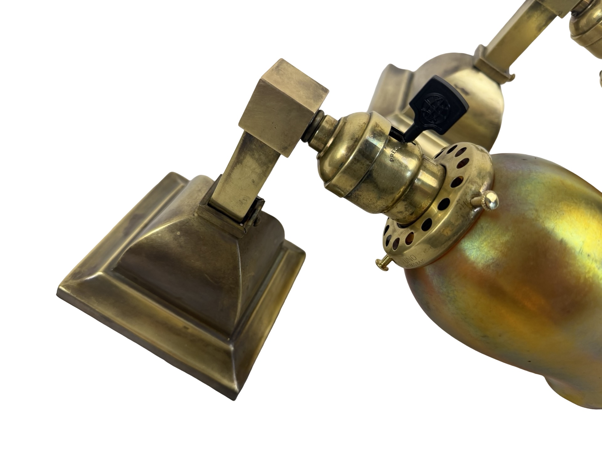 Second City Salvage is offering today this fantastic pair of c1910 brass sconces from the Arts & Crafts era. They have been paired with period Steuben art glass gold aurene shades that are both marked as such (last photo). One shade is in mint condition. The other one has two fairly large chips to the fitter, but those disappear once they are placed on the shade holder. Overall measurement is 3 1/2″w x 9 1/3″h and they will project 7″ from the wall once installed. The canopy is 4 1/2″ square x 3″h and the shades are 3 1/2″w x 5″h and have 2 ¼” fitters. The Steuben mark is worn and barely legible, but I was able to confirm through a Steuben group on line. Just fantastic and rare (hence the price). These will dress up your Arts & Crafts home like nobody’s business! We are not willing to separate this pair nor are we willing to sell the shades separately from the sconces or vice-a-versa.