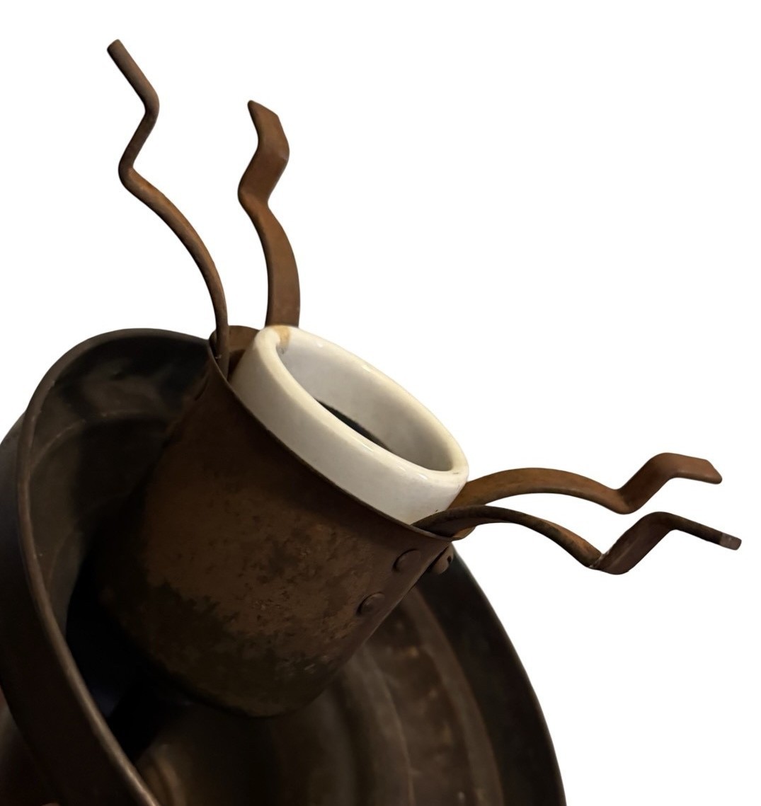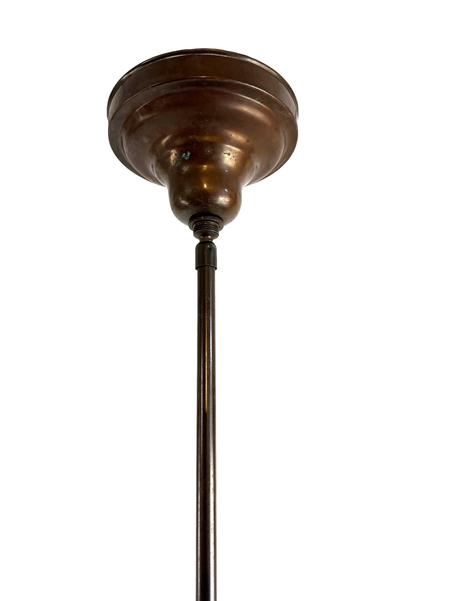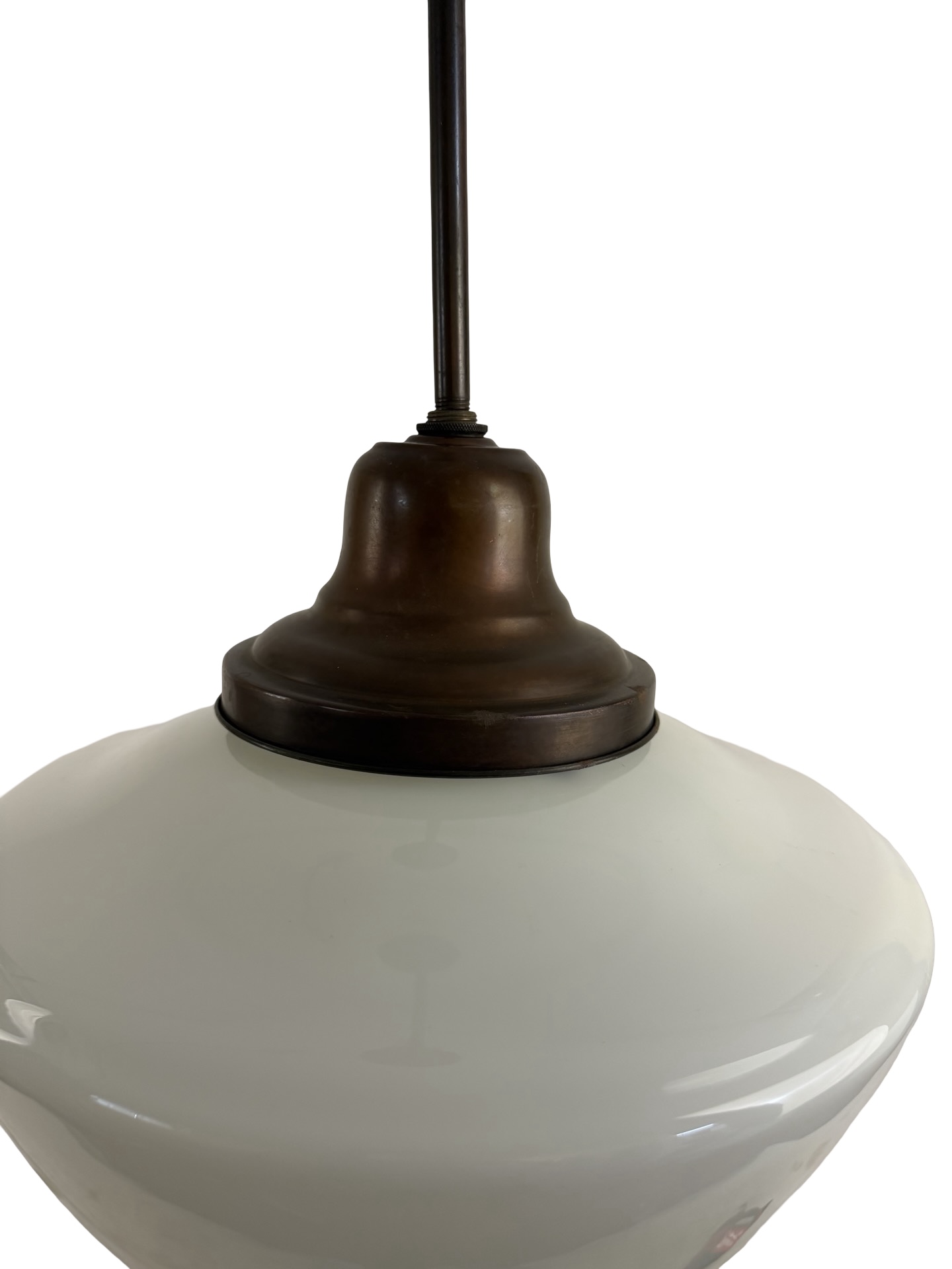 Second City Salvage is offering today this pair of vintage c1930 brass pole pendants with period milk glass school house shades in mint condition. They measure 12″w and will drop 30″ from the ceiling once installed. The drop is not adjustable. Shade itself measures 12″w x 10″h and has a 6″ fitter and sit firmly on the collar which is basically a gravity fitter. Canopies are brass plated steel and are 5 1/2″dia. x 3″h but the down rods and fitters are brass. Patina is original and have only been lightly cleaned. We have a pair of these and they are priced for the pair. We are not willing to separate them at this time. They accept a standard base bulb, will be tested and will come to you with updated wiring and a modern cross bar, ready to install. Great piece for over a kitchen island or dining area to bring a vintage school house vibe to your space!