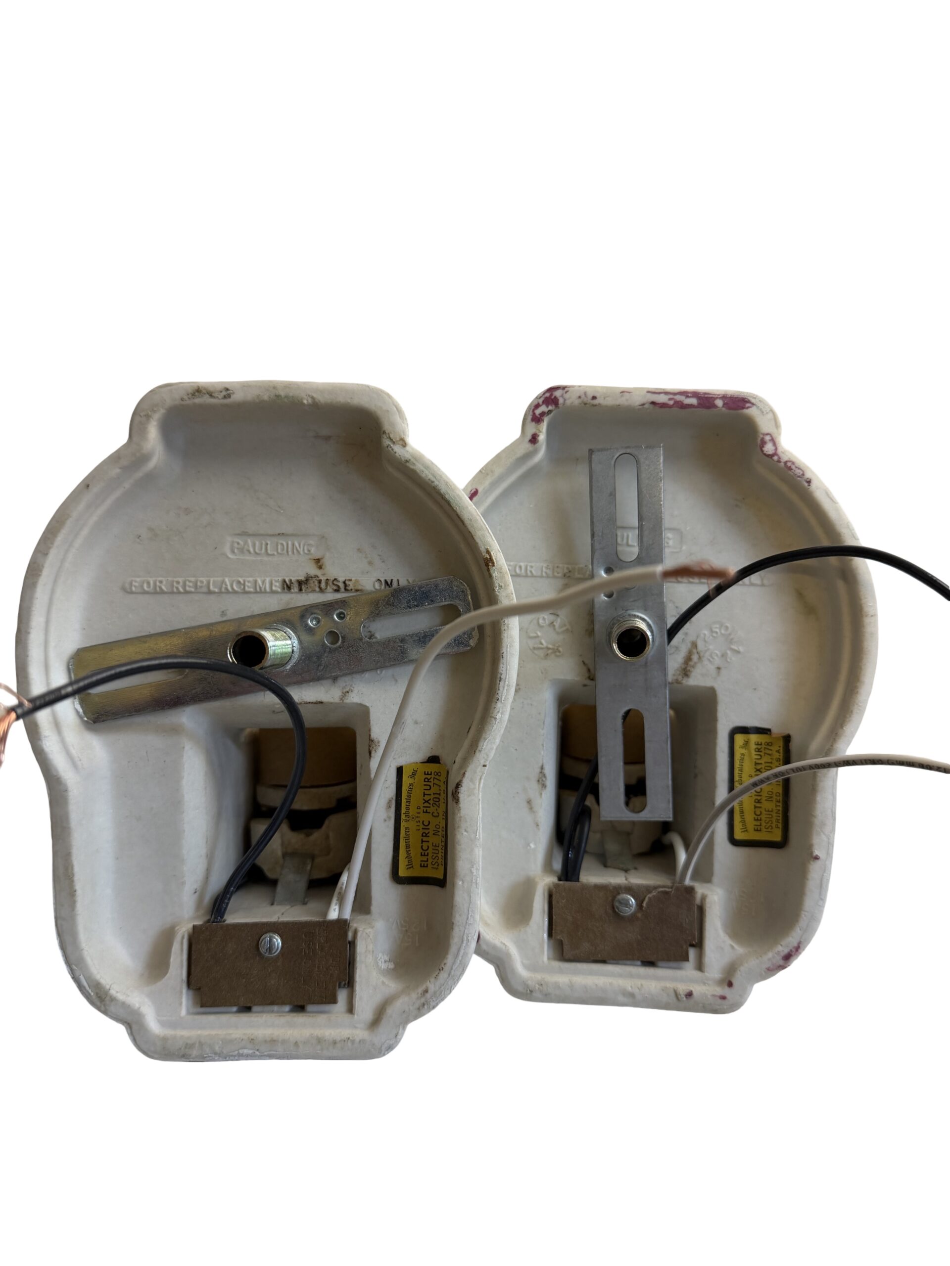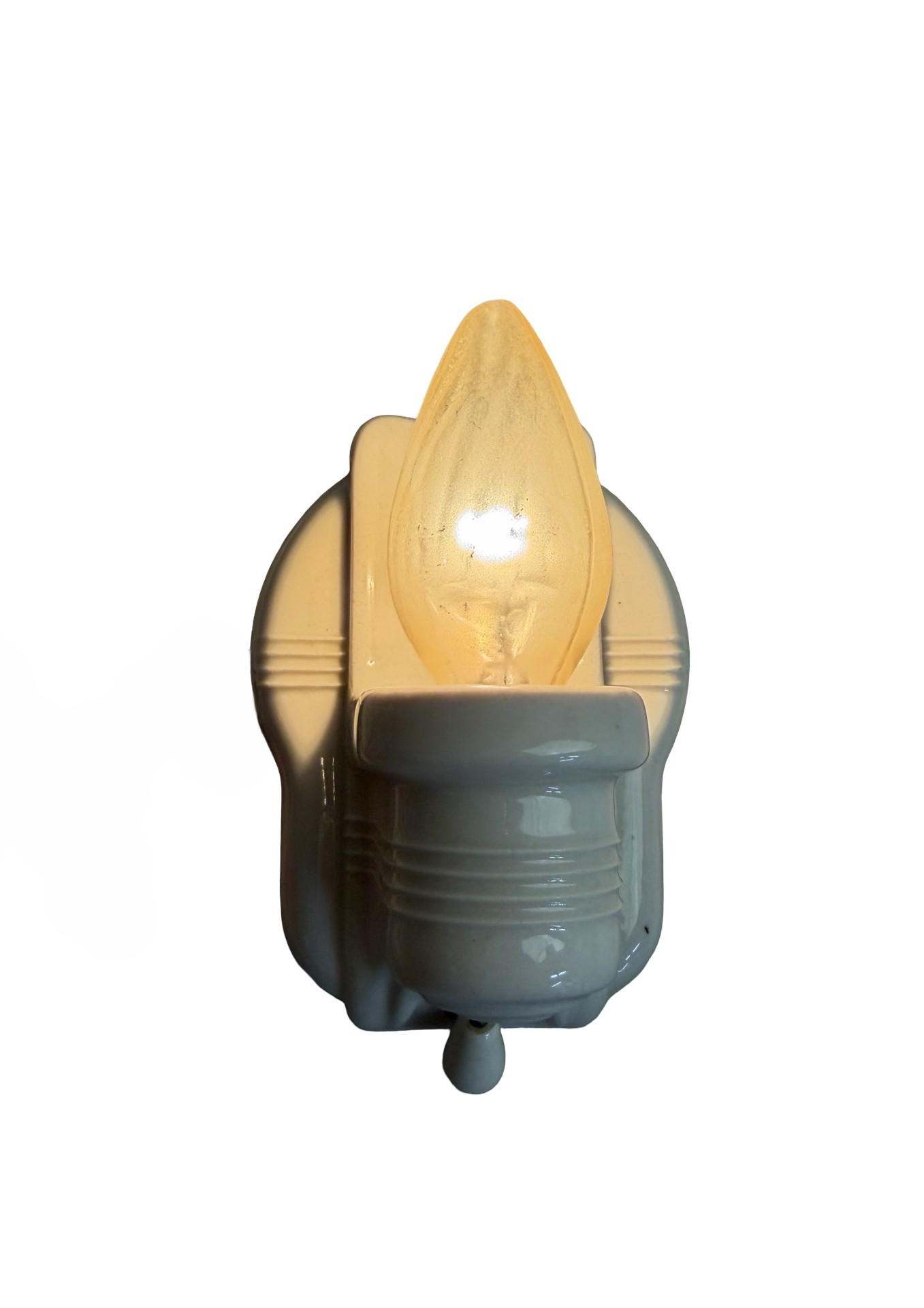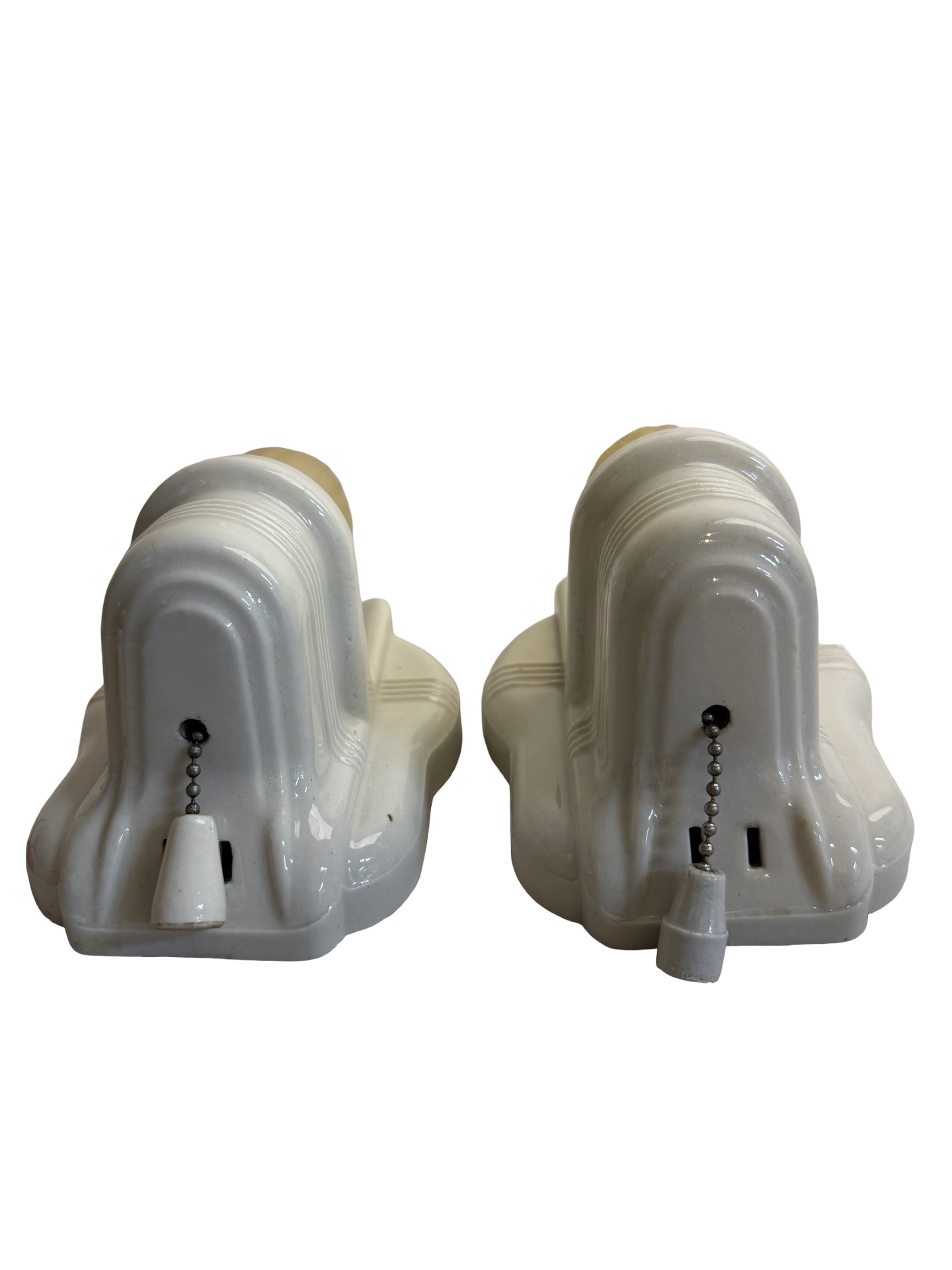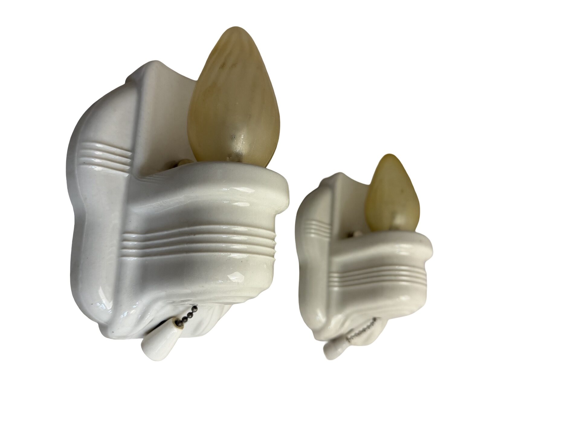 Second City Salvage is offering today this great pair of matching vintage streamline Art Deco Paulding porcelain sconces from the 1930s! This pair has been fully restored, one pull chain is functional, but the other is not, however both of the outlets are connected. They measure 4 1/2″w x 6 1/4″h and will project 4″ from the wall once installed. The sconces are in what I would consider to be mint condition with no chips, cracks or crazing. These will come with new sockets, wiring has been updated, will accept standard base bulbs (not included) and will come with modern cross bars needed for install. Price is for the pair. A very nice pair that would be great in a bathroom or kitchen!
