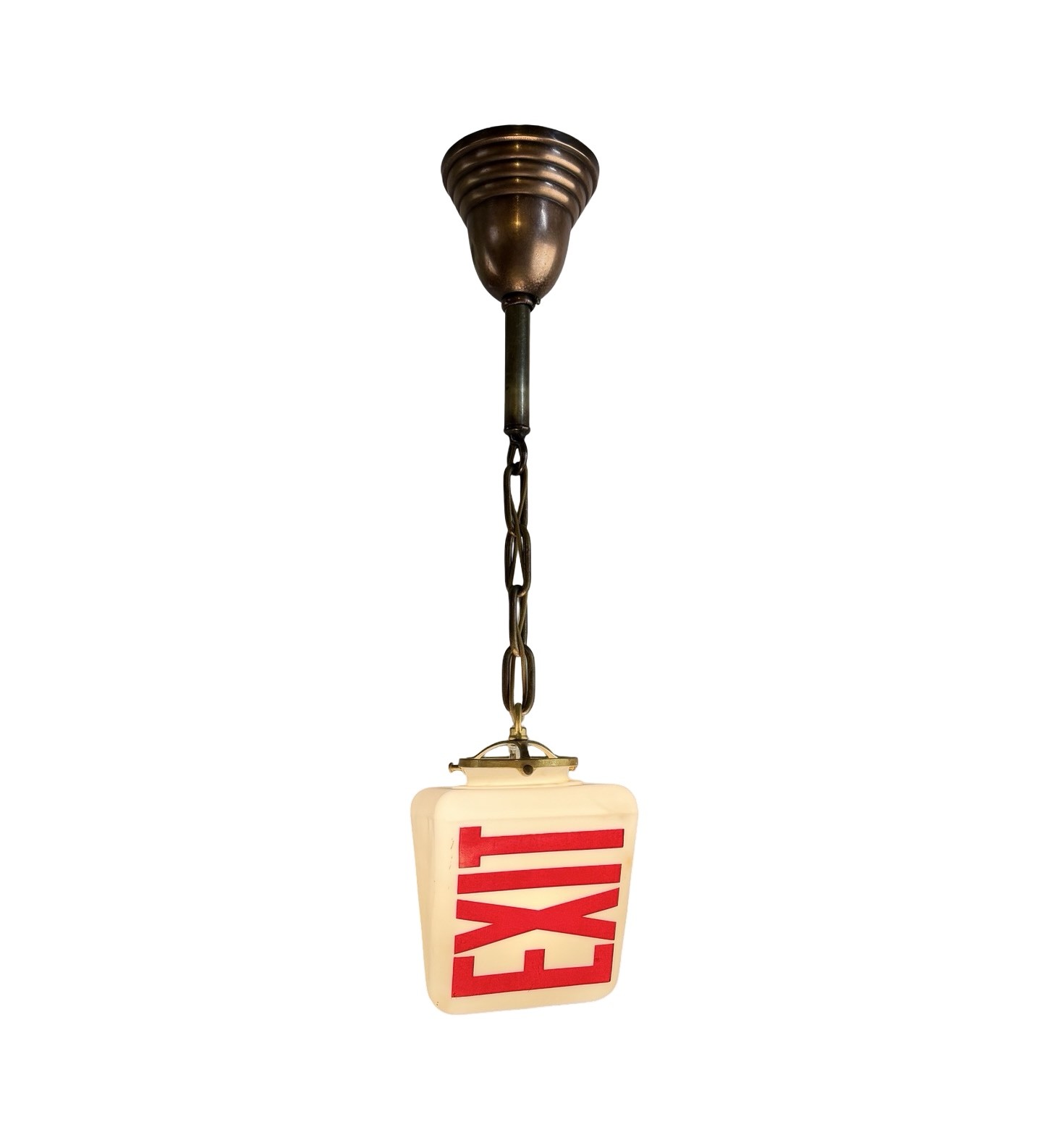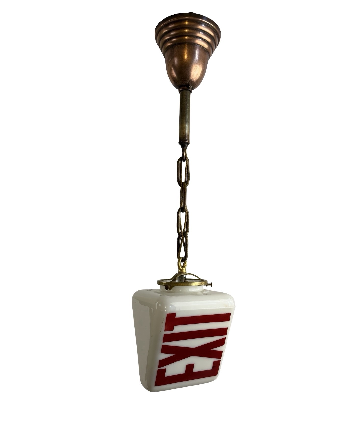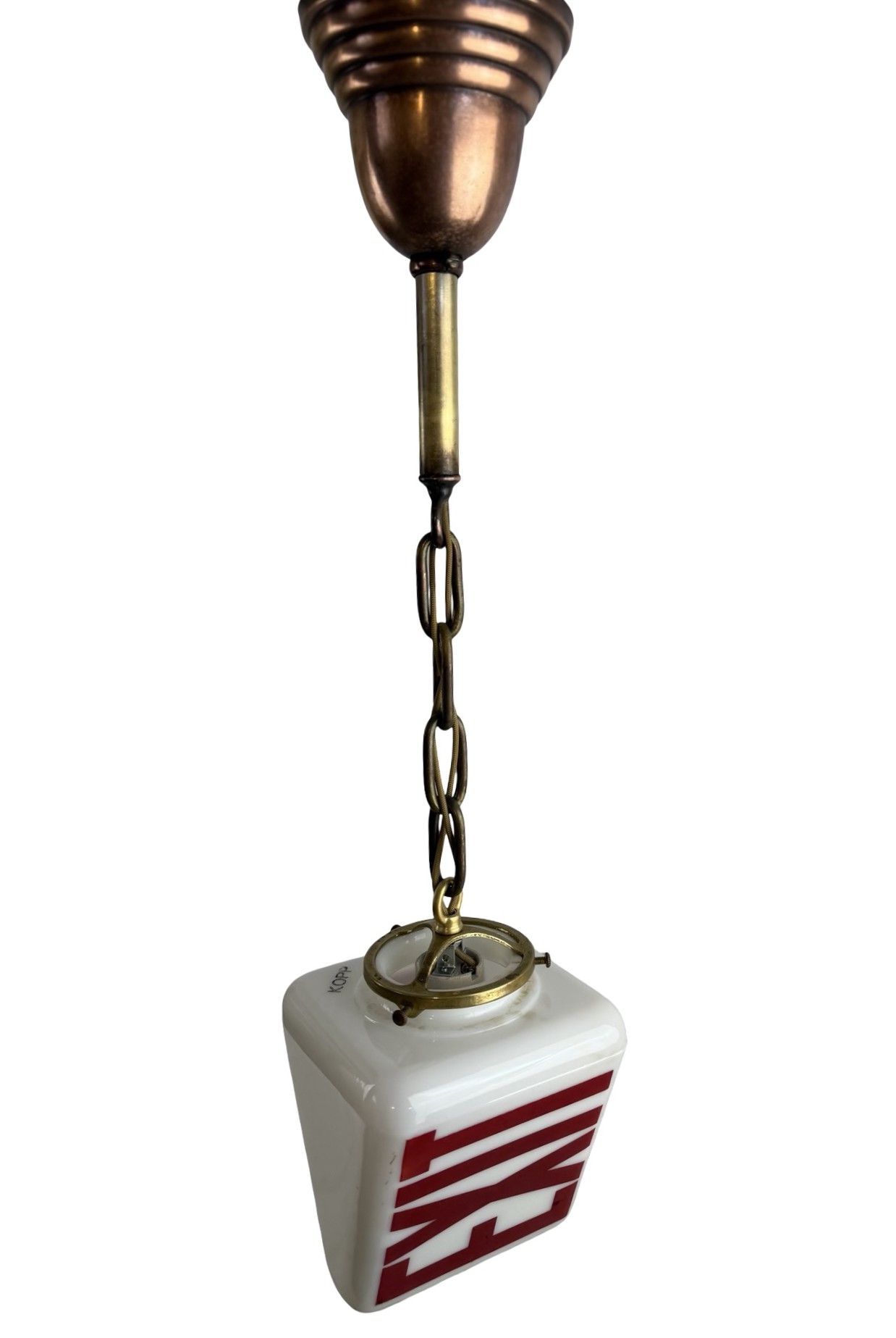 This is a double-sided white milk glass Exit ceiling light brass pendant fixture or sconce with bold red acid etched lettering (on two sides) on a cast brass shade holder/fitter and chain & canopy c1930s. It is a beefy piece and measures 5 1/2″w x 5 1/2″w and will drop 23″ from the ceiling once installed. The canopy is 4 1/2″dia. x 4″h, the shade itself is 5 1/2″w x 5 1/2″w x 6″h with a 3″ fitter and the glass is 1/8″ thick. The heavy white milk glass triangle shaped glass shade is in MINT condition with no chips or cracks, but some very minor surface scratches to the lettering which are really not notable, but I have to mention. It is marked Kopp on the underside. This light accepts a standard base bulb, has a new keyless socket, has been rewired with period correct cloth wiring and will come to you with a modern cross bar needed for install.