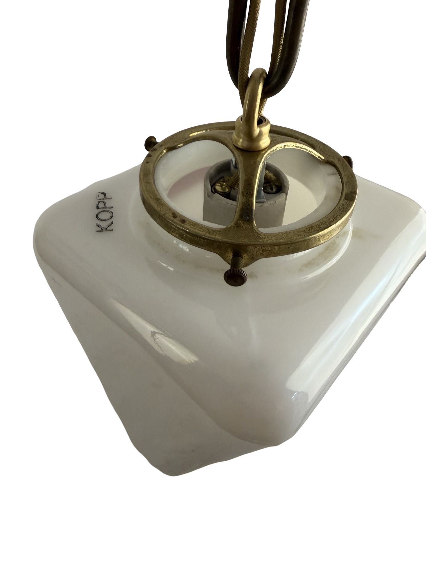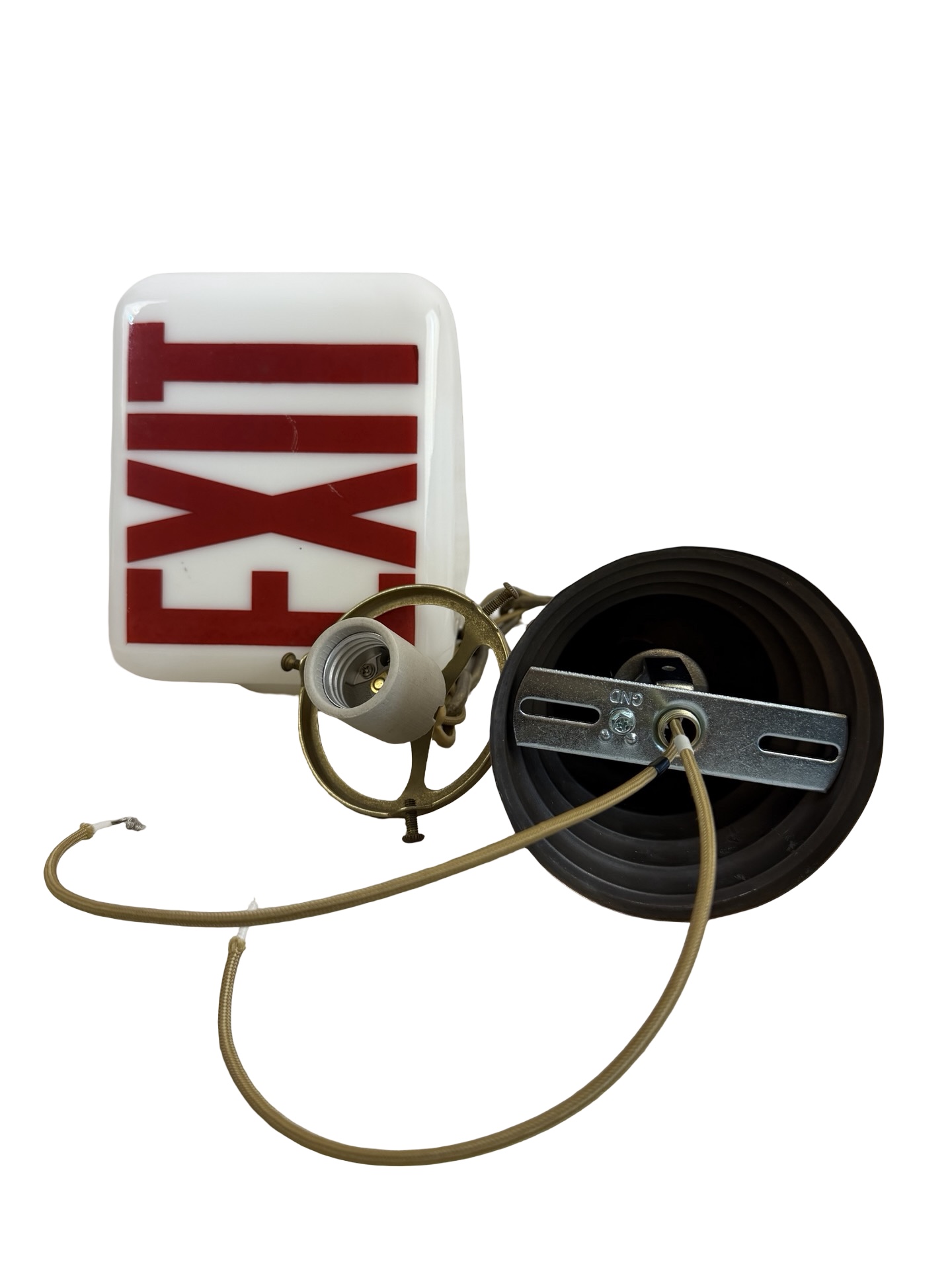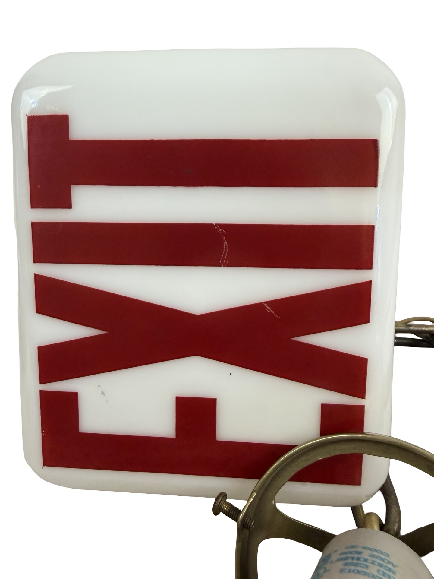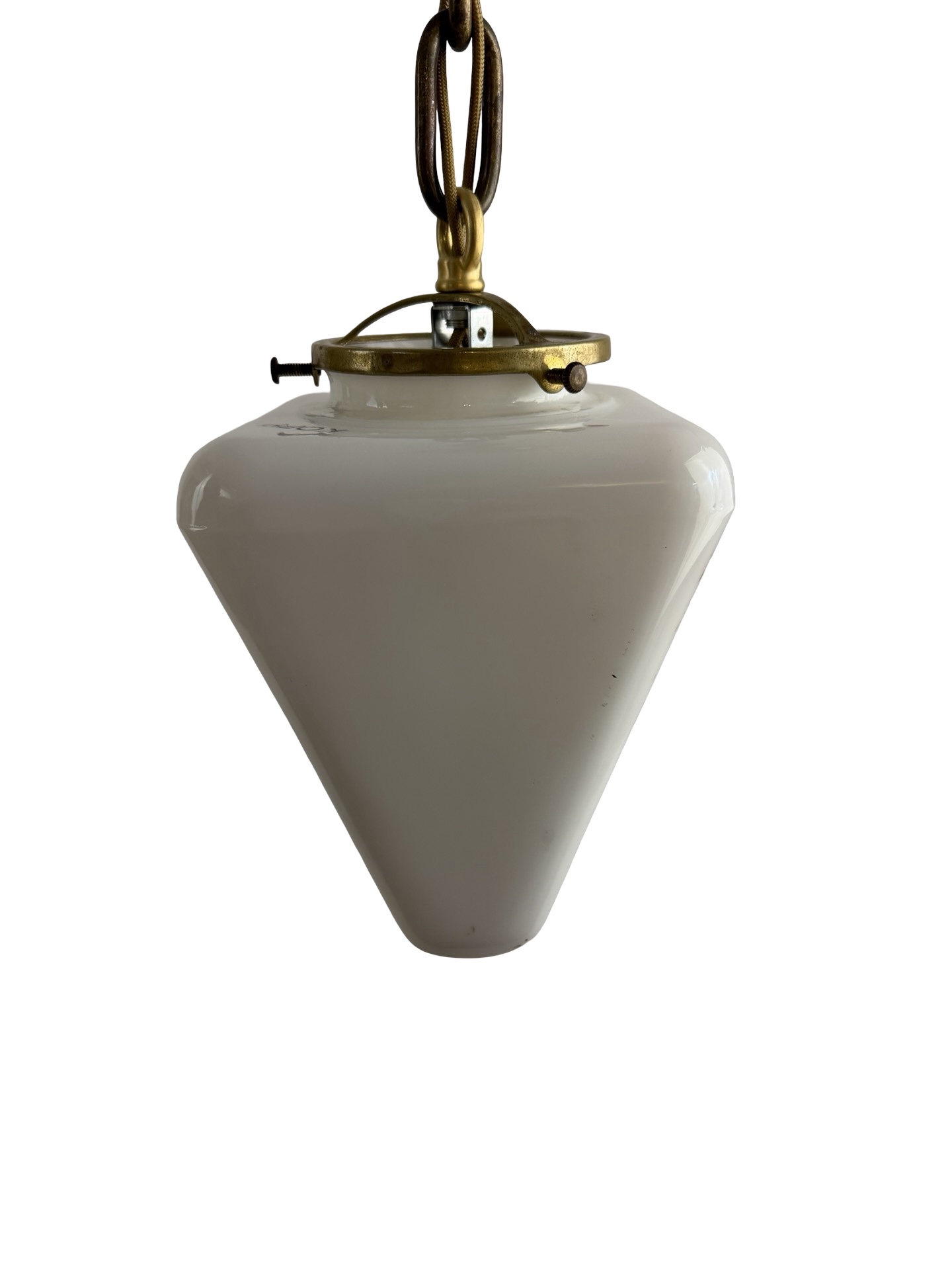 This is a double-sided white milk glass Exit ceiling light brass pendant fixture or sconce with bold red acid etched lettering (on two sides) on a cast brass shade holder/fitter and chain & canopy c1930s. It is a beefy piece and measures 5 1/2″w x 5 1/2″w and will drop 23″ from the ceiling once installed. The canopy is 4 1/2″dia. x 4″h, the shade itself is 5 1/2″w x 5 1/2″w x 6″h with a 3″ fitter and the glass is 1/8″ thick. The heavy white milk glass triangle shaped glass shade is in MINT condition with no chips or cracks, but some very minor surface scratches to the lettering which are really not notable, but I have to mention. It is marked Kopp on the underside. This light accepts a standard base bulb, has a new keyless socket, has been rewired with period correct cloth wiring and will come to you with a modern cross bar needed for install.
