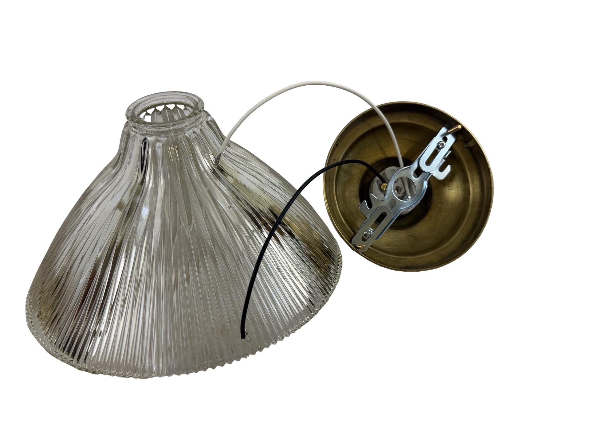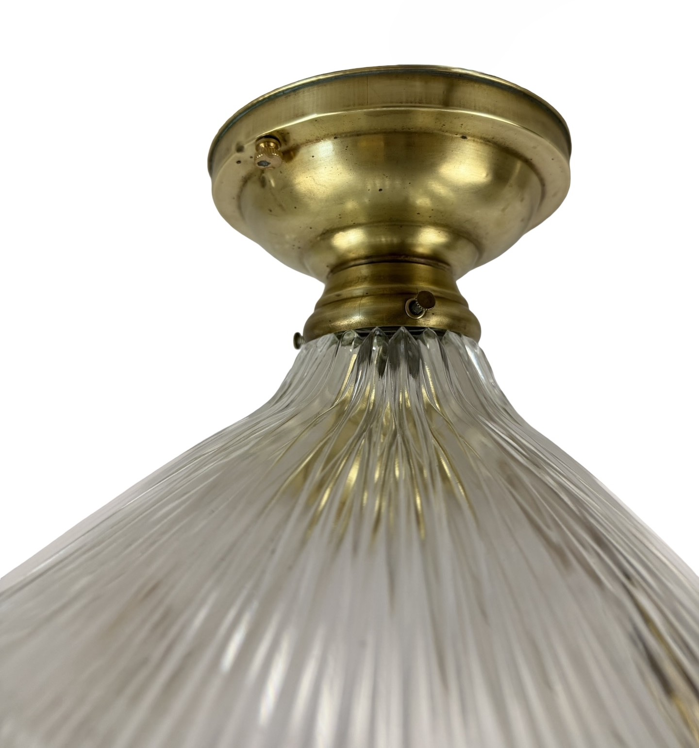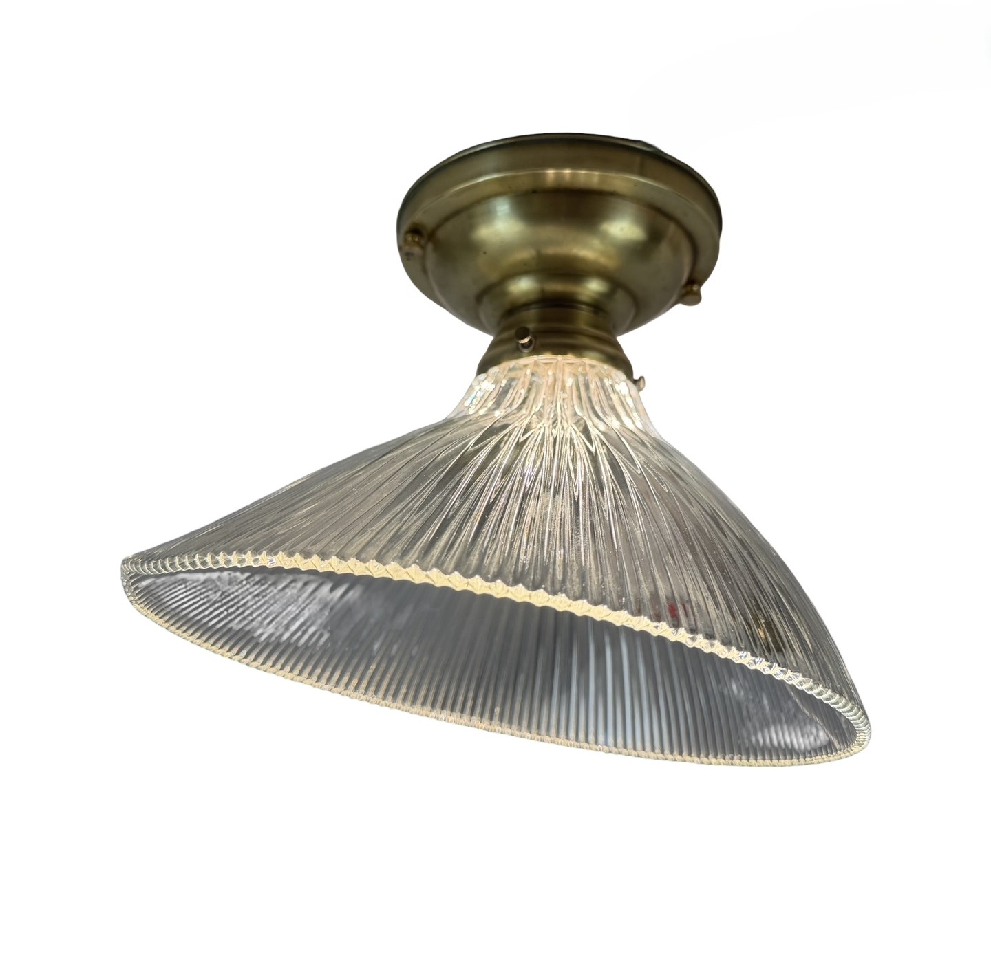 Second City Salvage is offering today this way cool semi-flush mount fixture with a large angled offset Holophane shade that is in mint condition. Unbelieveable that this shade has managed to survive this long without a single chip to the ribs! It is literally perfect. Overall measurement is 10″ dia. and it will drop 9″ from the ceiling once installed. The shade itself is 10″ dia. x 5 1/2″h and has a 2 1/4″ fitter. It is marked HOLOPHANE USA PAT OCT 29 1912. Canopy is 5 ½” dia. x 3″h. It would be a great light for a darker space as these shades throw out a TON of light. Pair it with an Edison bulb for a cool vintage look and the bonus is that the shade does not need to be removed in order to change the bulb.