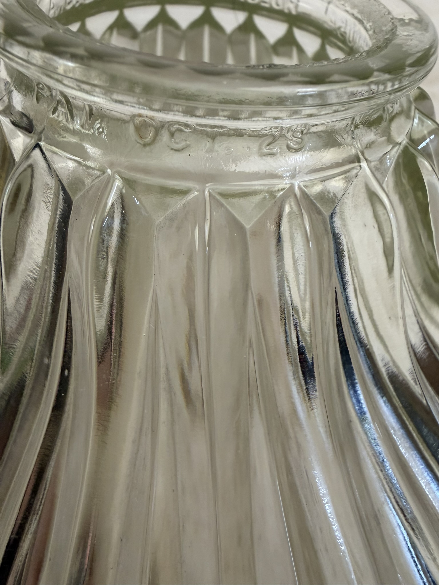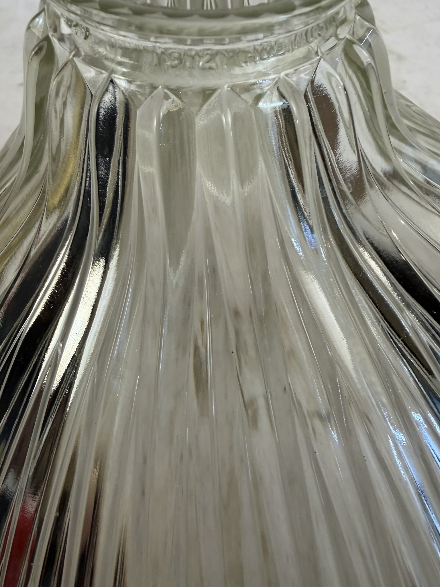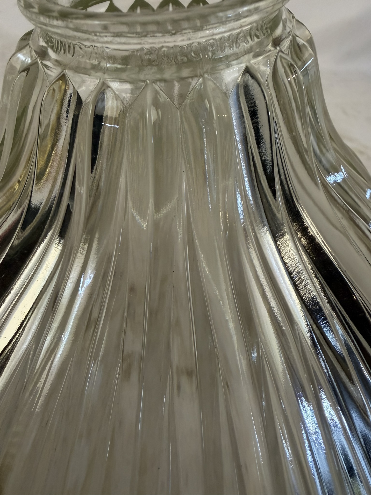 Second City Salvage is offering today this way cool semi-flush mount fixture with a large angled offset Holophane shade that is in mint condition. Unbelieveable that this shade has managed to survive this long without a single chip to the ribs! It is literally perfect. Overall measurement is 10″ dia. and it will drop 9″ from the ceiling once installed. The shade itself is 10″ dia. x 5 1/2″h and has a 2 1/4″ fitter. It is marked HOLOPHANE USA PAT OCT 29 1912. Canopy is 5 ½” dia. x 3″h. It would be a great light for a darker space as these shades throw out a TON of light. Pair it with an Edison bulb for a cool vintage look and the bonus is that the shade does not need to be removed in order to change the bulb.