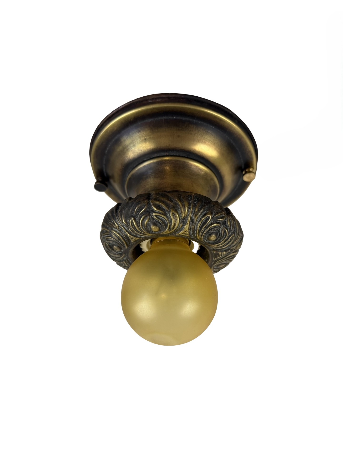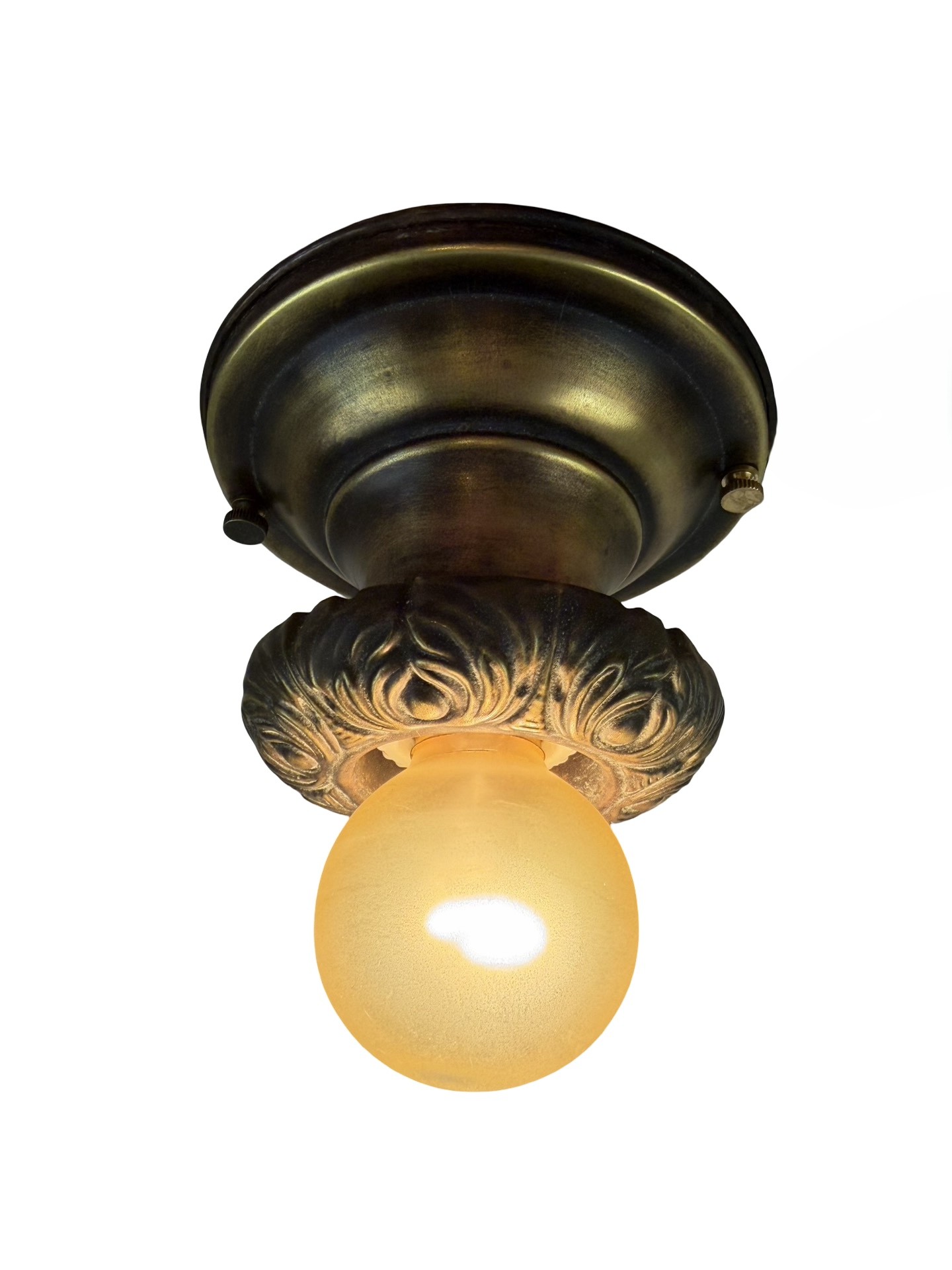 Second City Salvage is offering today this great old c1920 semi-flush mount ceiling light in brass with an acanthus leaf pattern. It is in mint condition and the dark patina is original and has only been lightly cleaned. It measures 5″ dia. at the base and will drop 3″ from the ceiling once installed (add 2 1/2″ for the bulb shown – not included). Perfect for a smaller space, especially if you are a tall person with lower ceilings! It will come to you with updated wiring, accepts a modern standard base bulb and a modern bracket needed for installation.