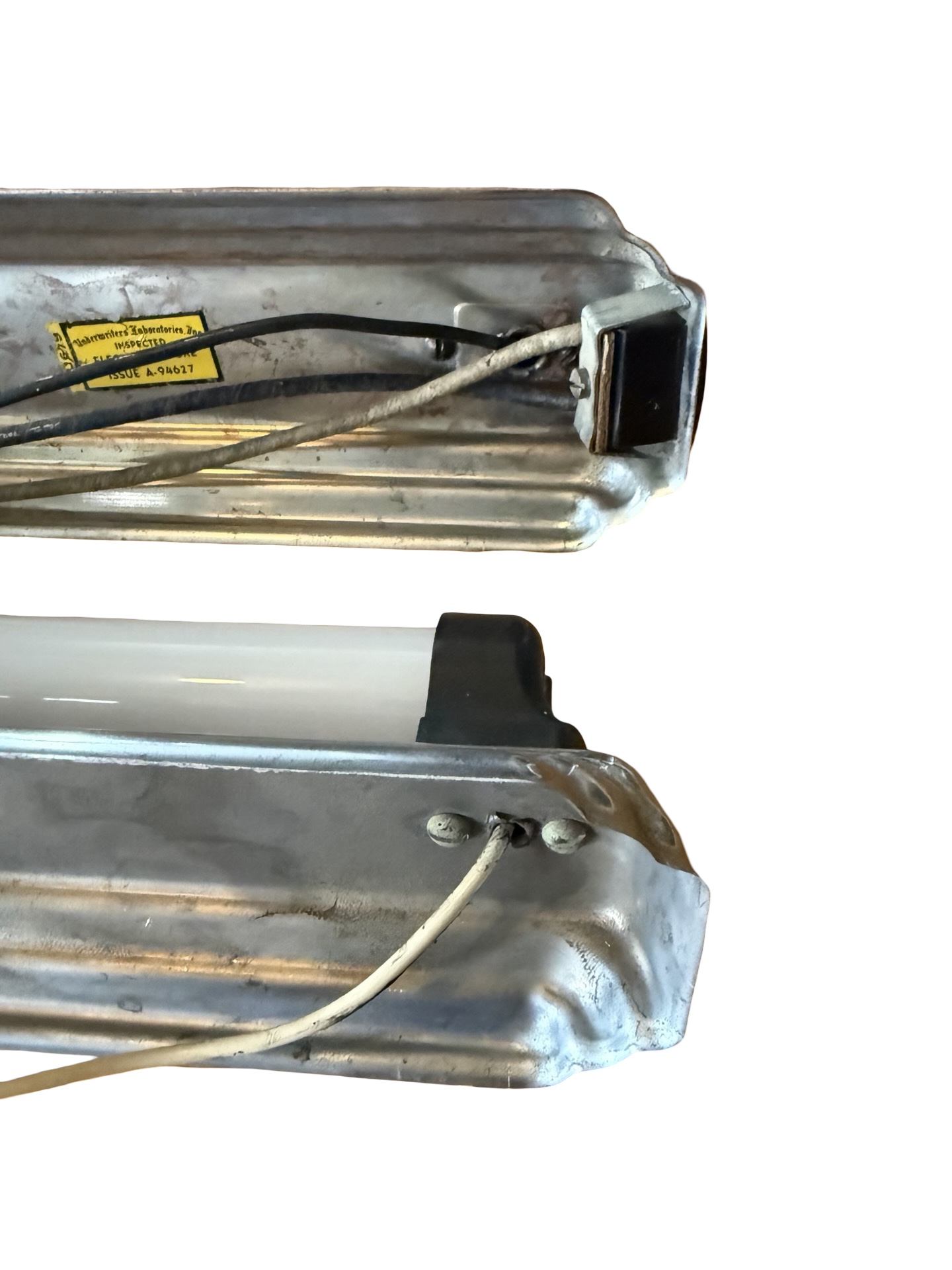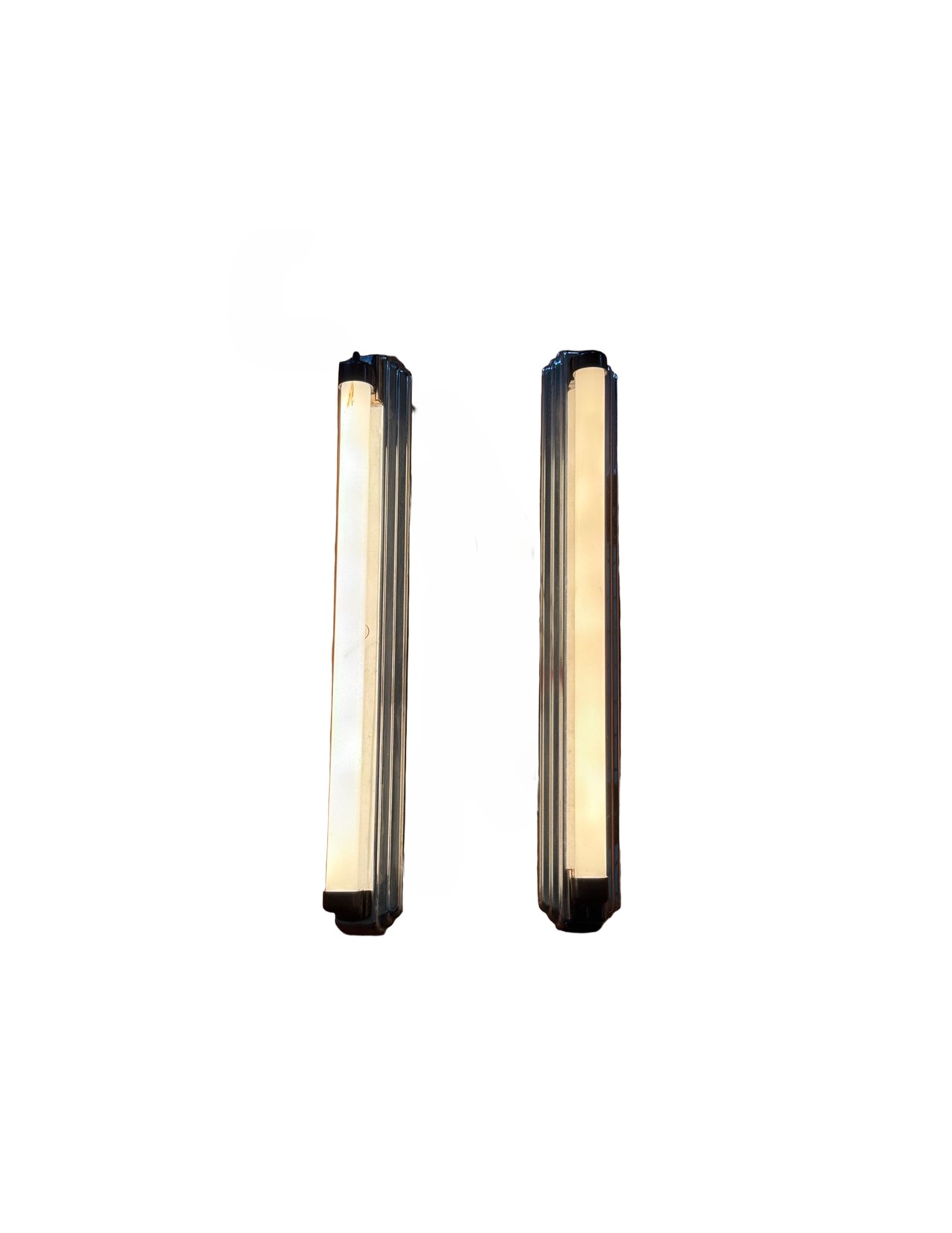 Second City Salvage is offering today this amazing pair of Lumiline sconces c1940 on chrome canopies. Here are the specs! 17 5/8 Lumiline bulb, Canopy 2 7/8″w x 20 3/8″h x 2 3/8″ projection. Mounting hardware included (requires a switch box in the wall). Each has an on off switch. One has a plug and one does not. Original wiring. 3rd bulb included. These are being sold as is/as shown. Add a retro vibe to your otherwise really boring space!
