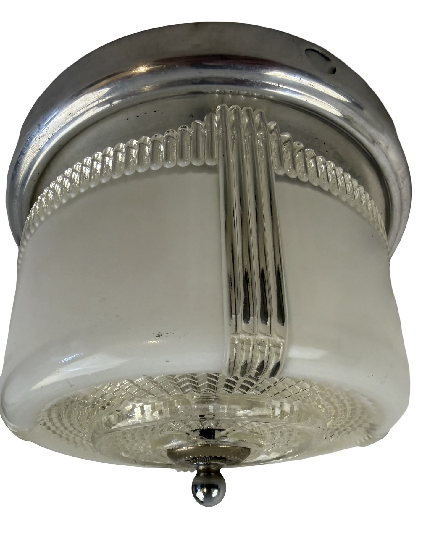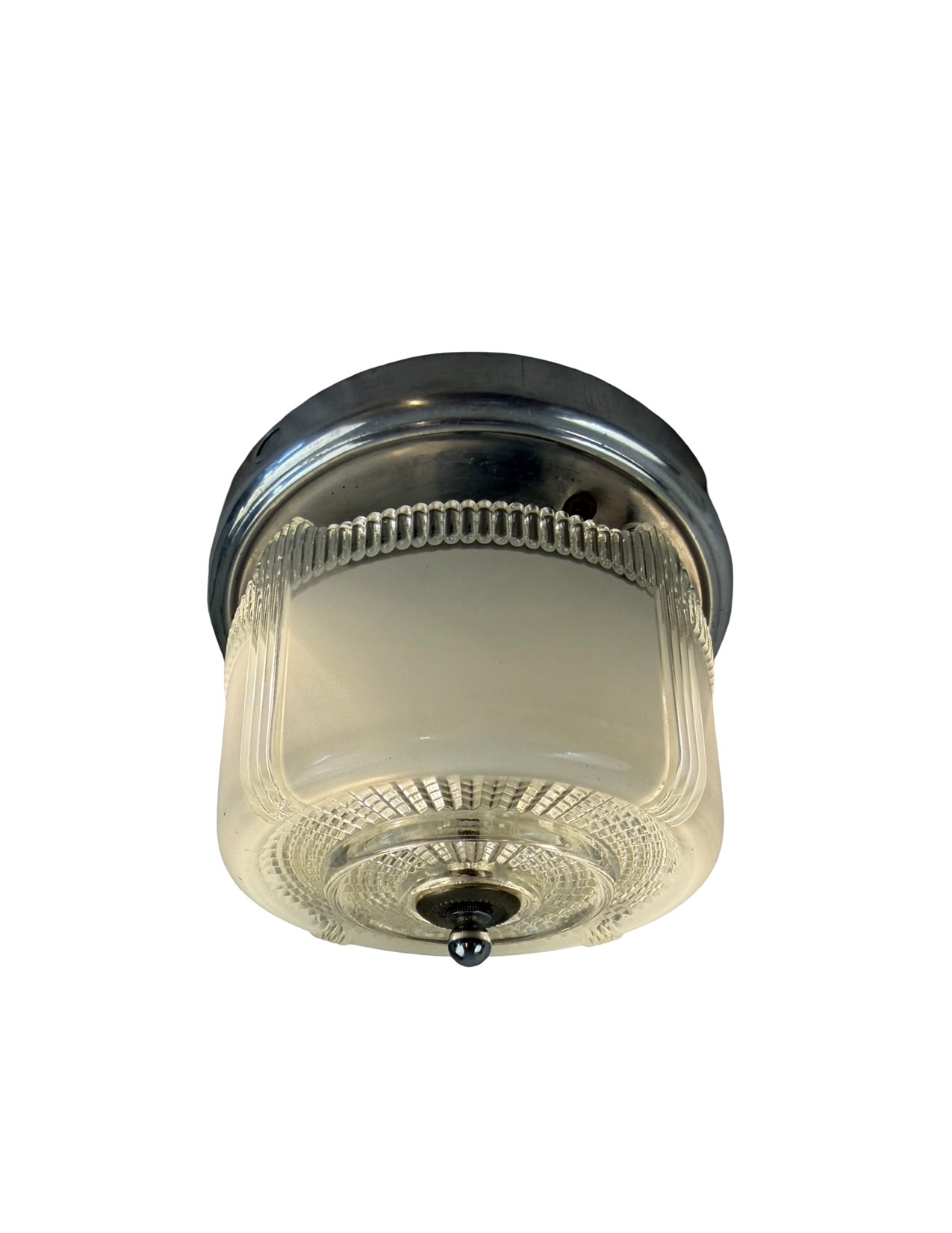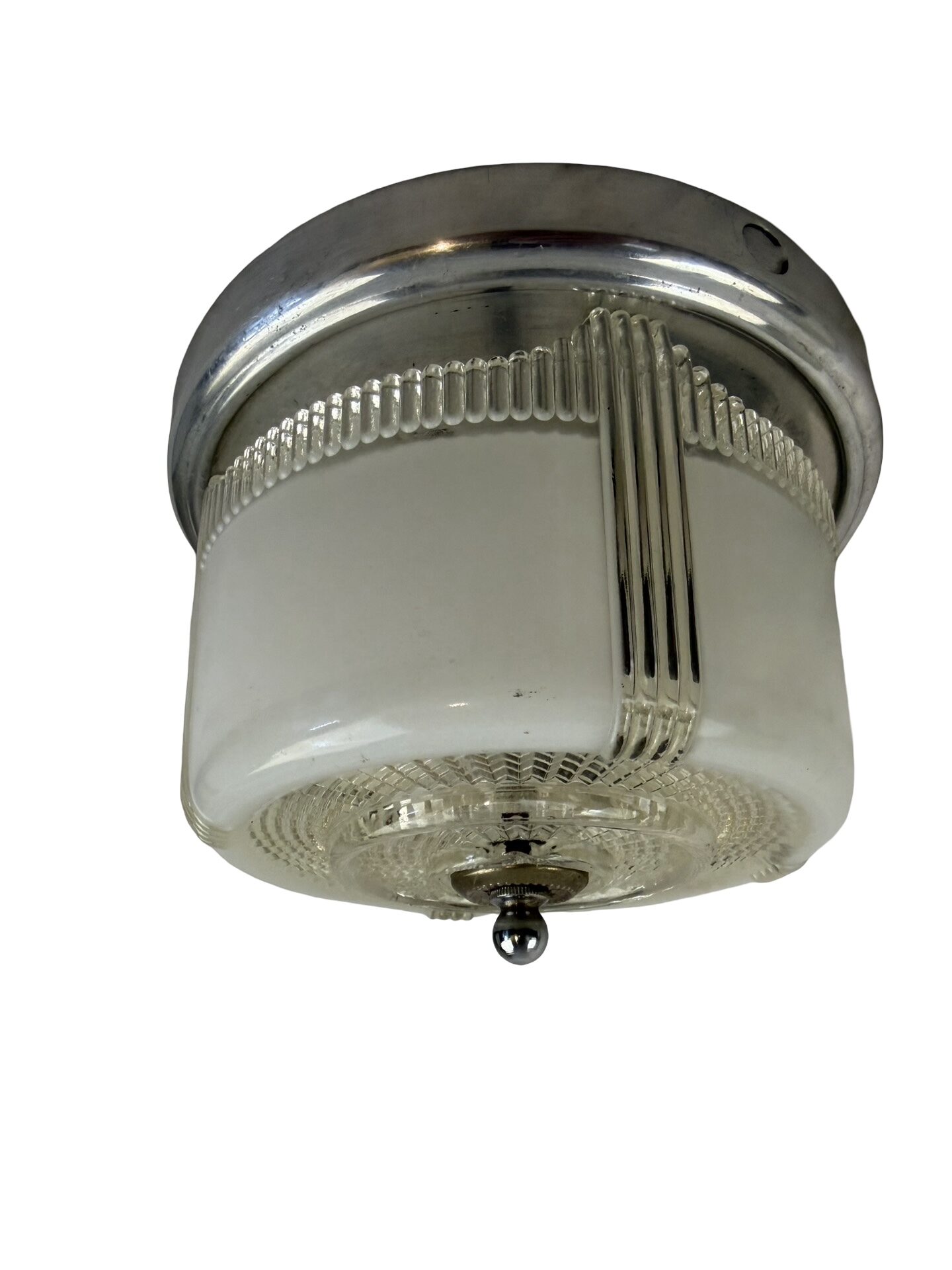 Second City Salvage is offering today this cool retro flush mount light that I believe dates to the late 1940s. The chrome frame has the original plating and is in great shape with no loss of plating, pitting or rust. The glass!! No chips, cracks or repairs and is in what I would consider to be mint condition. Overall measurement is 7″ dia. and will drop 5″ from the ceiling once installed. It takes one standard base bulb, will come to you with updated wiring and be ready to install. A lovely piece for your vintage kitchen or bath.