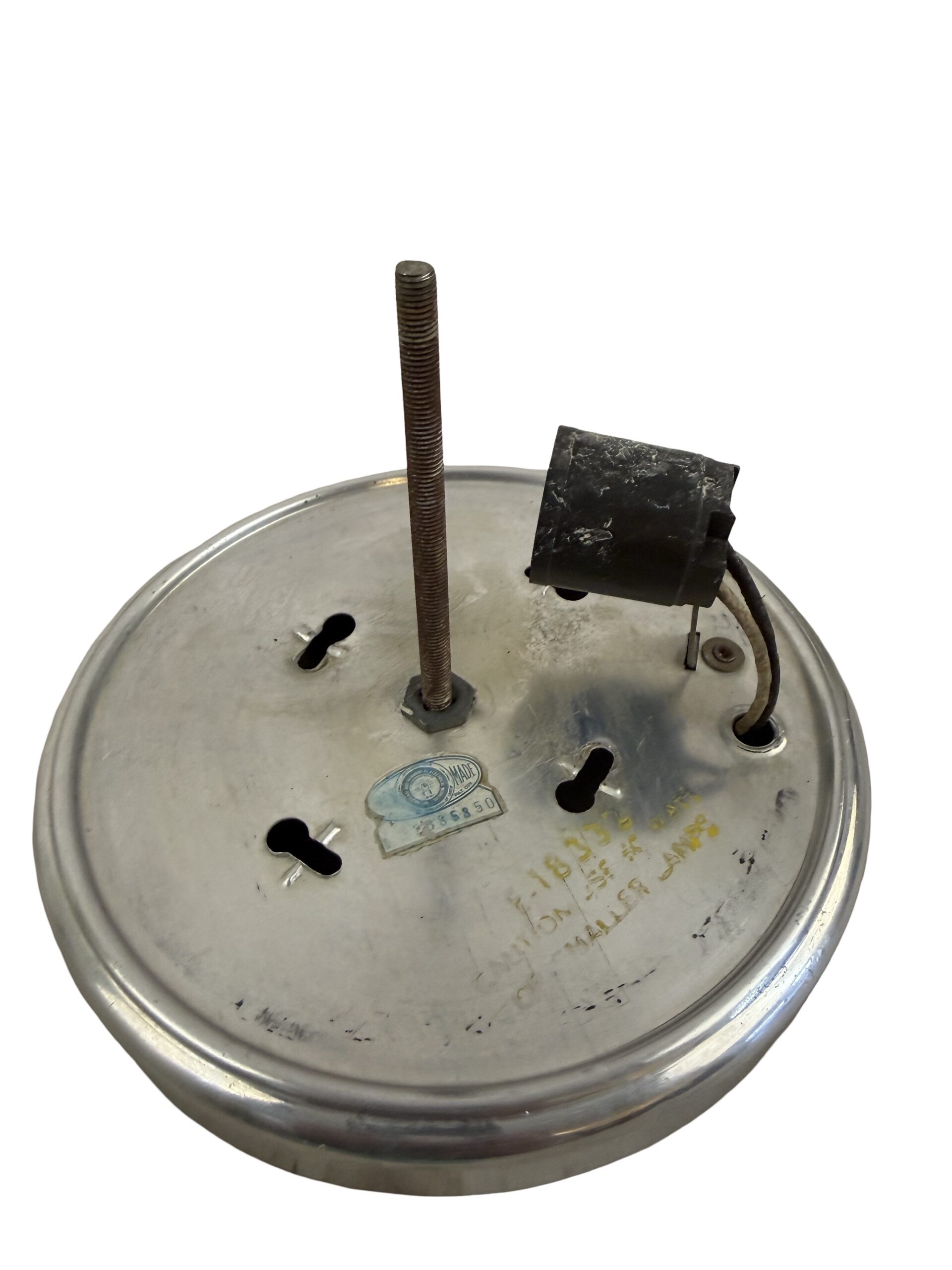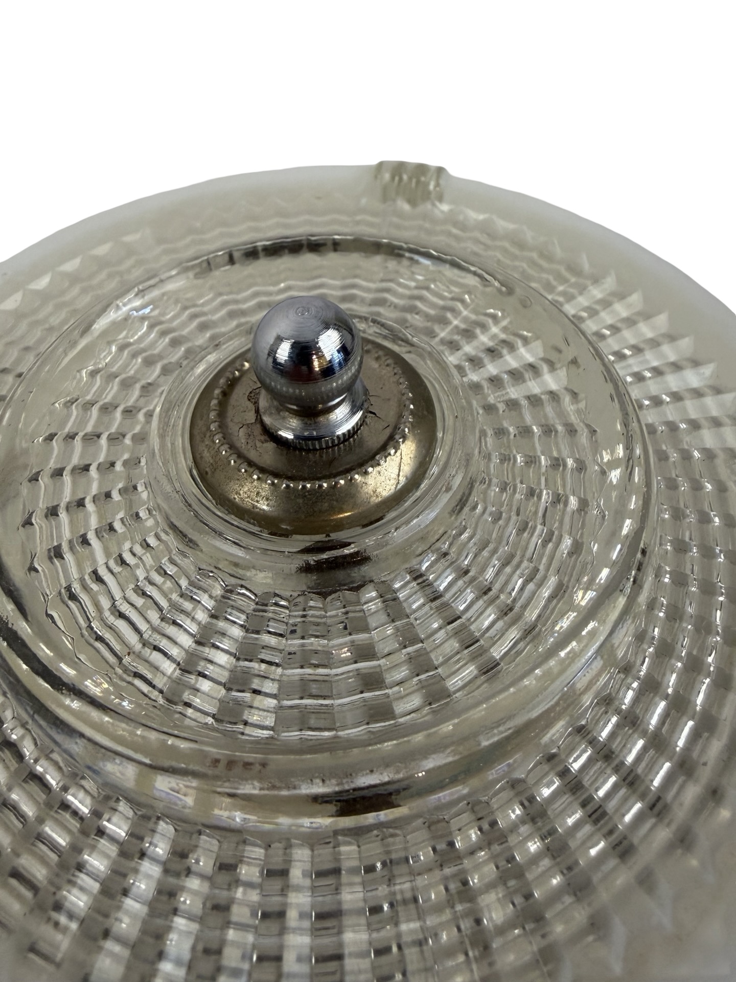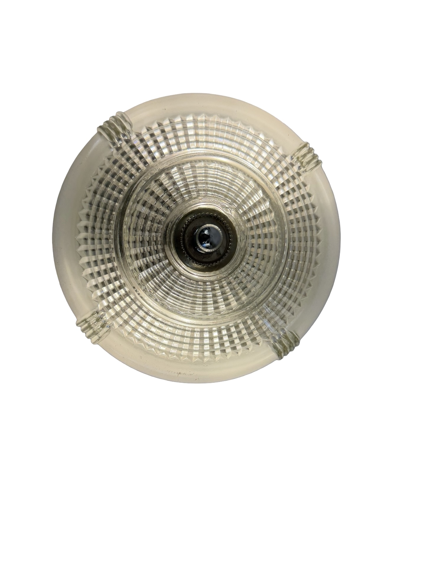 Second City Salvage is offering today this cool retro flush mount light that I believe dates to the late 1940s. The chrome frame has the original plating and is in great shape with no loss of plating, pitting or rust. The glass!! No chips, cracks or repairs and is in what I would consider to be mint condition. Overall measurement is 7″ dia. and will drop 5″ from the ceiling once installed. It takes one standard base bulb, will come to you with updated wiring and be ready to install. A lovely piece for your vintage kitchen or bath.