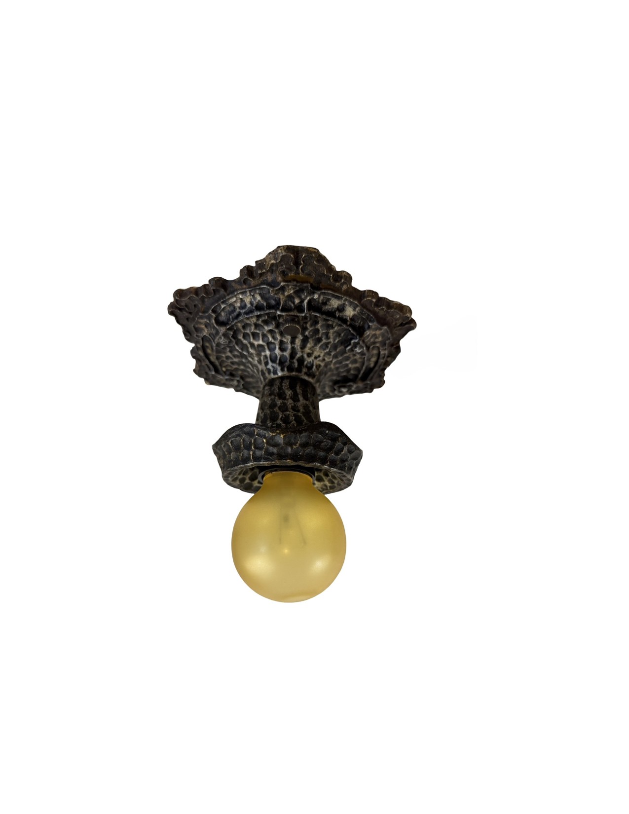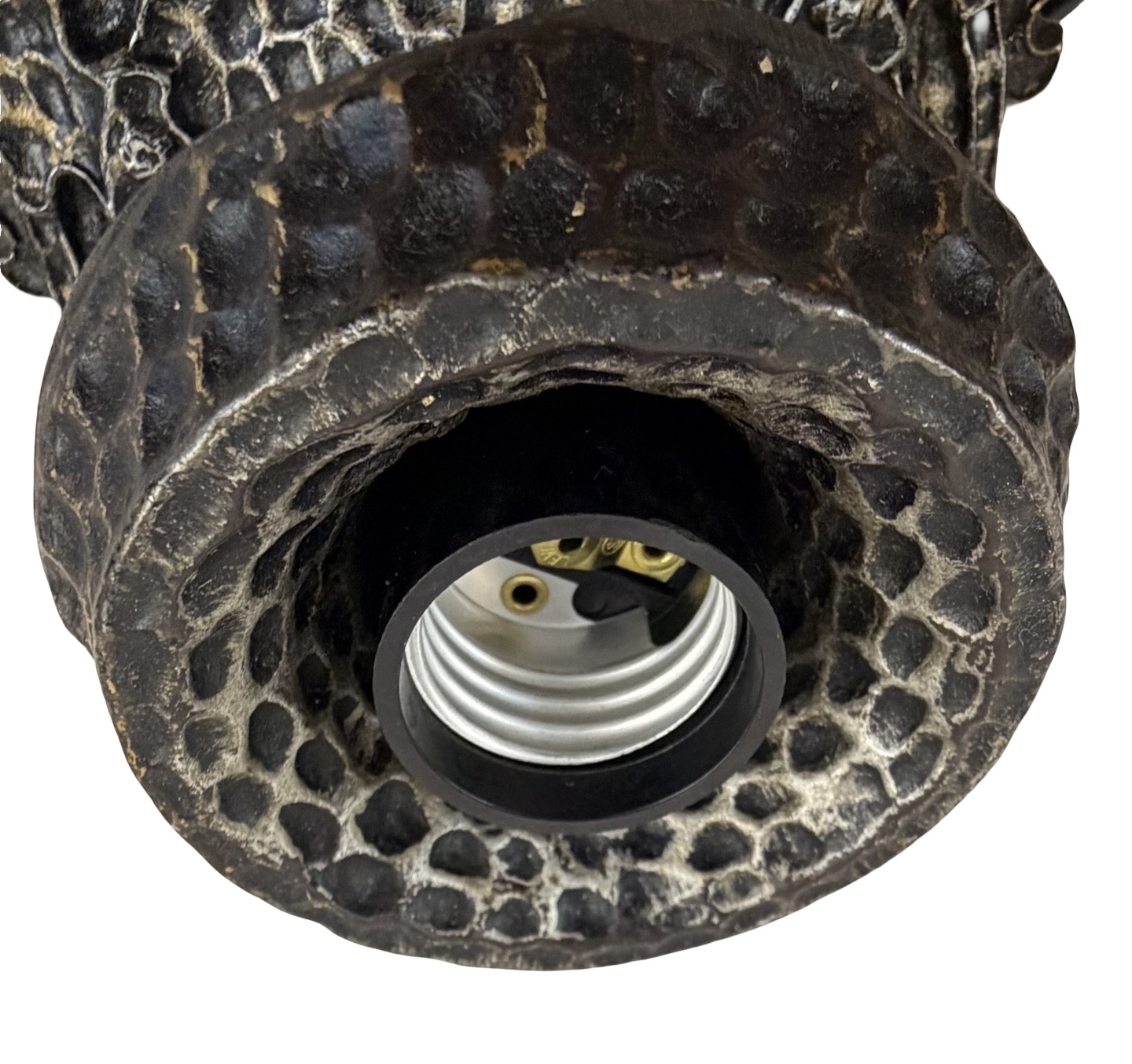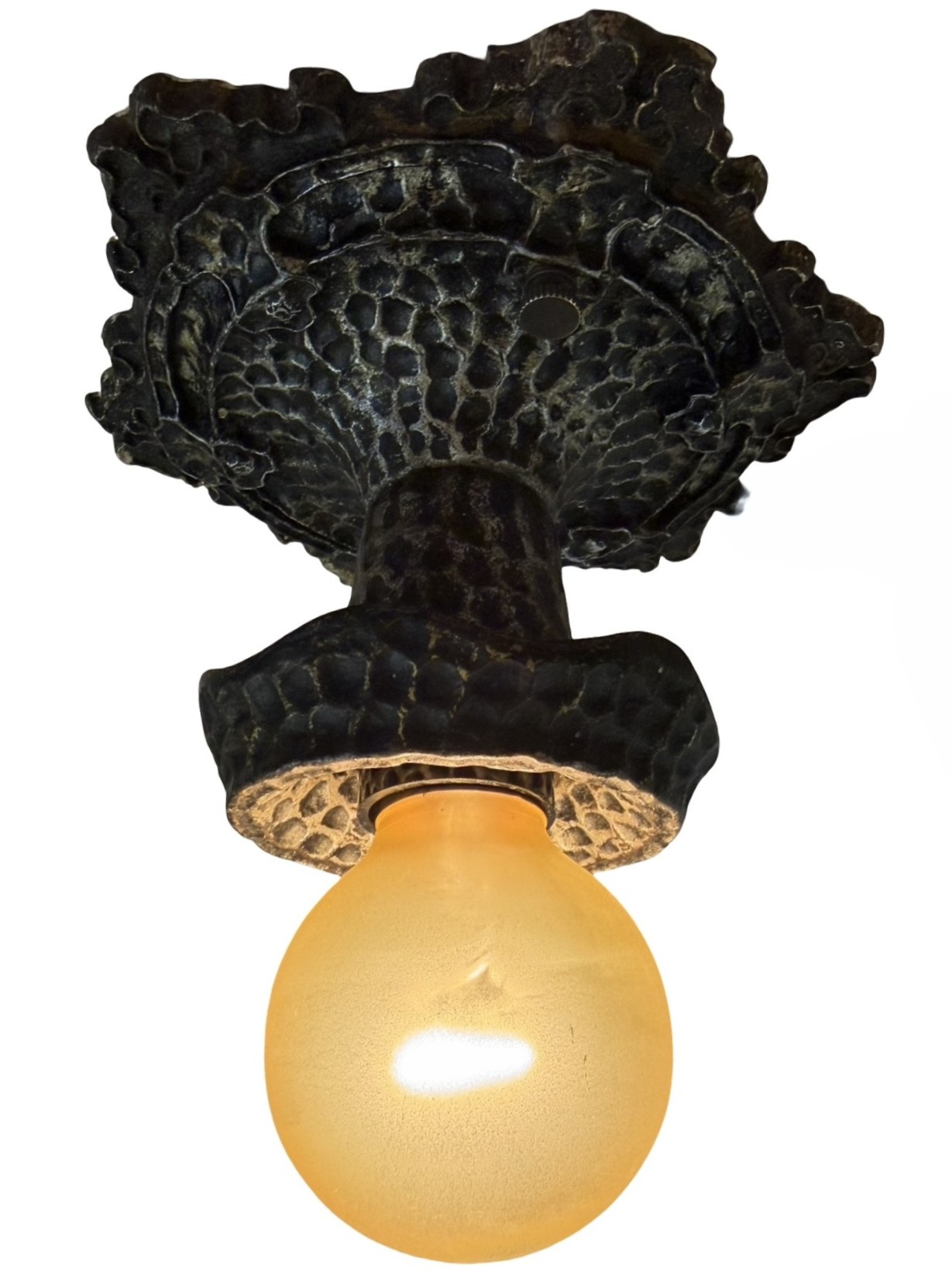Second City Salvage is offering today this old flush mount bare bulb fixture from the late 1920s that was probably made by Halcolite, but it is unmarked. It is most likely from their Plymouth line of fixtures. It is fabricated of hammered Swedish cast iron and has the original finish – the light has only been lightly cleaned. It has been restored from head to toe and will come to you with updated wiring and a modern cross bar needed for installation. It measures 6″ dia. and will drop 3″ from the ceiling once installed (add 2 ½” for the bulb shown – not included). This is one of many in a group of Halcolite lights that were salvaged from a Minneapolis residence some years ago that I will be listing. Last photo in the listing shows the light in a c1928 Halcolite catalog.