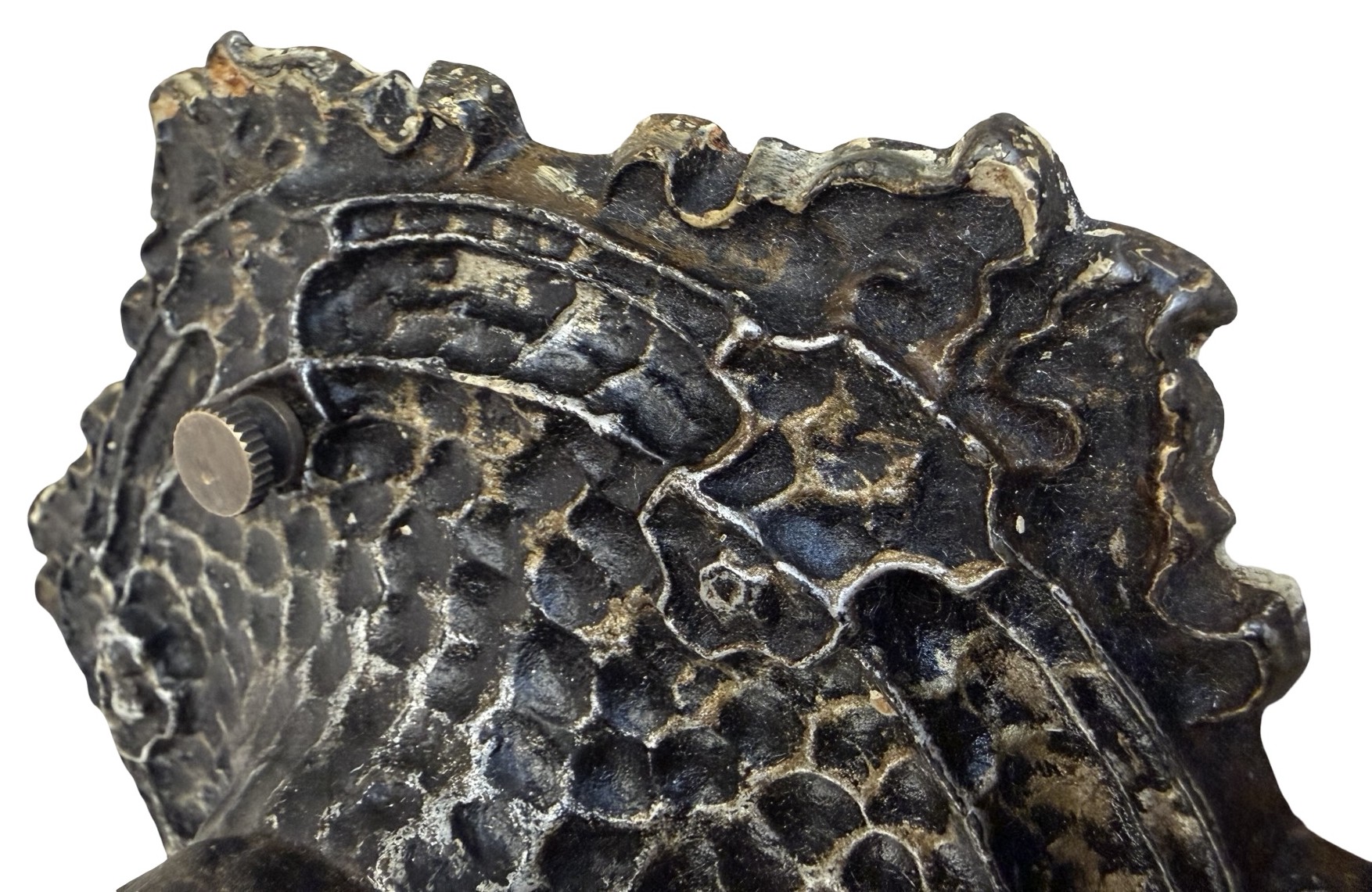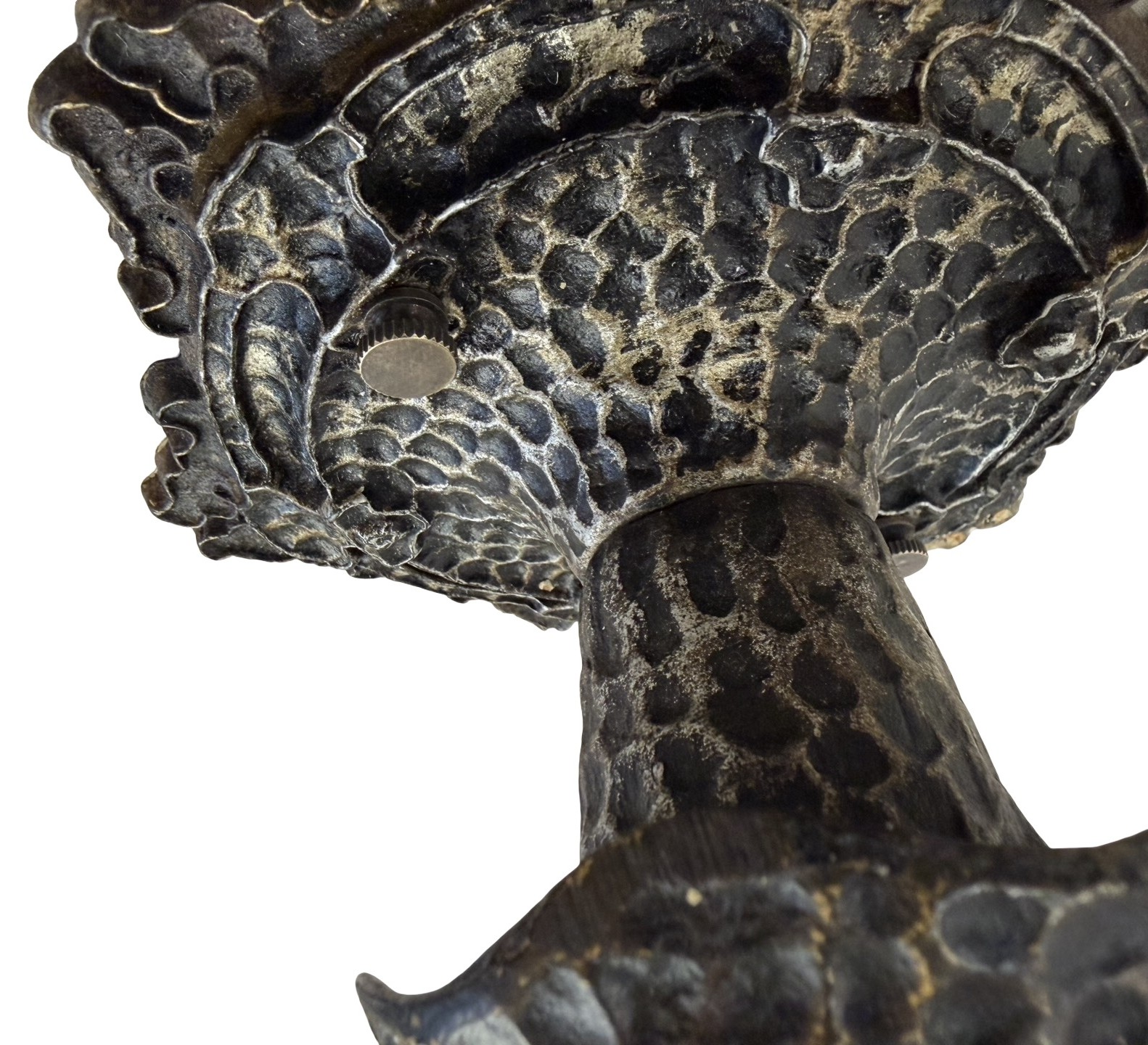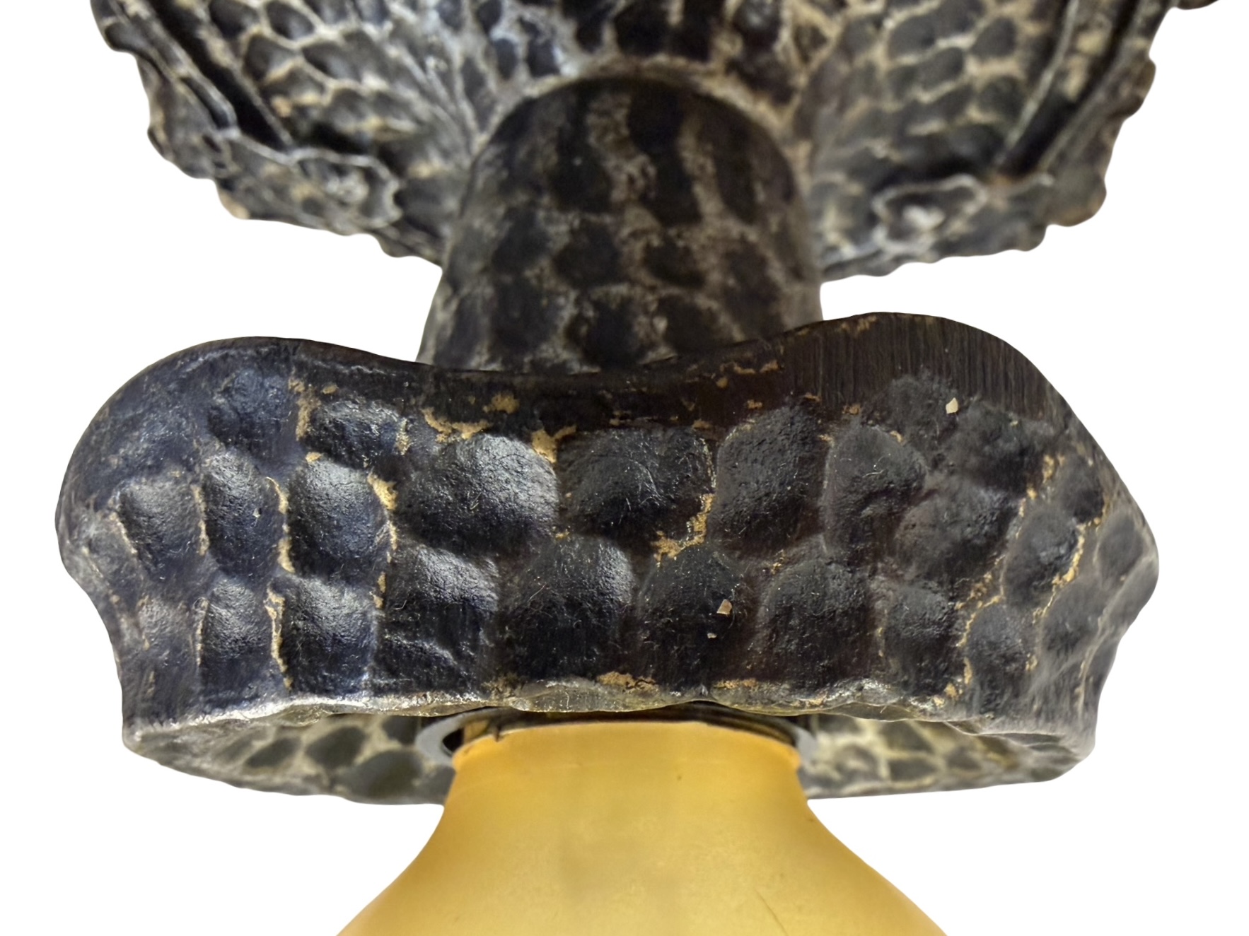 Second City Salvage is offering today this old flush mount bare bulb fixture from the late 1920s that was probably made by Halcolite, but it is unmarked. It is most likely from their Plymouth line of fixtures. It is fabricated of hammered Swedish cast iron and has the original finish – the light has only been lightly cleaned. It has been restored from head to toe and will come to you with updated wiring and a modern cross bar needed for installation. It measures 6″ dia. and will drop 3″ from the ceiling once installed (add 2 ½” for the bulb shown – not included). This is one of many in a group of Halcolite lights that were salvaged from a Minneapolis residence some years ago that I will be listing. Last photo in the listing shows the light in a c1928 Halcolite catalog.