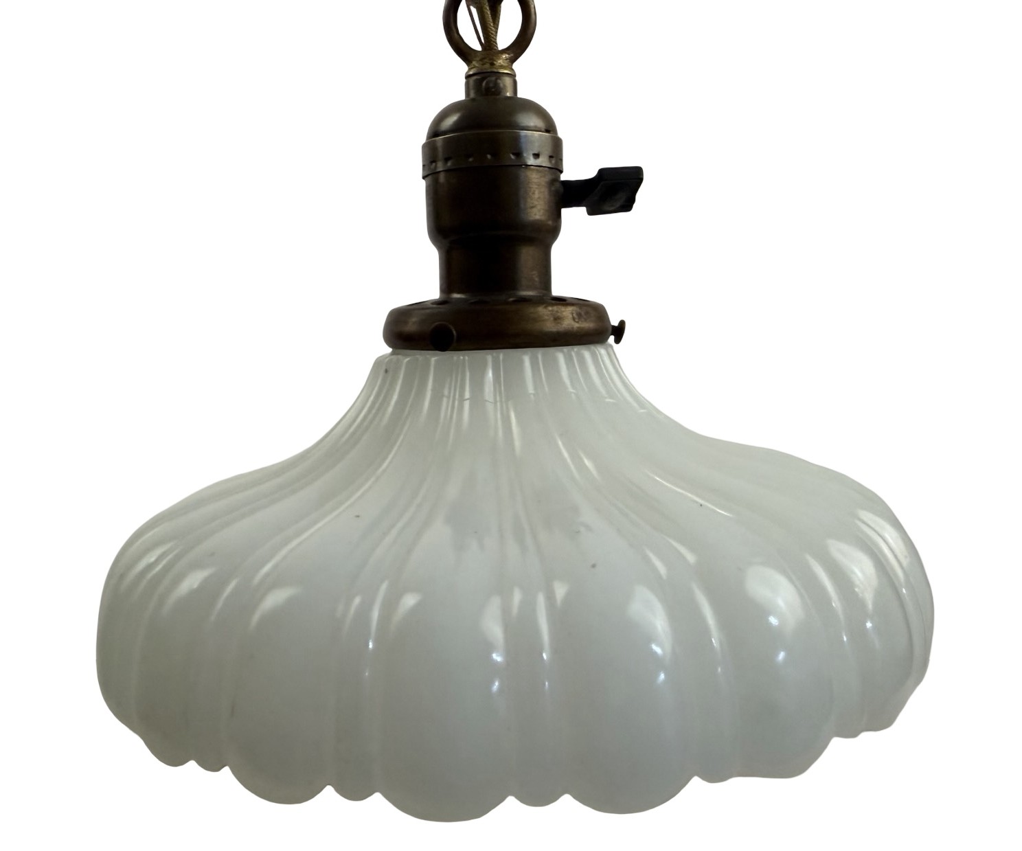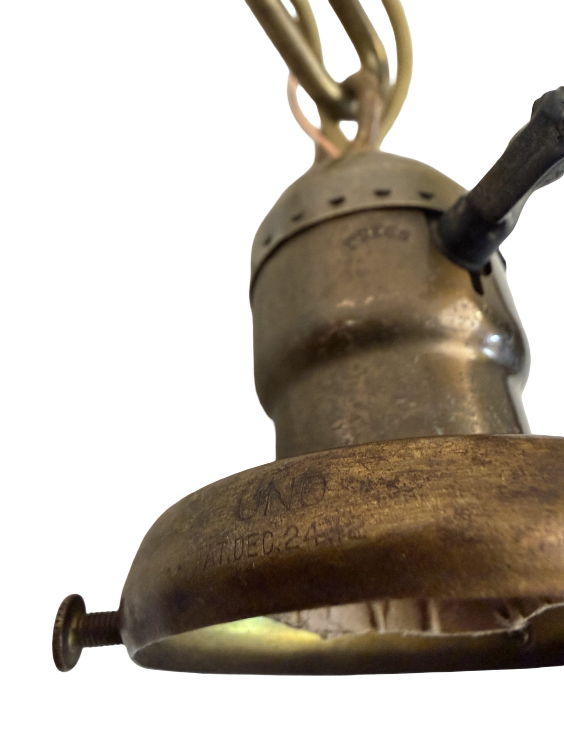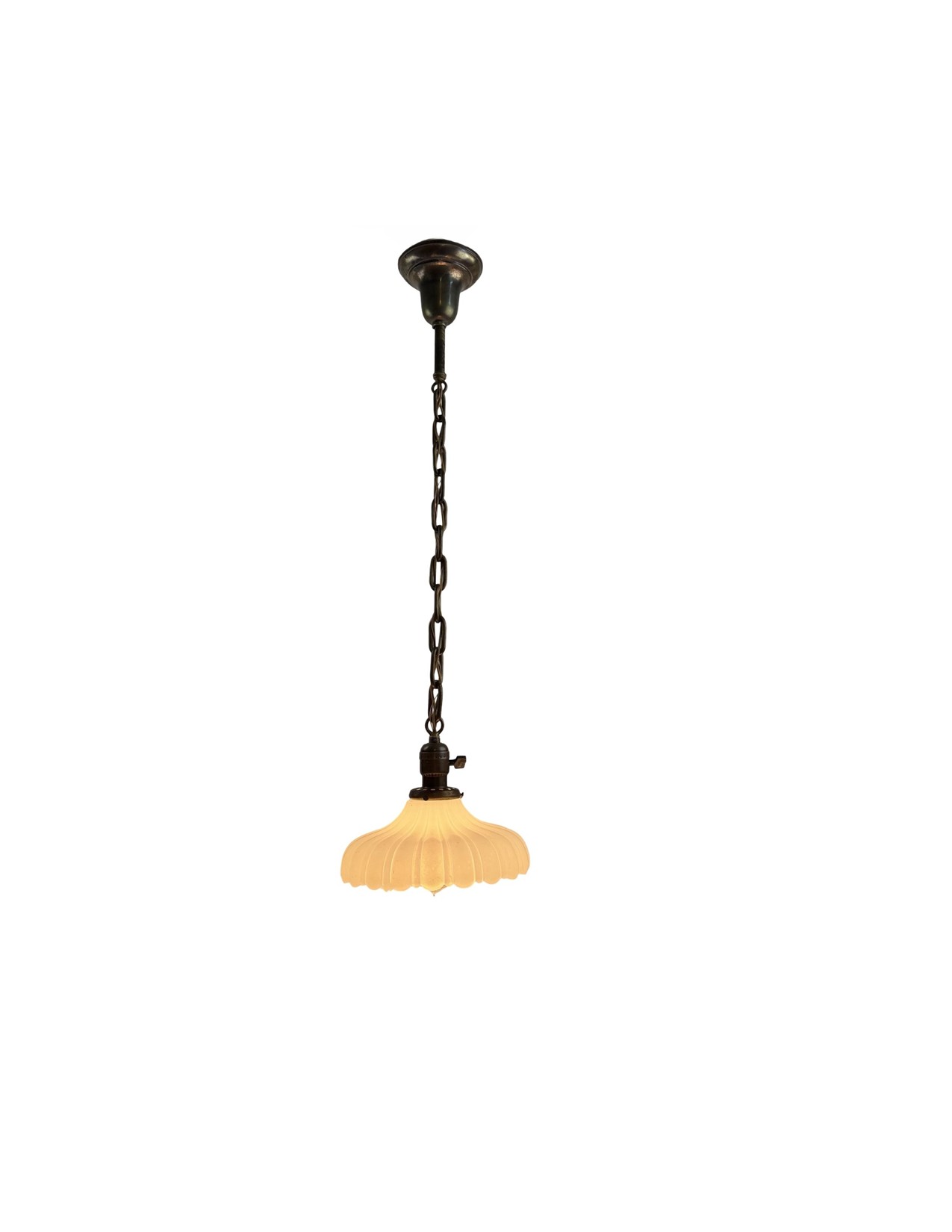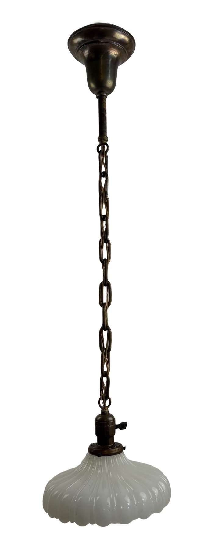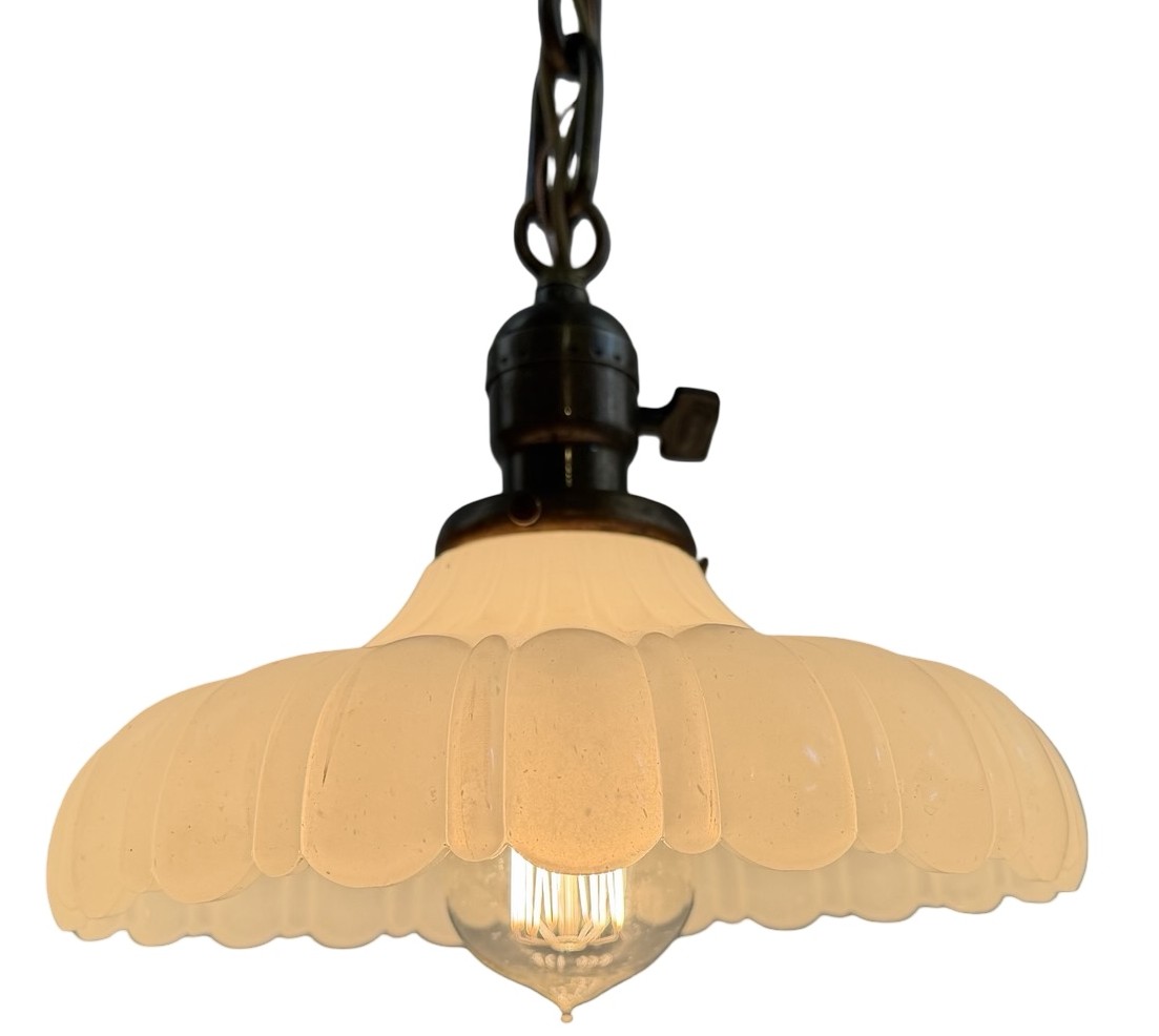 Second City Salvage is offering today this antique brass pendant c1912 that has been completely restored. It retains the original patina and has only been lightly cleaned. All components are brass so will darken naturally. It measures 9″ diameter and will drop 33″ from the ceiling once installed. The chain is 17″ (height can be adjusted) and the canopy is 5″ diameter x 4″h. The paddle switch socket is the original which has been restored. The original shade holder is marked UNO and has patent date of Dec 24 1912. The shade is clambroth glass in the Sheffield style which measures 9″ dia x 3 3/4″h and has a 2 ¼” fitter. It is in mint condition. It takes a standard base bulb, will come to you with period correct gold cloth wiring and a modern cross bar needed for install. A great old pendant will be a wonderful enhancement to any vintage setting. Pair this light with an Edison bulb (as shown, but not included) for a great vintage look!