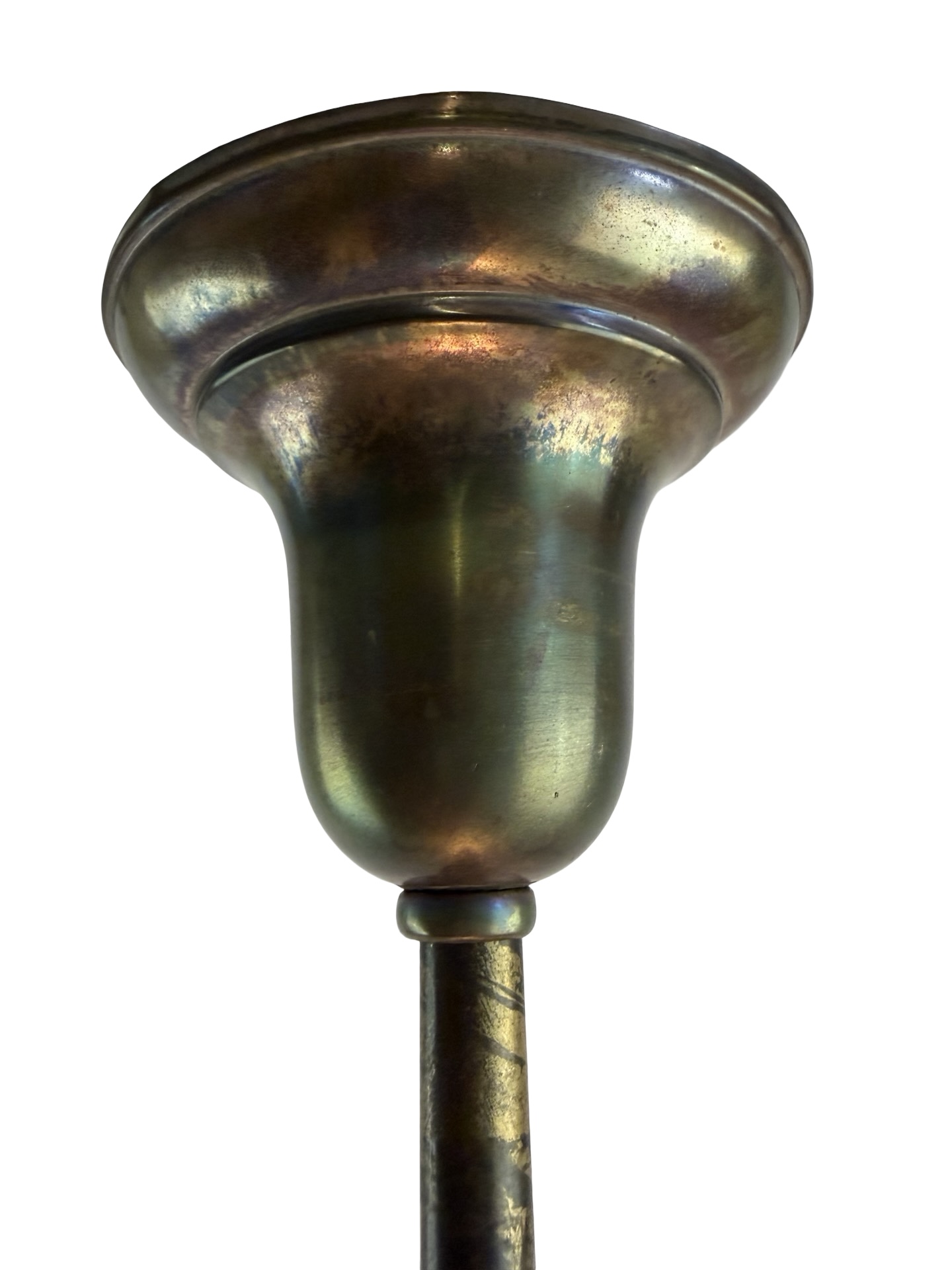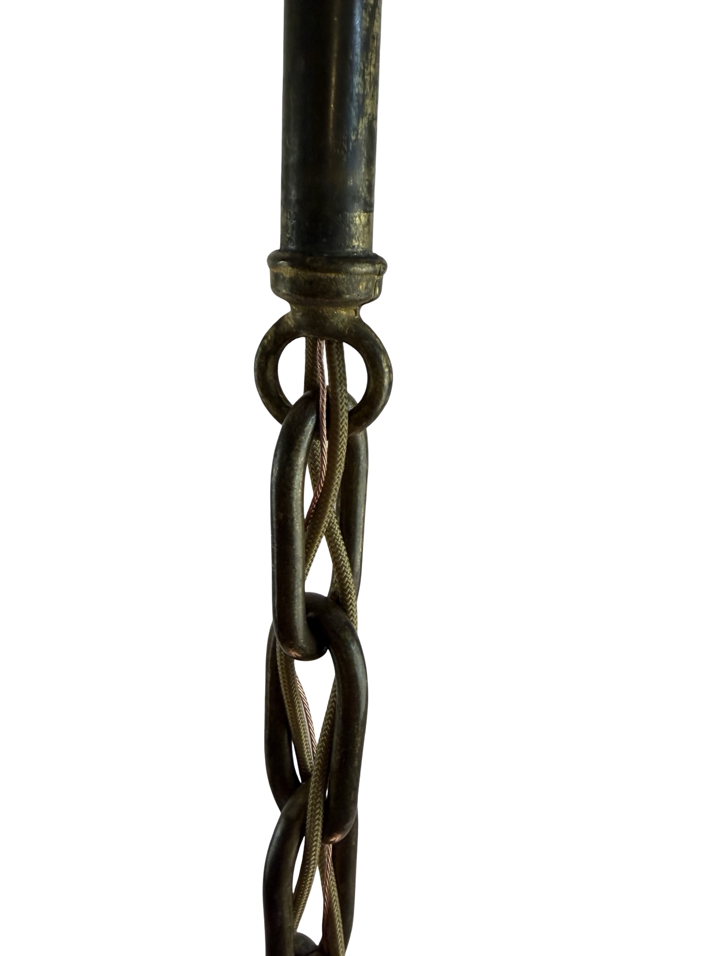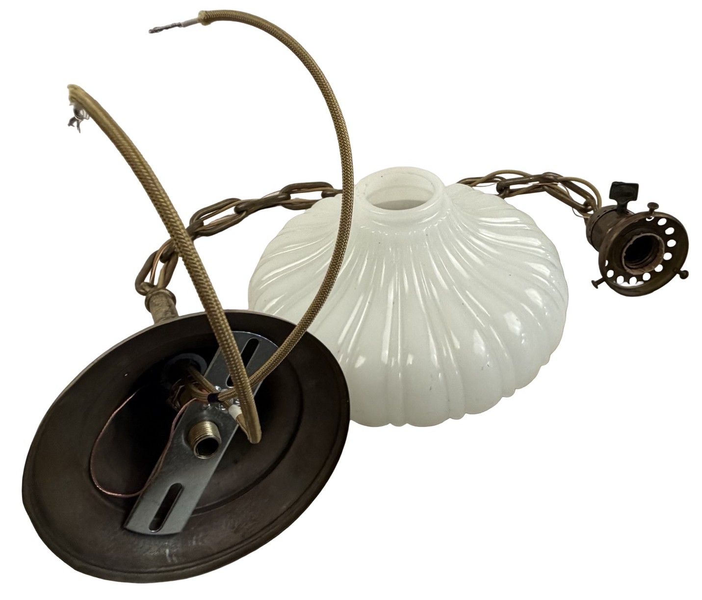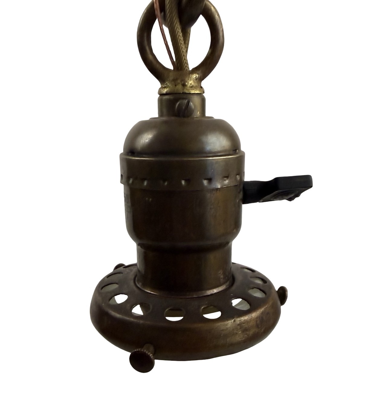 Second City Salvage is offering today this antique brass pendant c1912 that has been completely restored. It retains the original patina and has only been lightly cleaned. All components are brass so will darken naturally. It measures 9″ diameter and will drop 33″ from the ceiling once installed. The chain is 17″ (height can be adjusted) and the canopy is 5″ diameter x 4″h. The paddle switch socket is the original which has been restored. The original shade holder is marked UNO and has patent date of Dec 24 1912. The shade is clambroth glass in the Sheffield style which measures 9″ dia x 3 3/4″h and has a 2 ¼” fitter. It is in mint condition. It takes a standard base bulb, will come to you with period correct gold cloth wiring and a modern cross bar needed for install. A great old pendant will be a wonderful enhancement to any vintage setting. Pair this light with an Edison bulb (as shown, but not included) for a great vintage look!