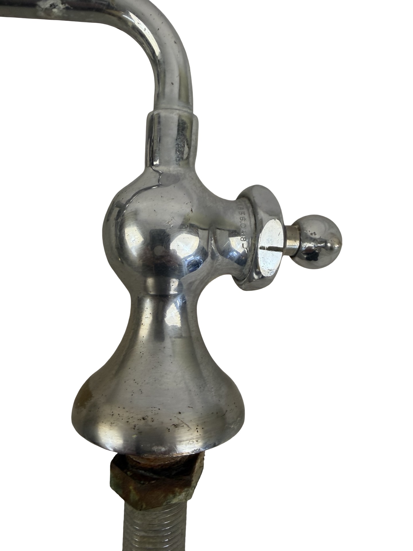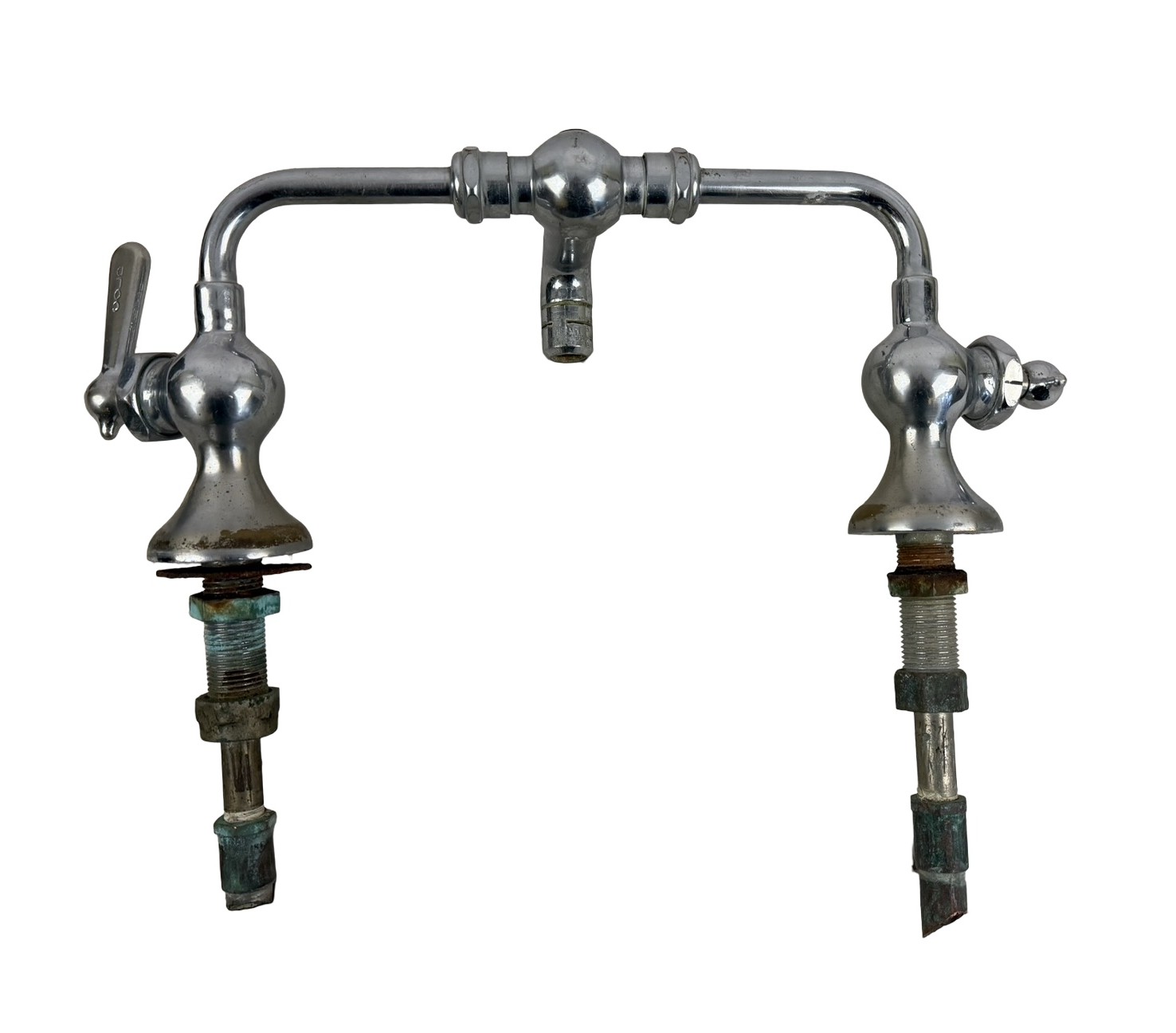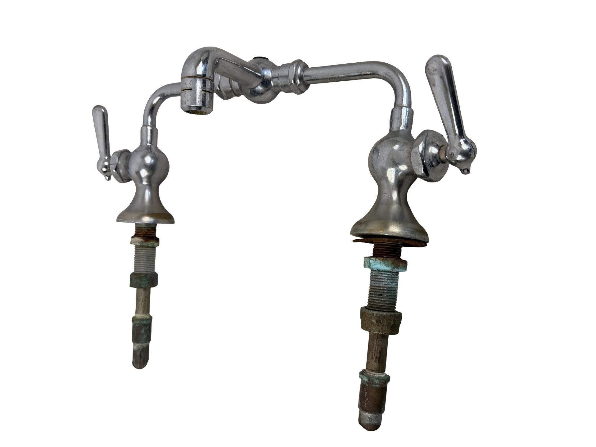 Second City Salvage is offering today this antique nickel plated brass bridge faucet in very good original condition. It has not been tested, but was functional when it was removed from the Minneapolis residence it was original to. Seems to be in working order, but probably needs some adjustments. It measures 14″w x 5 1/2″h from the surface once installed and the faucet projects 4 1/2″ from the center “bridge”. Nickel plating is in very nice original condition with only a few wrench marks and nicks here and there and a slight bit of loss to the plating around the escutcheons. It is marked “CHI FAUC” which tells me it was manufactured by Chicago Faucet. It is being sold as is/as shown.